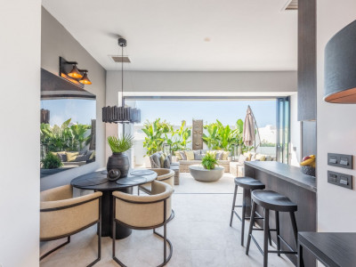 Town House, Marbella Golden Mile – Luxury beach bungalow in Marbella Golden Mile, this emblematic beachfront community on the Golden Mile of Marbella. This house has all the living accomodation on the ground level together with a large private terrace with direct access from the living room plus another terrace upstairs with wonderful sea views. The house has just been completely refurbished using only the best quality materials resulting in a very stylish and elegant finish. A mediterranean exterior with a scandinavian feel in the interior! It is the perfect residence for someone who demands quality living in an A1 location. This beach front bungalow style townhouse is literally a few steps from the sea. A residential area on the Golden Mile that has a privileged location on the seafront and has a great beach club within the community. This complex is very close to all the services and leisure areas of the Golden Mile and has direct private access on to the beach and the promenade from where we can take a pleasant walk until we reach Puerto Banús to one side and Marbella towards the other side passing by the Puente Romano and Marbella Club Grand Luxury Hotels and their respective well-known restaurants.