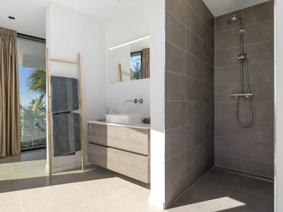Villa, La Alqueria – Is a newly built contemporary villa situated in the prestigious urbanization of Benahavís. Positioned frontline golf and facing east to south, the property offers panoramic views of the Mediterranean Sea, the coastline, and the iconic La Concha mountain. Set on a 1,195 m² plot, the villa has a total built area of 407 m², complemented by approximately 90 m² of both covered and open terraces. The residence features five bedrooms, each with en-suite bathrooms, and is designed to combine modern comfort with elegant style. The main floor includes an entrance hallway leading to a spacious living area with high ceilings and a fireplace. Adjacent is a dining area, also with a fireplace, and an open-plan, fully fitted kitchen equipped with Blum cabinetry and appliances by Miele and Bora. This level also includes a guest toilet, laundry area, and two guest bedrooms. Direct access from the main living areas leads to the terraces, landscaped garden, and a private 56 m² swimming pool. Upstairs, the master suite includes a dressing area and a versatile adjoining room, ideal for use as an office, gym, or additional bedroom. Two further guest bedrooms with en-suite bathrooms are also located on this level. All rooms on the upper floor open to terraces with uninterrupted views. A garage with space for one car is also included. One of the terraces provides access to the rooftop, where solar panels are installed. Additional features include an Airzone climate control system for individual room regulation, underfloor heating throughout, a domotic (home automation) system, and high-quality furnishings, which are included in the sale.