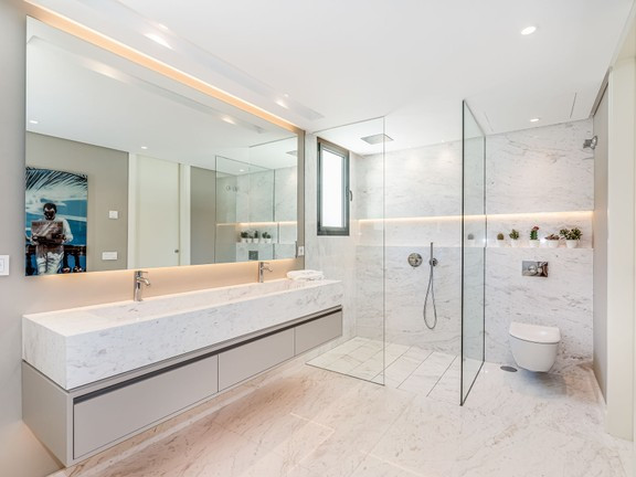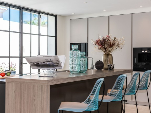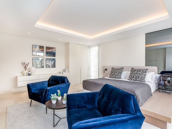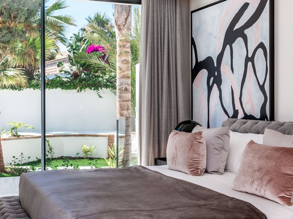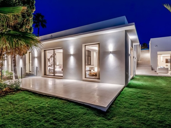 Villa, Marbesa – The impressive Villa is situated close to the beach on a spectacular plot of 2.519 m2 in one of the trendiest beach areas in Marbella, Marbesa. It is a tailor-made home designed and customized to provide a the Marbella luxury living style. This newly built Villa is on one level and enjoys a picturesque manicured garden with several outdoor sitting areas, a pool bar and a large swimming pool as well as several water features. It offers an impressive entrance hall, a stylish living room with a modern fireplace and a separate dining room and offers 5 luxury en-suite bedrooms with a unique design. Two of them have also a separate sitting area and separate dressing area with open views to the gardens. The open plan kitchen with an elegant large island and a separate breakfast patio is equipped with State of the Art Gaggenau appliances, including a large wine-cooler and a built-in coffee machine. Extra features: separate SPA house with gym, sauna and shower which can be converted into a separate guest house if needed, a large solarium with panoramic sea views, indoor garage for 2 cars and a Hobby room.