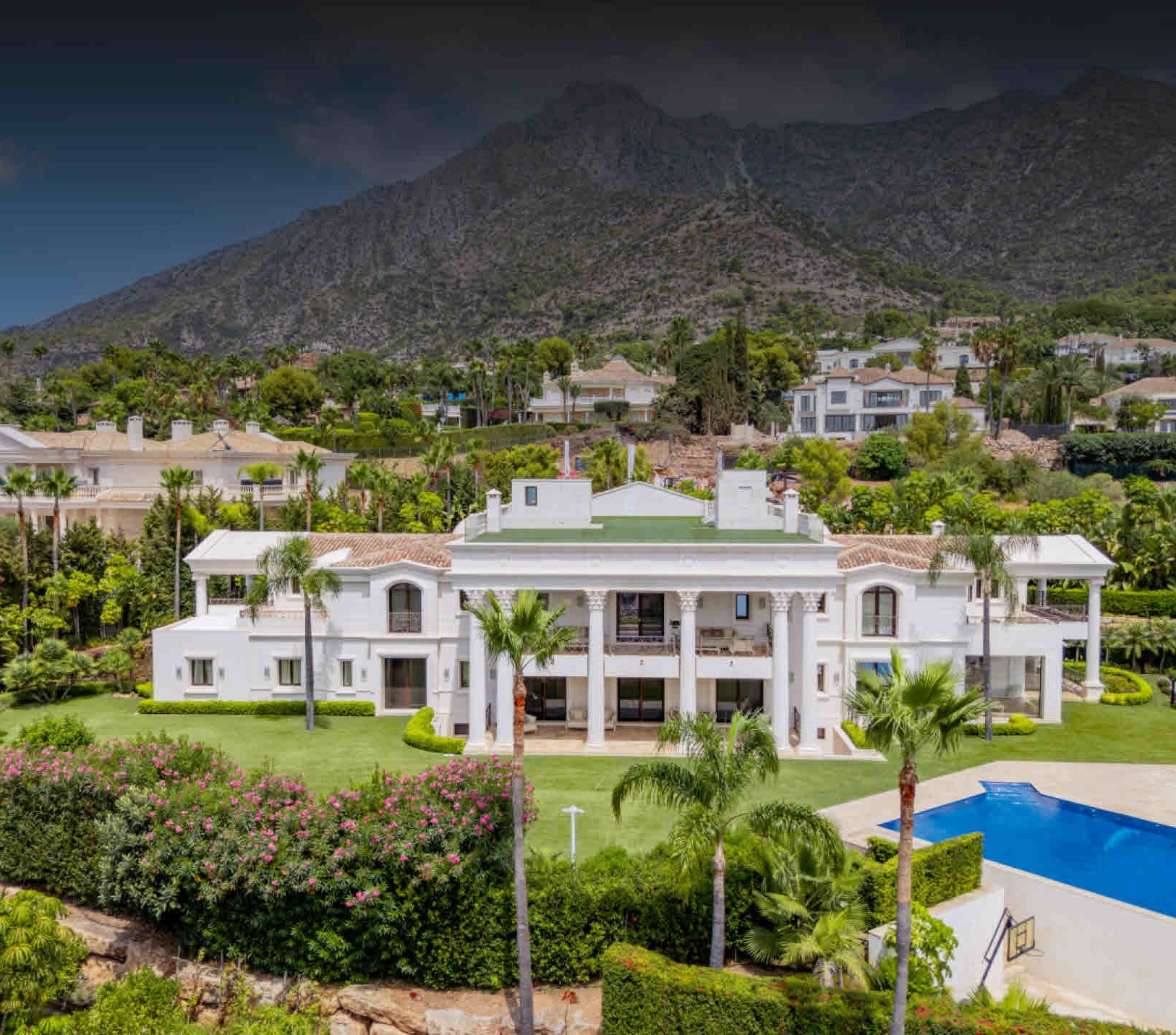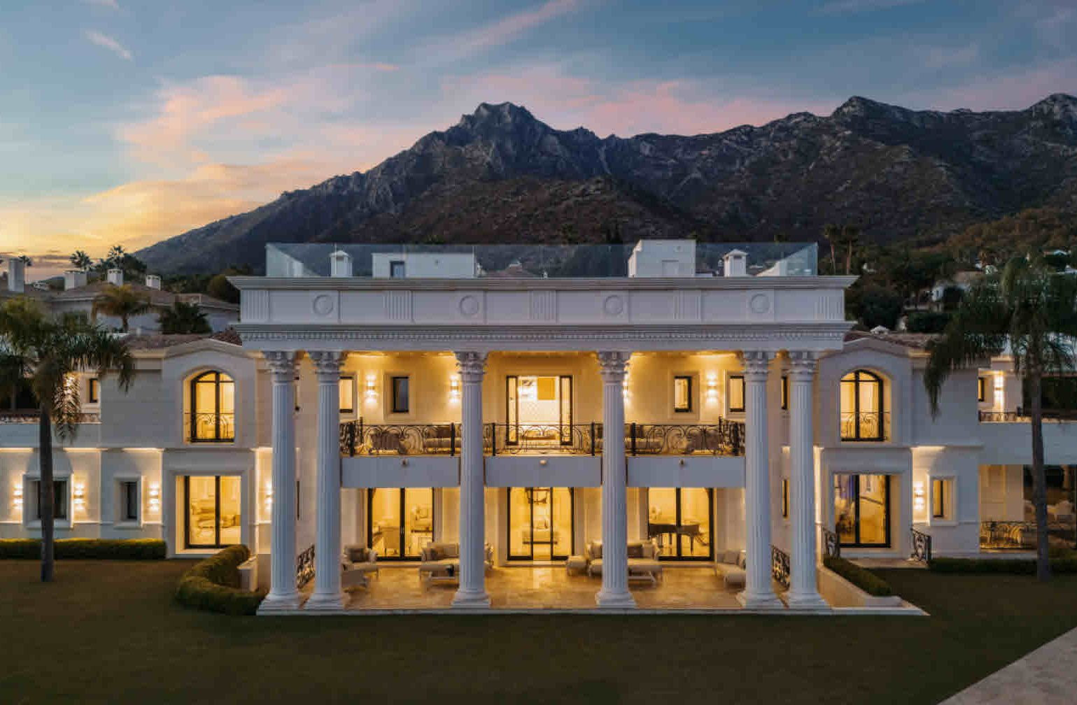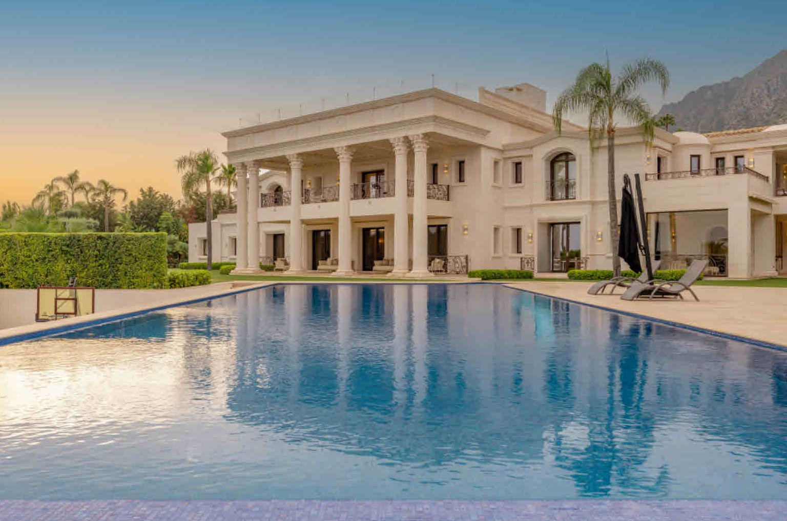 Villa, Sierra Blanca – An exceptional palatial estate currently on the market and an unparalleled investment opportunity located in the prestigious, within Marbella’s renowned Golden Mile. Designed by acclaimed Spanish architect Jesús del Valle Cardenete, this estate won the 2017 Premios Maceal Award for Best International Villa. This luxurious mansion embodies classic style and timeless elegance, situated in one of Marbella’s most coveted areas, the upper part of the famous Golden Mile, with a southern orientation that offers breathtaking views of the Mediterranean Sea and the iconic La Concha Mountain. Set on a spacious, well-distributed plot of 5,850 m², this four-level mansion spans 2,442 m², featuring 10 bedrooms and 13 bathrooms (9 en suite). The grand neoclassical entrance, with Corinthian columns, opens into a magnificent hallway with a sweeping double staircase and elevator access to all floors. The ground floor includes a lounge area with two open fireplaces, a dining room, a main fully fitted kitchen with a central island, a staff kitchen, an office, a storeroom, two guest toilets, a games room with a bar, a TV room, and three guest bedrooms with en suite bathrooms. The living and dining areas extend onto covered terraces (totaling 836 m²) and a large BBQ area, ideal for al fresco dining and entertaining. The beautifully landscaped gardens boast an impressive infinity pool, sunbathing areas, water features, and expansive lawns. The opulent Master suite features ‘his’ and ‘hers’ bathrooms and dressing rooms, a lounge area, and a superb terrace with stunning sea views. Additionally, there are four family bedrooms, each with en-suite bathrooms, dressing rooms, lounge areas, and private terraces. The basement level includes a garage for eight cars, a cinema room with 11 seats, a wine cellar, and a spa area with a heated swimming pool, Jacuzzi, sauna, steam bath, fitness room, massage room, bathroom, and two showers. The staff quarters are also located in the basement, consisting of two separate one-bedroom apartments, a dining area, a laundry room, and the technical house. The architect’s focus on lighting, both direct and indirect, enhances the sense of space, complemented by impressively high ceilings throughout. This high-end mansion, in excellent condition, is equipped with numerous luxurious features, including a Smart Home system, underfloor heating throughout, double-glazing, an alarm system, air conditioning, and fitted wardrobes.