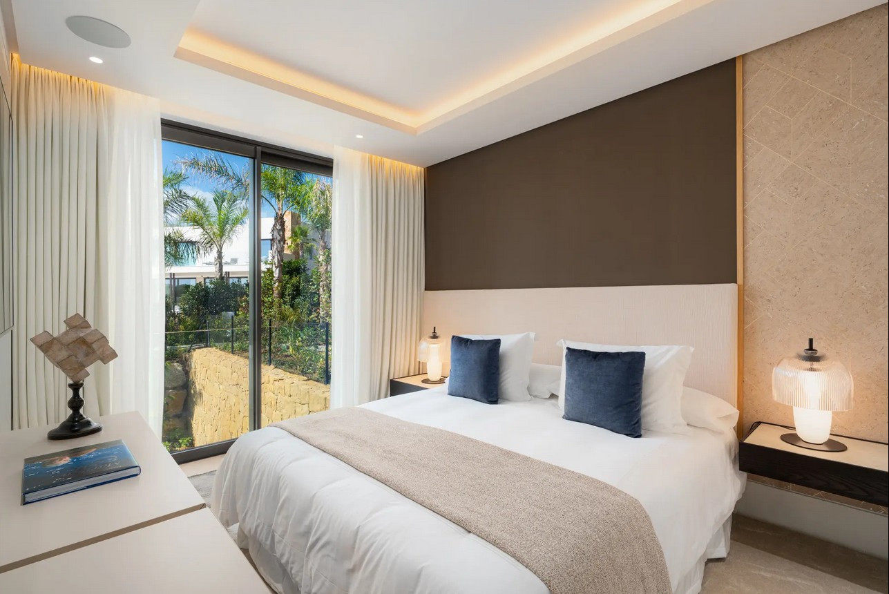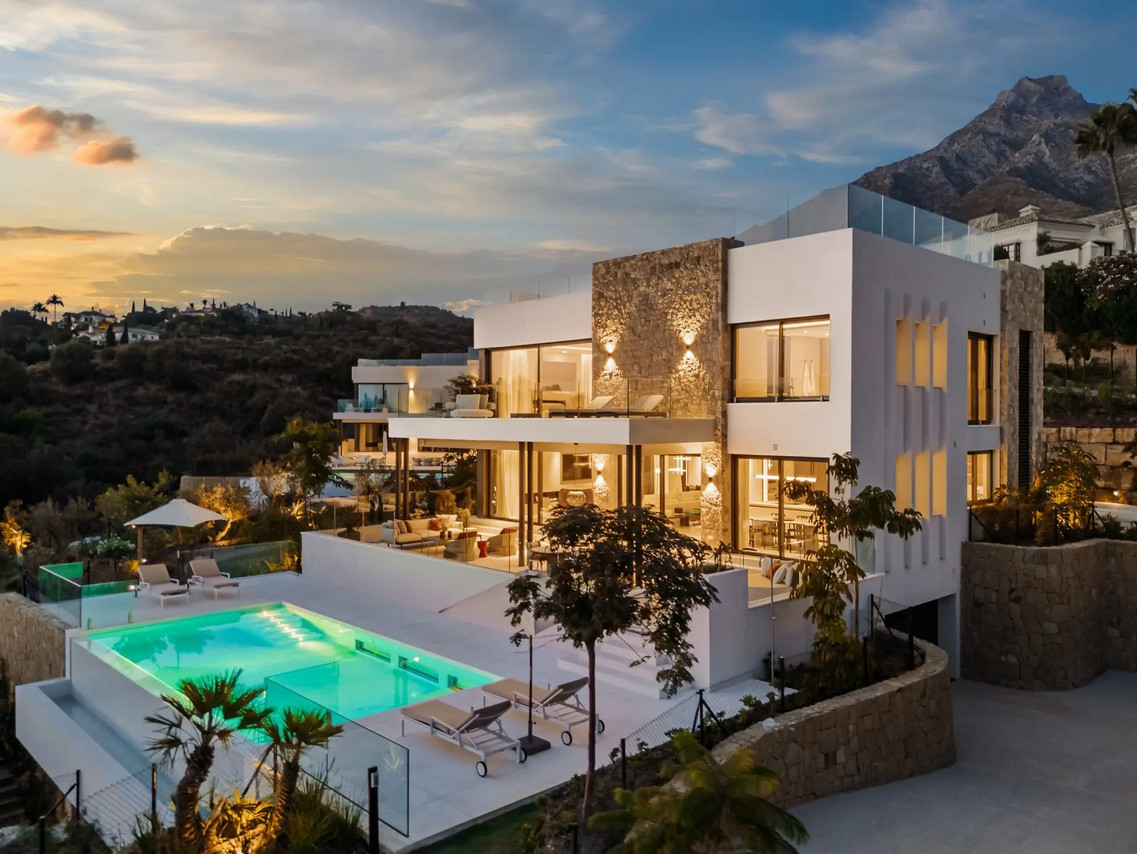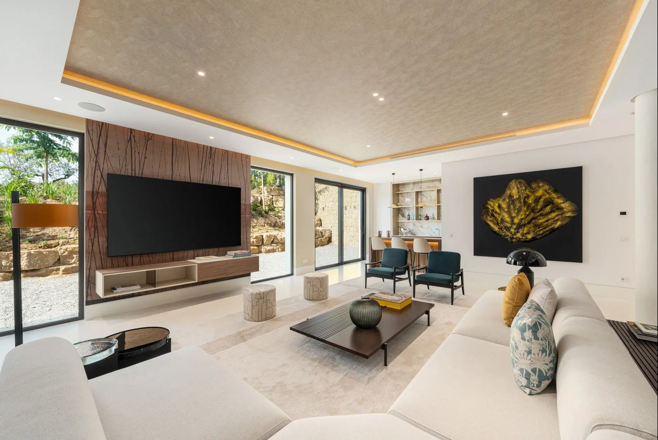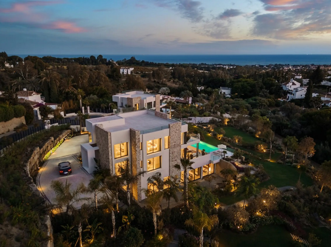 Villa, Marbella Hill Club – Designed by Villaroel and constructed by B Solis, this three-level villa exemplifies modern elegance with precise craftsmanship and refined architectural balance. Set on an expansive plot surrounded by lush landscaping by Esspora, the home captures both privacy and open views, blending natural stone and glass with sleek geometric lines. The lower level is designed for leisure and wellness. It features a fully equipped guest bedroom, laundry area, an entertainment lounge with a bespoke bar, a complete spa with an indoor heated pool and sauna, and a dedicated home gym. This floor also includes a custom machine room by Proinsermant, underscoring the villa’s technical sophistication and attention to operational excellence. On the main level, the open-plan layout connects the living, dining, and kitchen areas seamlessly. The space flows onto a large terrace that overlooks the gardens and pool, ideal for outdoor dining and relaxation. A fully functional dirty kitchen supports the main culinary area, and two guest bedrooms with en-suite bathrooms ensure convenience and comfort for visitors. Every detail reflects the refined interior design concept by Pedro Peña, featuring curated furniture, materials, and textures complemented by exclusive art pieces throughout the home. The upper floor is dedicated to private living, hosting the master suite with a walk-in closet, luxurious bathroom, and direct terrace access with panoramic views. An additional guest suite and a tranquil home office complete this level, all connected by an elevator servicing each floor. Represents an exceptional standard of living—where architectural mastery, design precision, and natural beauty converge in one of Marbella’s most sought-after addresses.