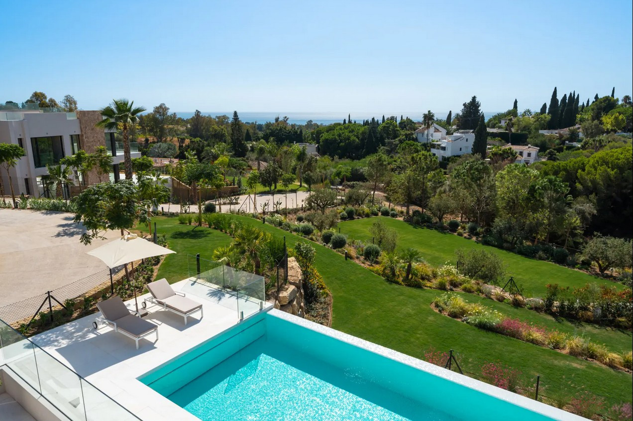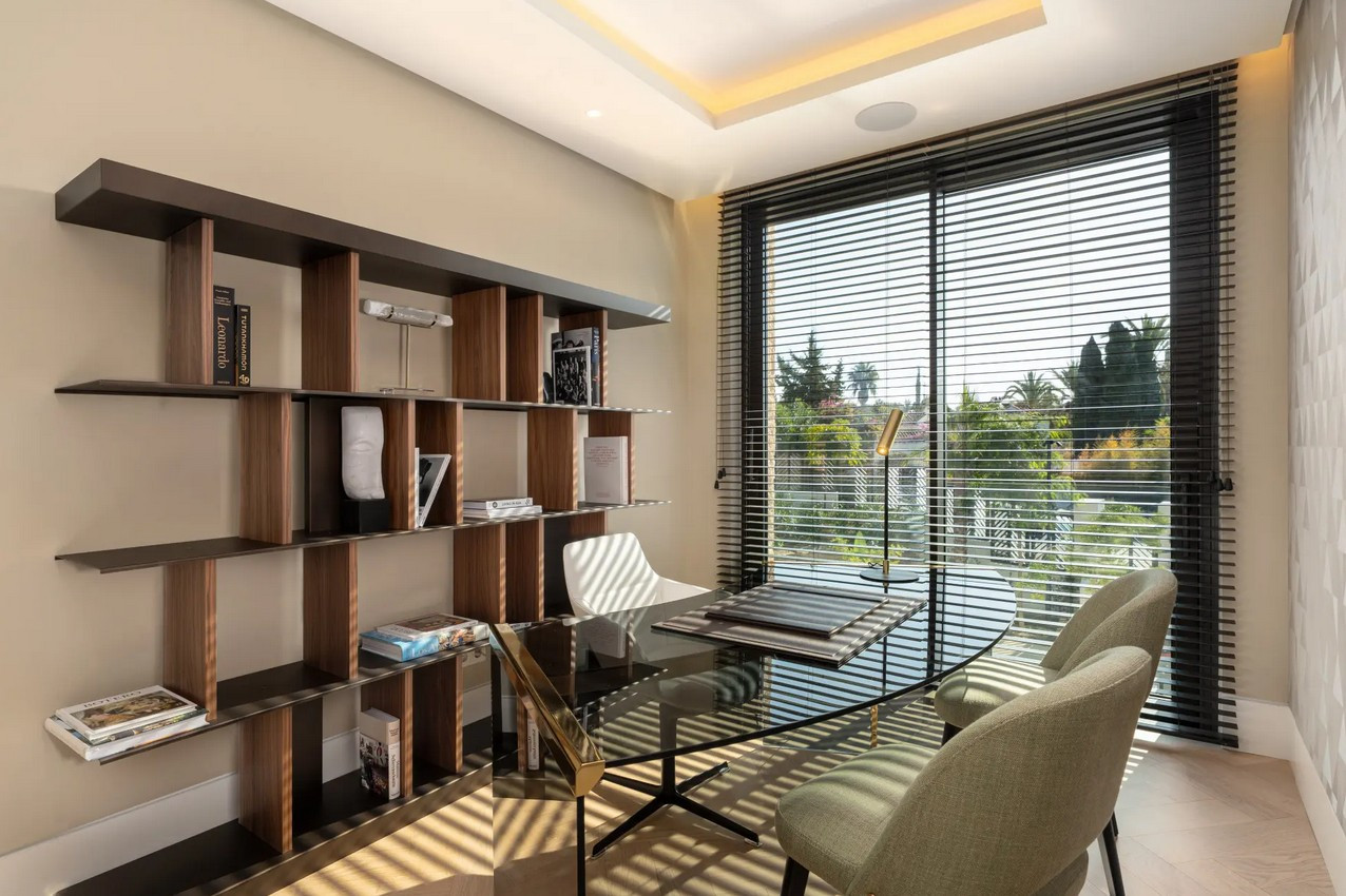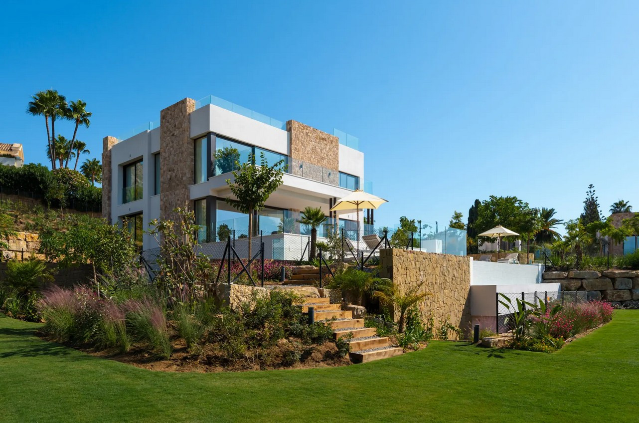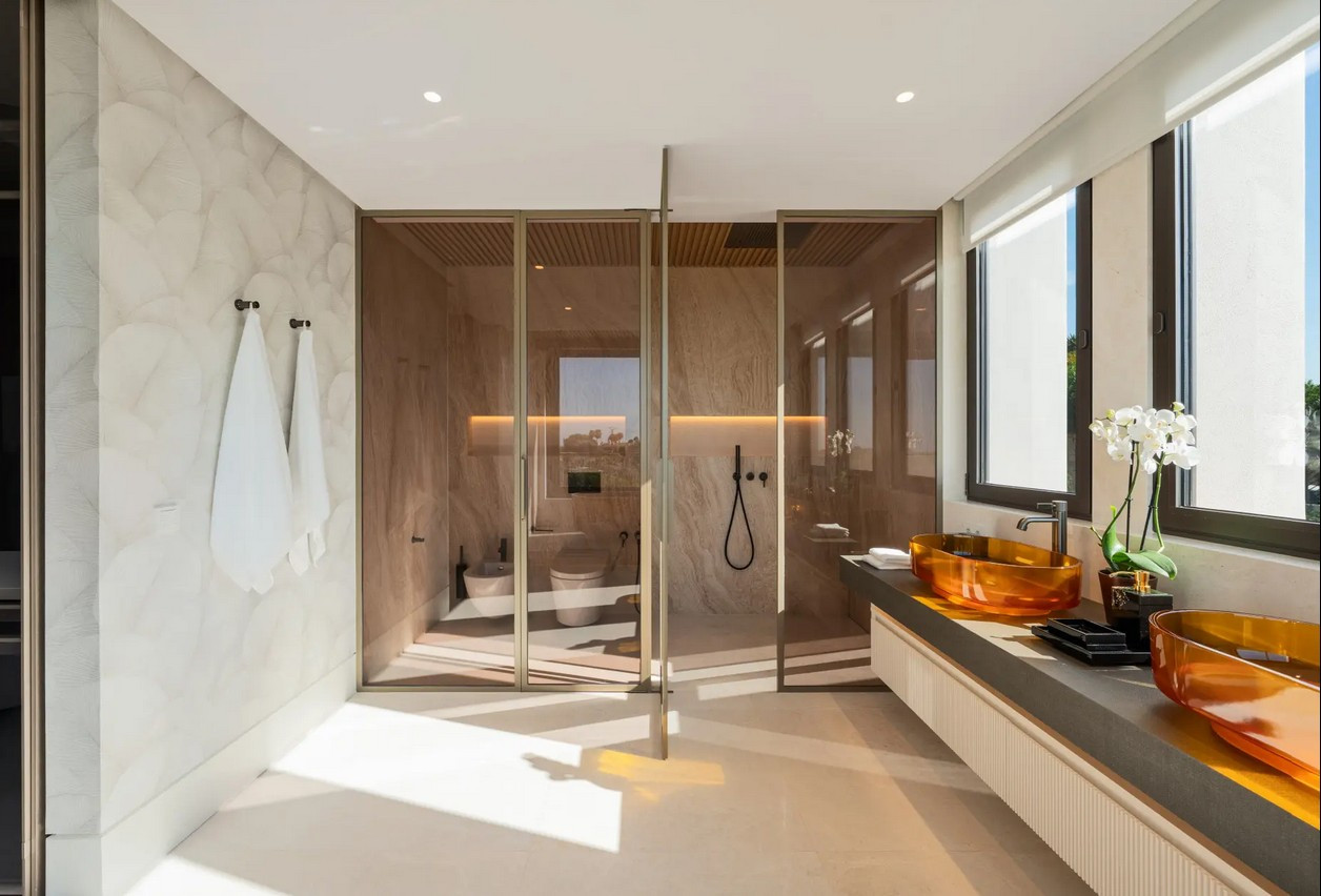 Villa, Marbella Hill Club – Designed by Villaroel and constructed by B Solis, this three-level villa exemplifies modern elegance with precise craftsmanship and refined architectural balance. Set on an expansive plot surrounded by lush landscaping by Esspora, the home captures both privacy and open views, blending natural stone and glass with sleek geometric lines. The lower level is designed for leisure and wellness. It features a fully equipped guest bedroom, laundry area, an entertainment lounge with a bespoke bar, a complete spa with an indoor heated pool and sauna, and a dedicated home gym. This floor also includes a custom machine room by Proinsermant, underscoring the villa’s technical sophistication and attention to operational excellence. On the main level, the open-plan layout connects the living, dining, and kitchen areas seamlessly. The space flows onto a large terrace that overlooks the gardens and pool, ideal for outdoor dining and relaxation. A fully functional dirty kitchen supports the main culinary area, and two guest bedrooms with en-suite bathrooms ensure convenience and comfort for visitors. Every detail reflects the refined interior design concept by Pedro Peña, featuring curated furniture, materials, and textures complemented by exclusive art pieces throughout the home. The upper floor is dedicated to private living, hosting the master suite with a walk-in closet, luxurious bathroom, and direct terrace access with panoramic views. An additional guest suite and a tranquil home office complete this level, all connected by an elevator servicing each floor. Represents an exceptional standard of living—where architectural mastery, design precision, and natural beauty converge in one of Marbella’s most sought-after addresses.