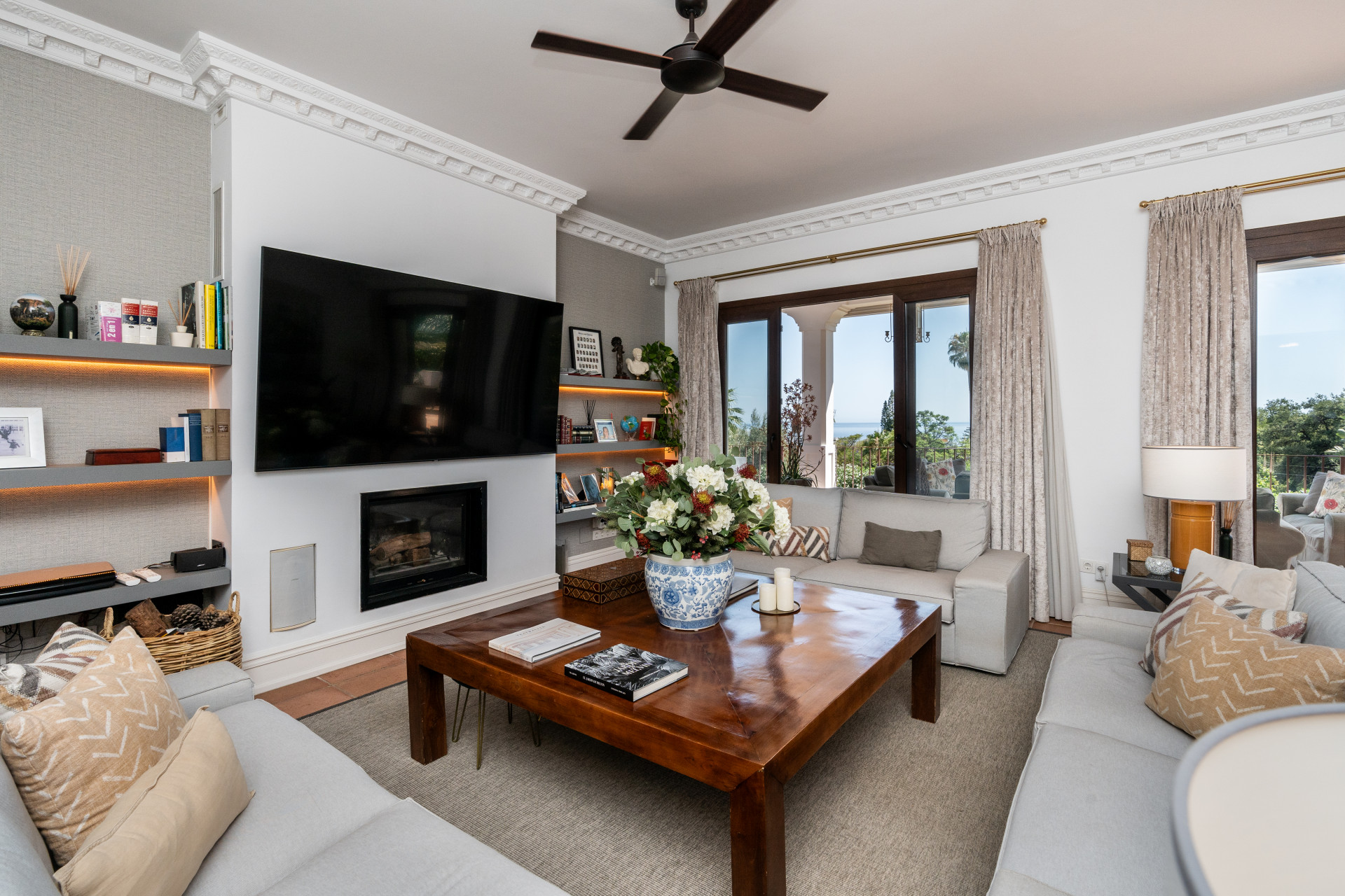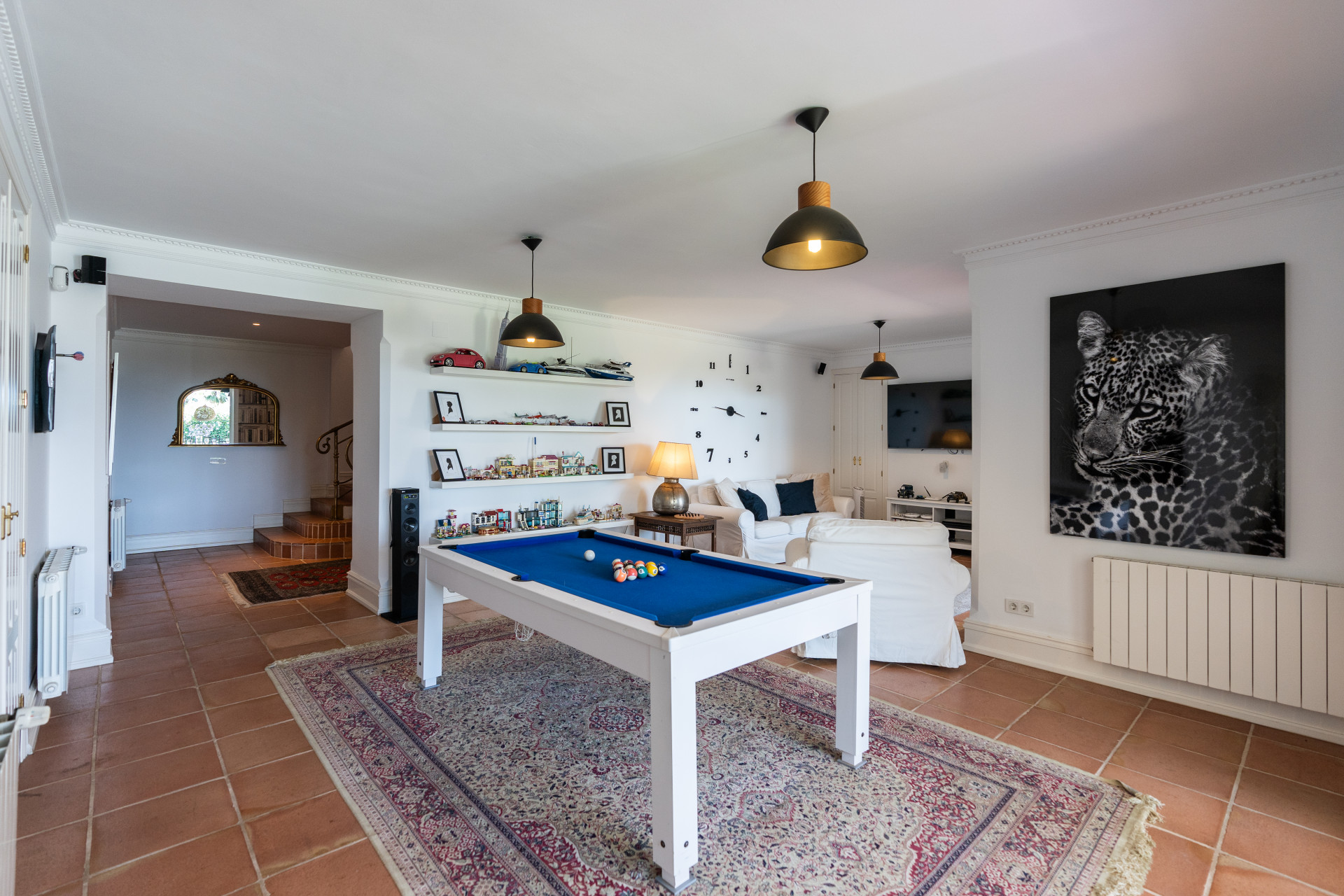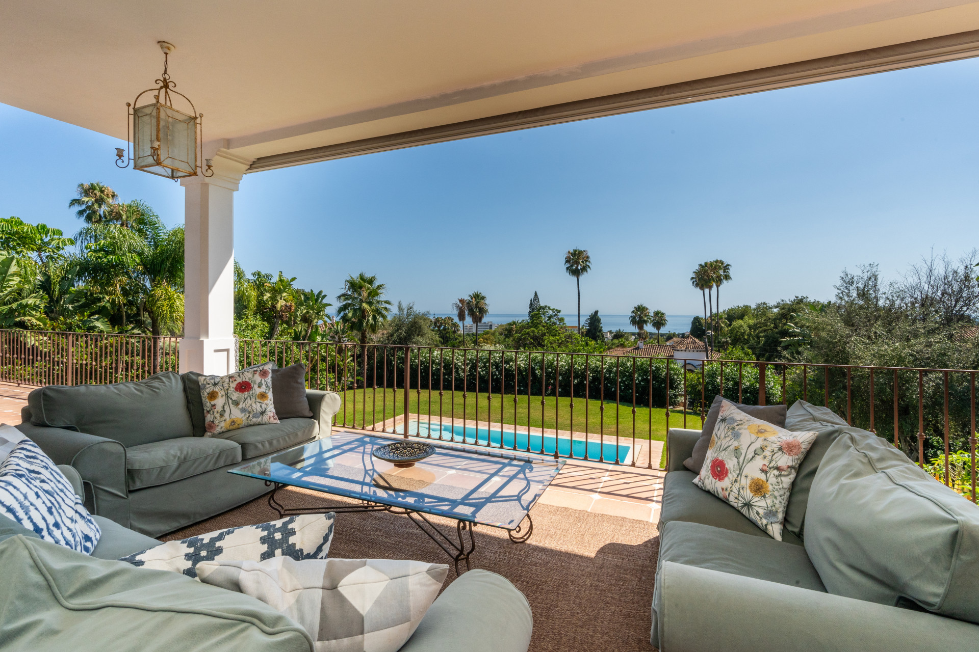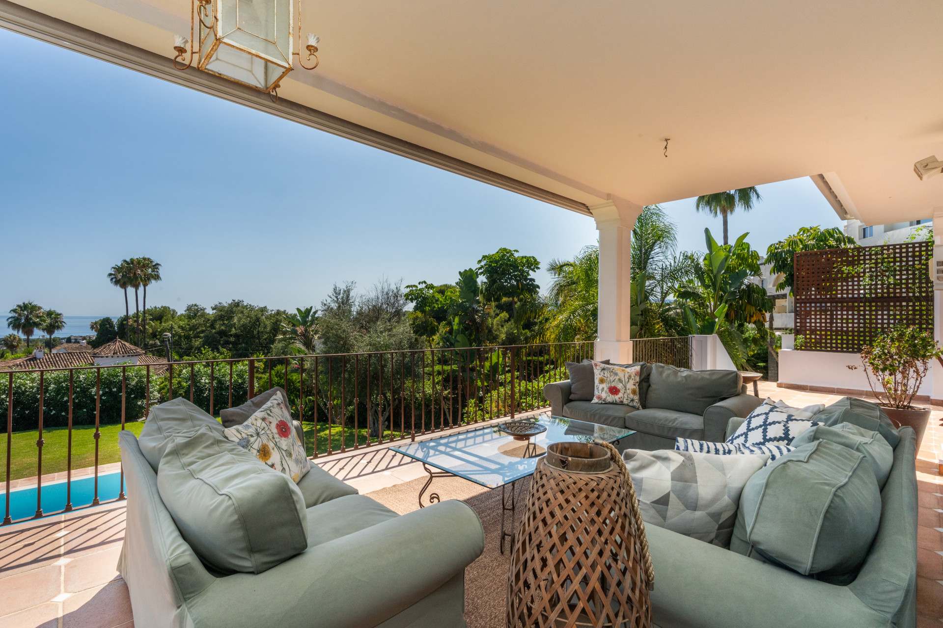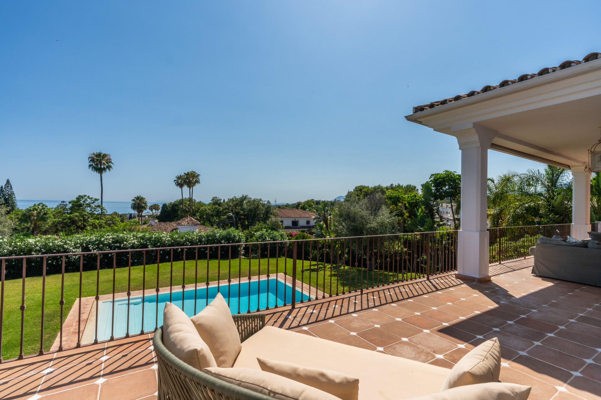 Villa, Nagüeles – Villa very close to Marbella centre with panoramic sea views for sale. Located in one of Marbella’s most privileged residential areas, just a few steps from the centre, this unique villa perfectly combines rustic Andalusian character with contemporary comfort. Combining tranquillity, privacy and convenient access to Marbella’s main destinations, this villa offers a unique blend of traditional charm and a privileged location. Built on a generous south-facing plot, the property offers privacy, spaciousness and stunning panoramic sea views from its main terrace. The main floor features an elegant entrance hall, a guest toilet, a fully equipped kitchen, a separate dining room and a spacious living room with a fireplace, which opens onto the sunny main terrace. The villa has five bedrooms with en-suite bathrooms, all carefully designed to ensure comfort and privacy. On the lower floor, a versatile multipurpose area is currently used as a games room and gym.