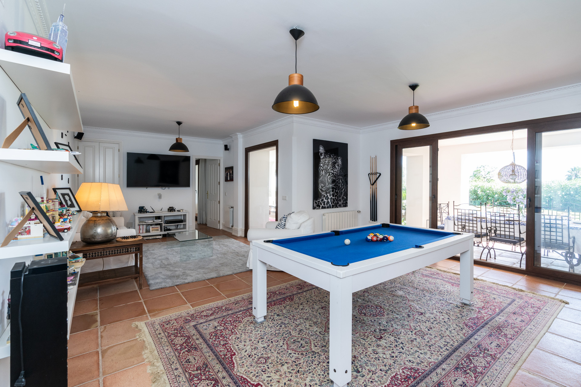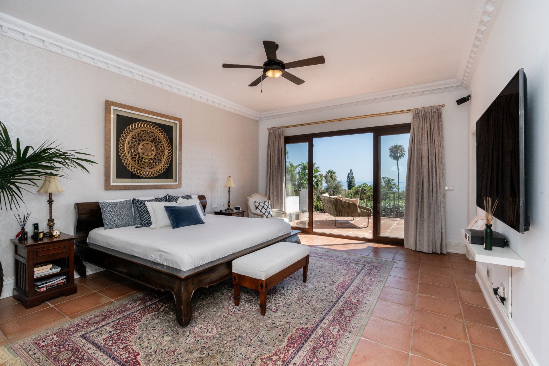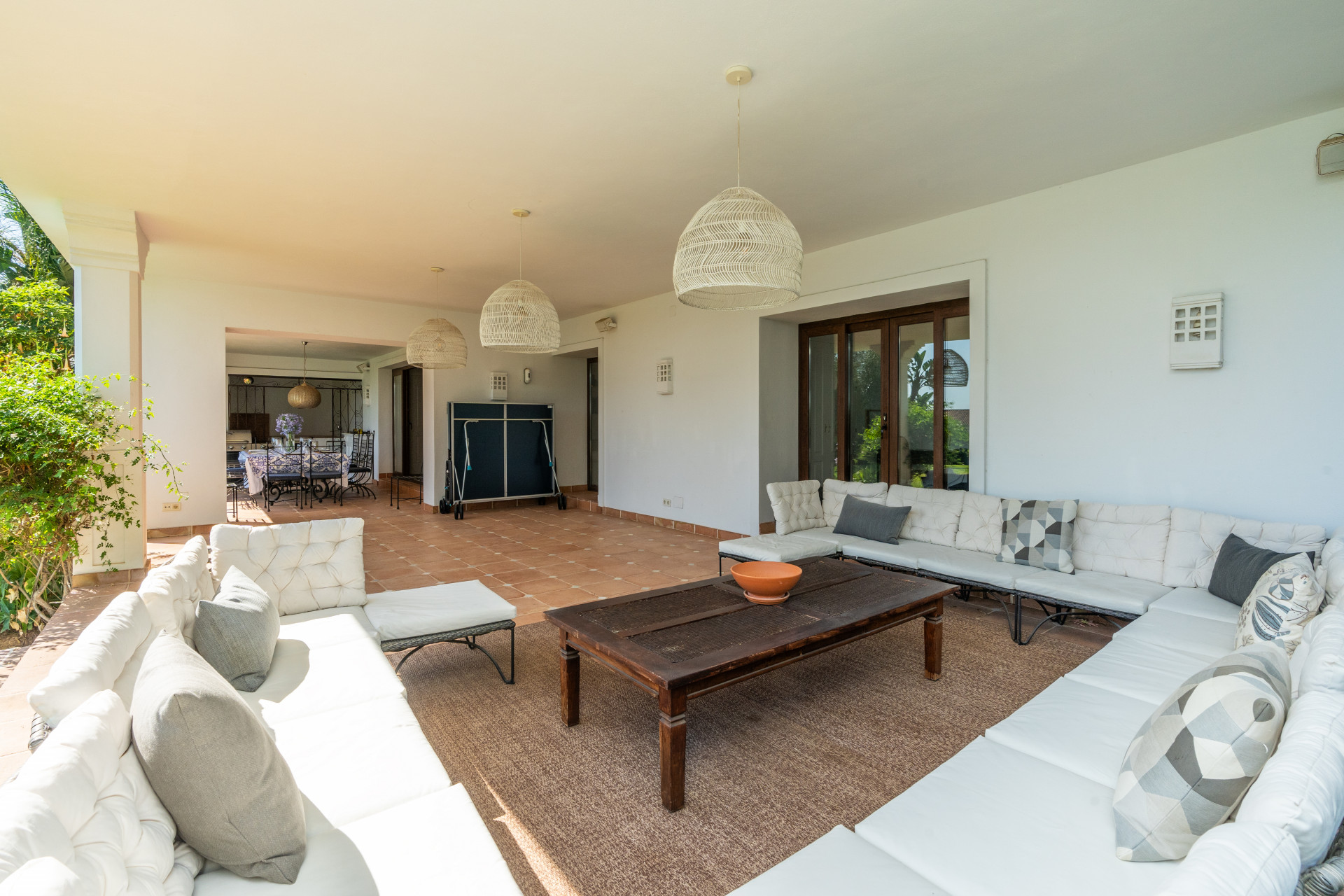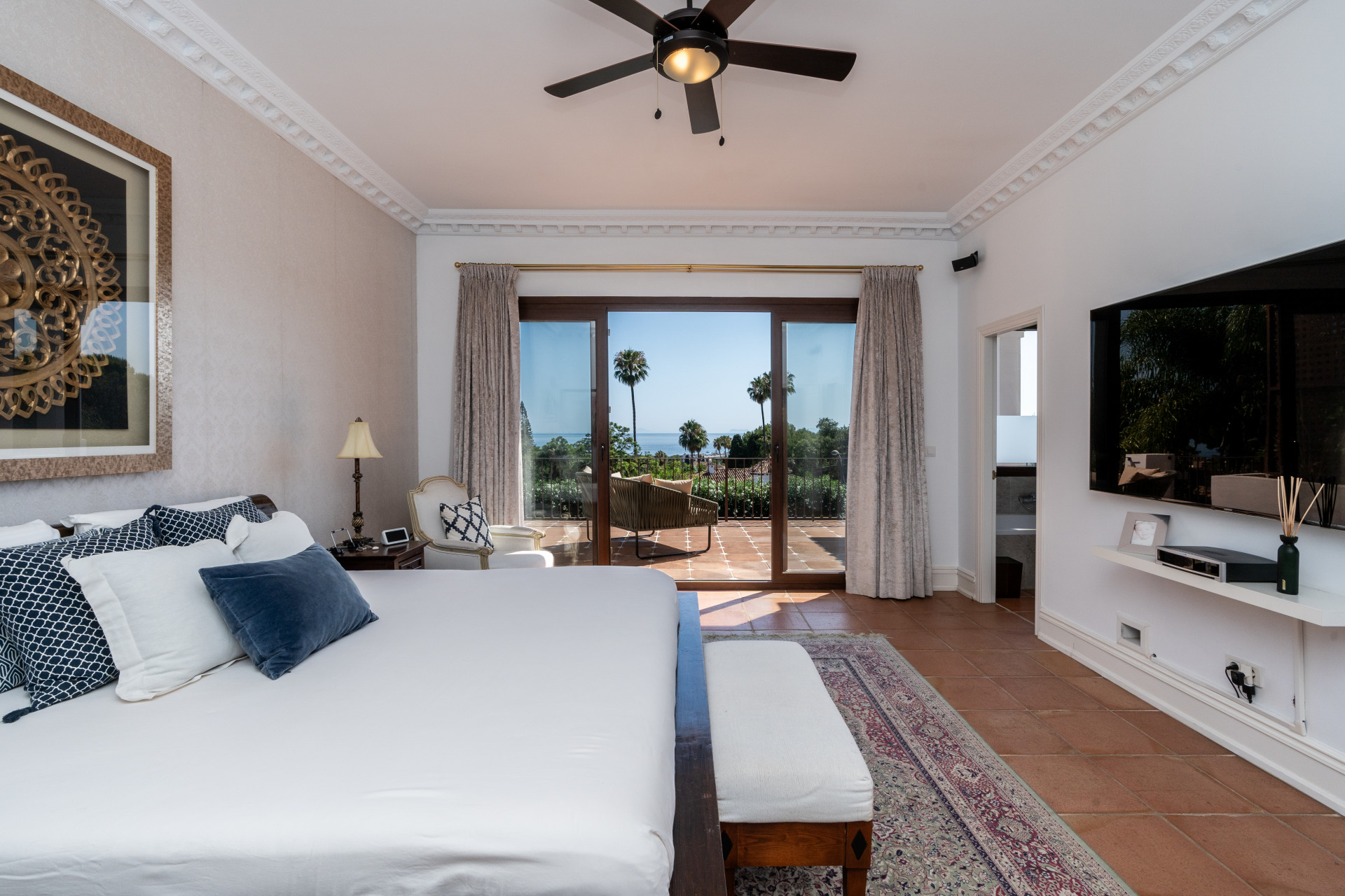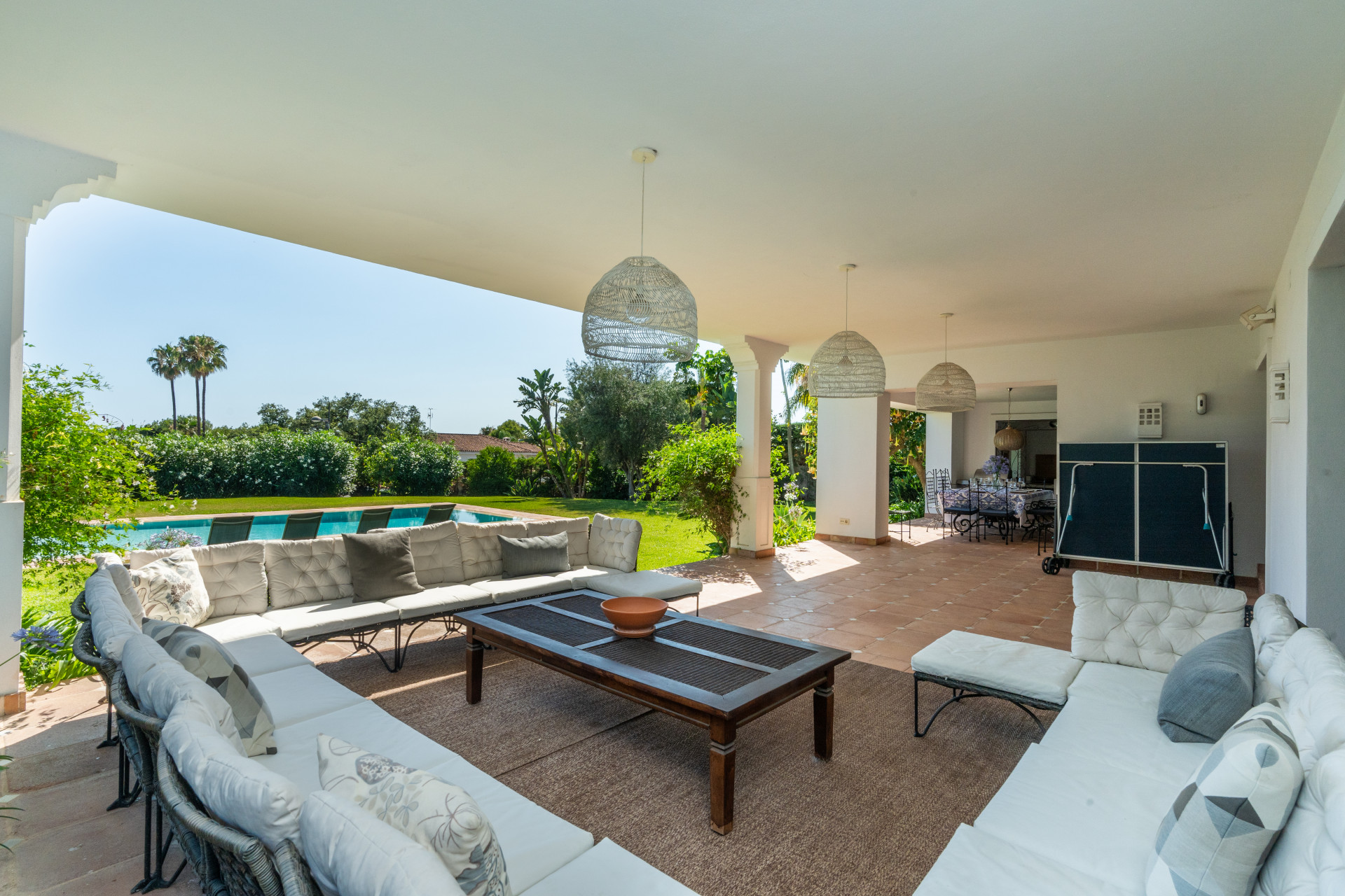 Villa, Nagüeles – Villa very close to Marbella centre with panoramic sea views for sale. Located in one of Marbella’s most privileged residential areas, just a few steps from the centre, this unique villa perfectly combines rustic Andalusian character with contemporary comfort. Combining tranquillity, privacy and convenient access to Marbella’s main destinations, this villa offers a unique blend of traditional charm and a privileged location. Built on a generous south-facing plot, the property offers privacy, spaciousness and stunning panoramic sea views from its main terrace. The main floor features an elegant entrance hall, a guest toilet, a fully equipped kitchen, a separate dining room and a spacious living room with a fireplace, which opens onto the sunny main terrace. The villa has five bedrooms with en-suite bathrooms, all carefully designed to ensure comfort and privacy. On the lower floor, a versatile multipurpose area is currently used as a games room and gym.