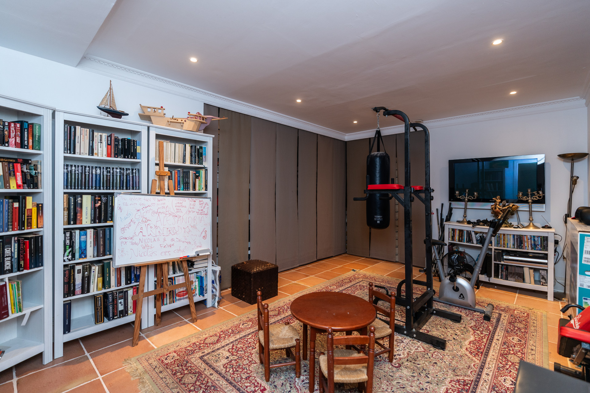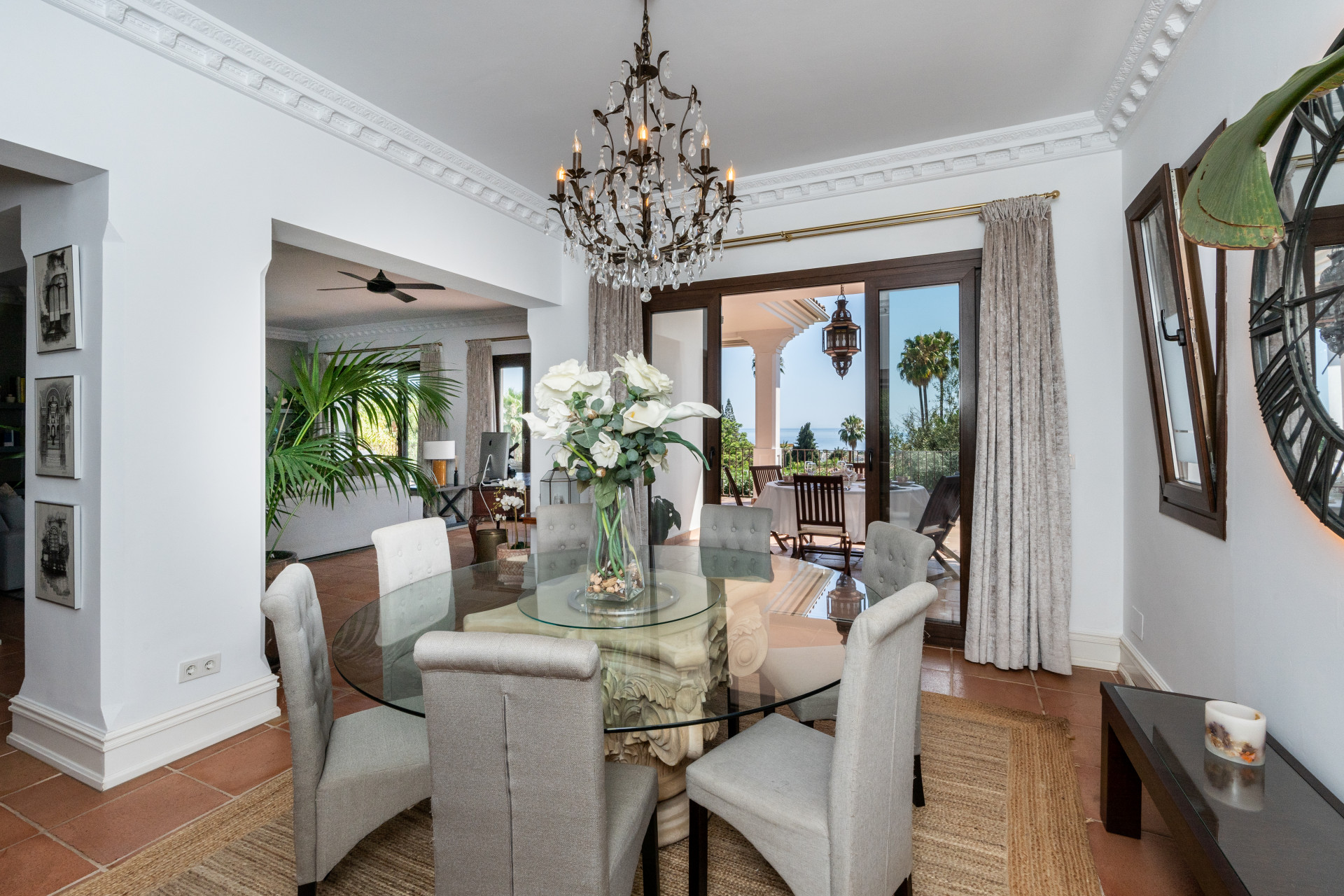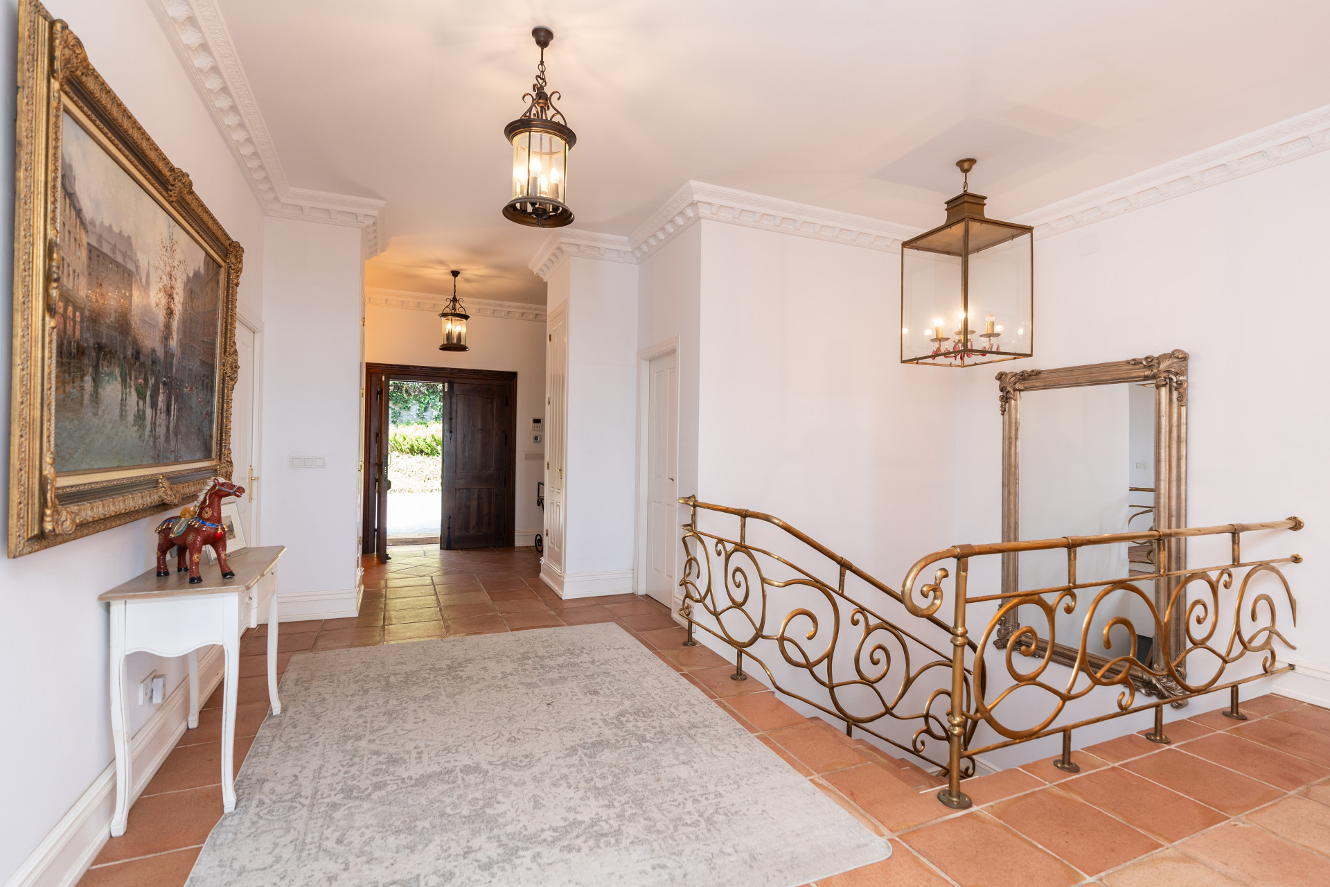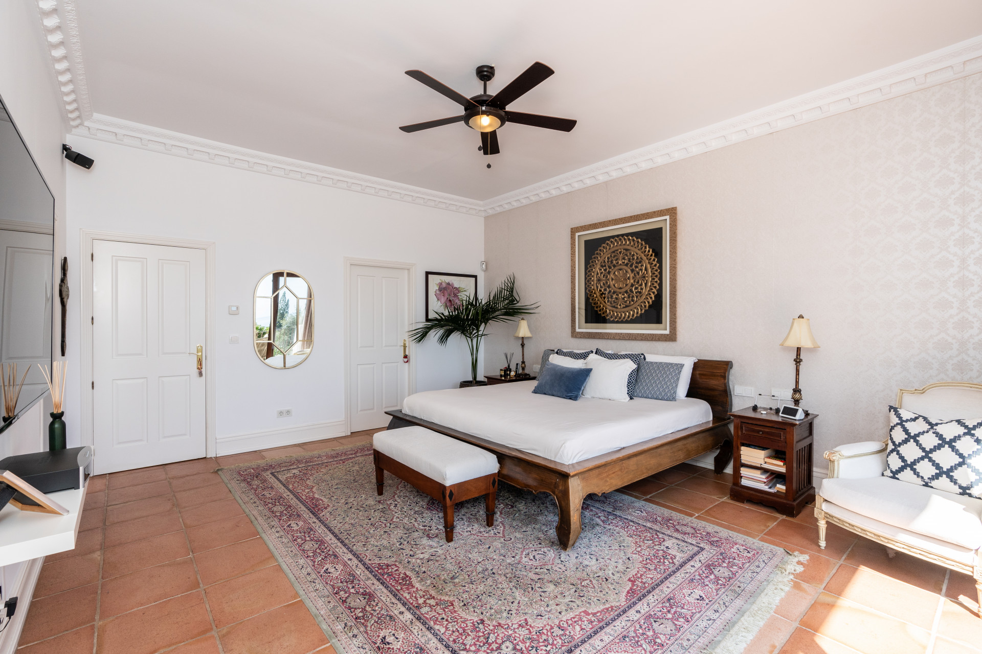 Villa, Nagüeles – Villa very close to Marbella centre with panoramic sea views for sale. Located in one of Marbella’s most privileged residential areas, just a few steps from the centre, this unique villa perfectly combines rustic Andalusian character with contemporary comfort. Combining tranquillity, privacy and convenient access to Marbella’s main destinations, this villa offers a unique blend of traditional charm and a privileged location. Built on a generous south-facing plot, the property offers privacy, spaciousness and stunning panoramic sea views from its main terrace. The main floor features an elegant entrance hall, a guest toilet, a fully equipped kitchen, a separate dining room and a spacious living room with a fireplace, which opens onto the sunny main terrace. The villa has five bedrooms with en-suite bathrooms, all carefully designed to ensure comfort and privacy. On the lower floor, a versatile multipurpose area is currently used as a games room and gym.