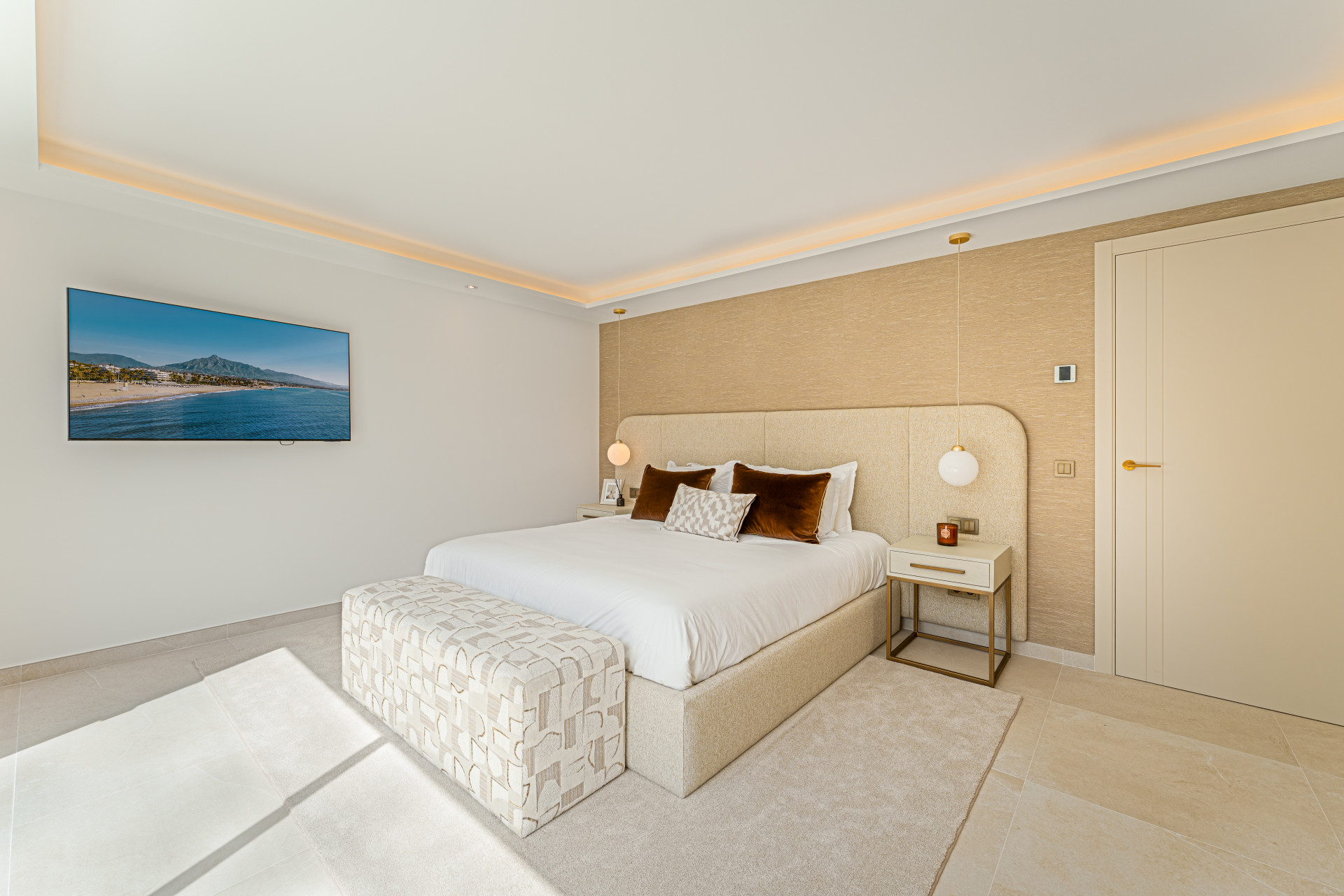 Villa, Rocio de Nagüeles – Is a contemporary luxury villa for sale next to Marbella’s Golden Mile, located in the highly sought-after residential enclave of Marbella. This refined two-storey property masterfully combines modern elegance with timeless comfort, offering four spacious en-suite bedrooms and a guest toilet. Designed for buyers seeking privacy, style, and a prime location, the home is ideal as a family residence or exclusive second home on the Costa del Sol. With its southwest-facing orientation, the villa captures uninterrupted panoramic views of the Mediterranean Sea. Multiple sun-drenched terraces create serene settings for alfresco dining, lounging, and entertainment. The home also features beautifully landscaped gardens and a heated private pool, providing year-round enjoyment of the region’s mild climate. Throughout the property, careful design ensures natural light fills each space and highlights the breathtaking surroundings, including iconic views of La Concha mountain.