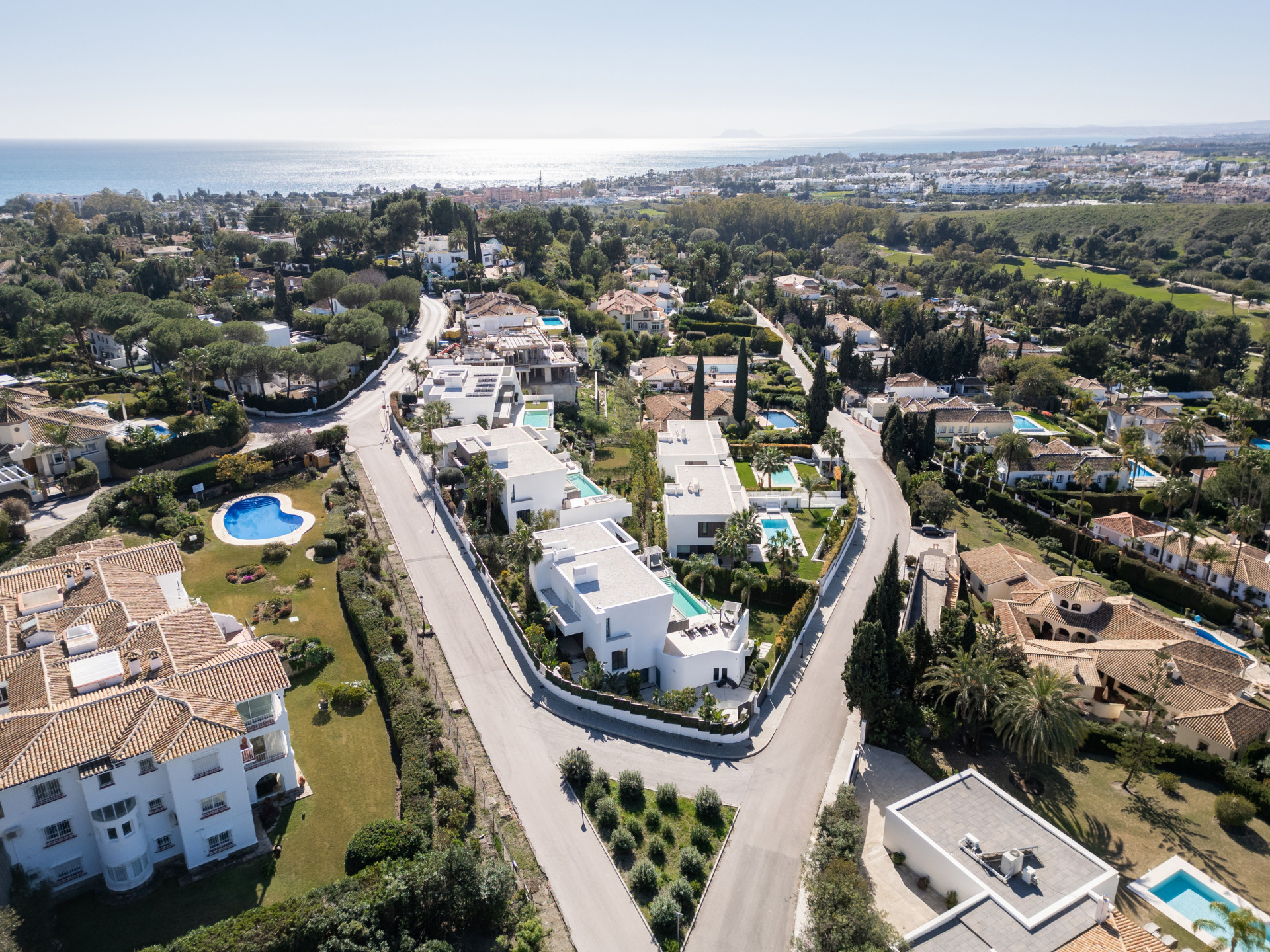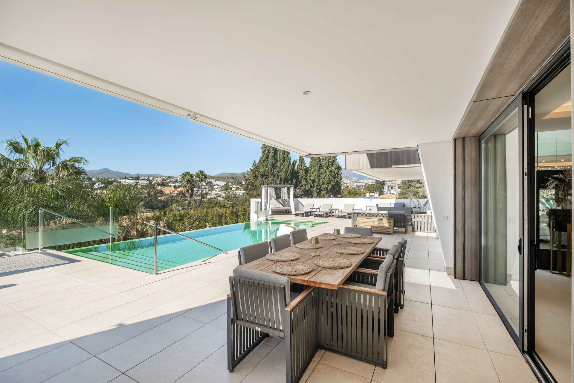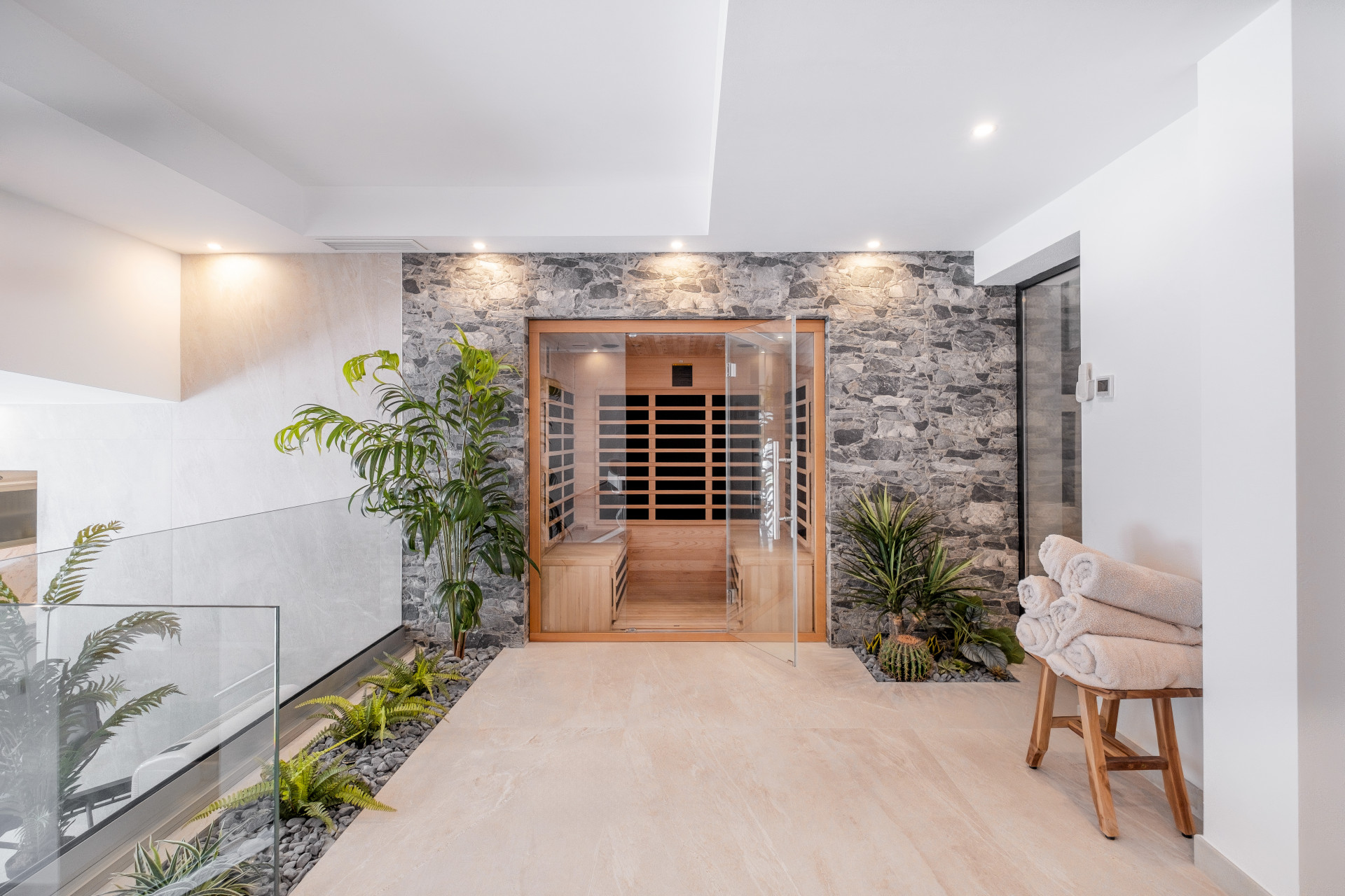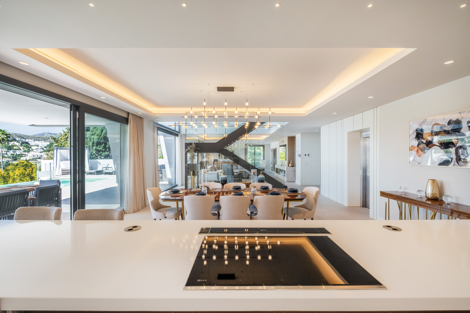 Villa, El Paraiso – This exceptional luxury villa represents a seamless fusion of contemporary architecture, refined comfort, and superior craftsmanship, offering a sophisticated lifestyle in an exclusive setting. From the moment you enter, an elegant entrance hall leads into a beautifully designed open-plan living and dining area, where a stylish fireplace creates a warm and inviting ambiance. The bespoke designer kitchen, fitted with premium Neff appliances and sleek Silestone countertops, blends functionality with modern elegance. Expansive glass doors open onto a generous terrace, where a meticulously landscaped private garden and a striking emerald-tiled heated swimming pool create a serene outdoor oasis, perfect for both relaxation and entertaining. The upper level hosts three spacious en-suite bedrooms, including a stunning master suite with its own private terrace, while the remaining bedrooms share a large terrace, offering tranquil views and abundant natural light. The basement level, finished to the highest standards and enhanced by natural light, features two additional en-suite bedrooms, a comfortable lounge area, a fully equipped laundry room, and a private wellness area complete with sauna and jacuzzi, designed for ultimate relaxation. An independent, newly renovated guest apartment with its own entrance, kitchen, and bathroom provides additional flexibility for guests or staff. The villa also offers a private garage for two cars, additional outdoor parking, and a lift connecting all levels, ensuring maximum convenience. Advanced features such as aerothermal climate control, water-based underfloor heating, home automation managed via iPads, and top-tier security systems elevate the property to a new level of modern luxury. This is a rare opportunity to acquire a fully completed, move-in ready residence with exceptional quality, panoramic views, and outstanding potential both as a permanent home and as a high-performing investment.