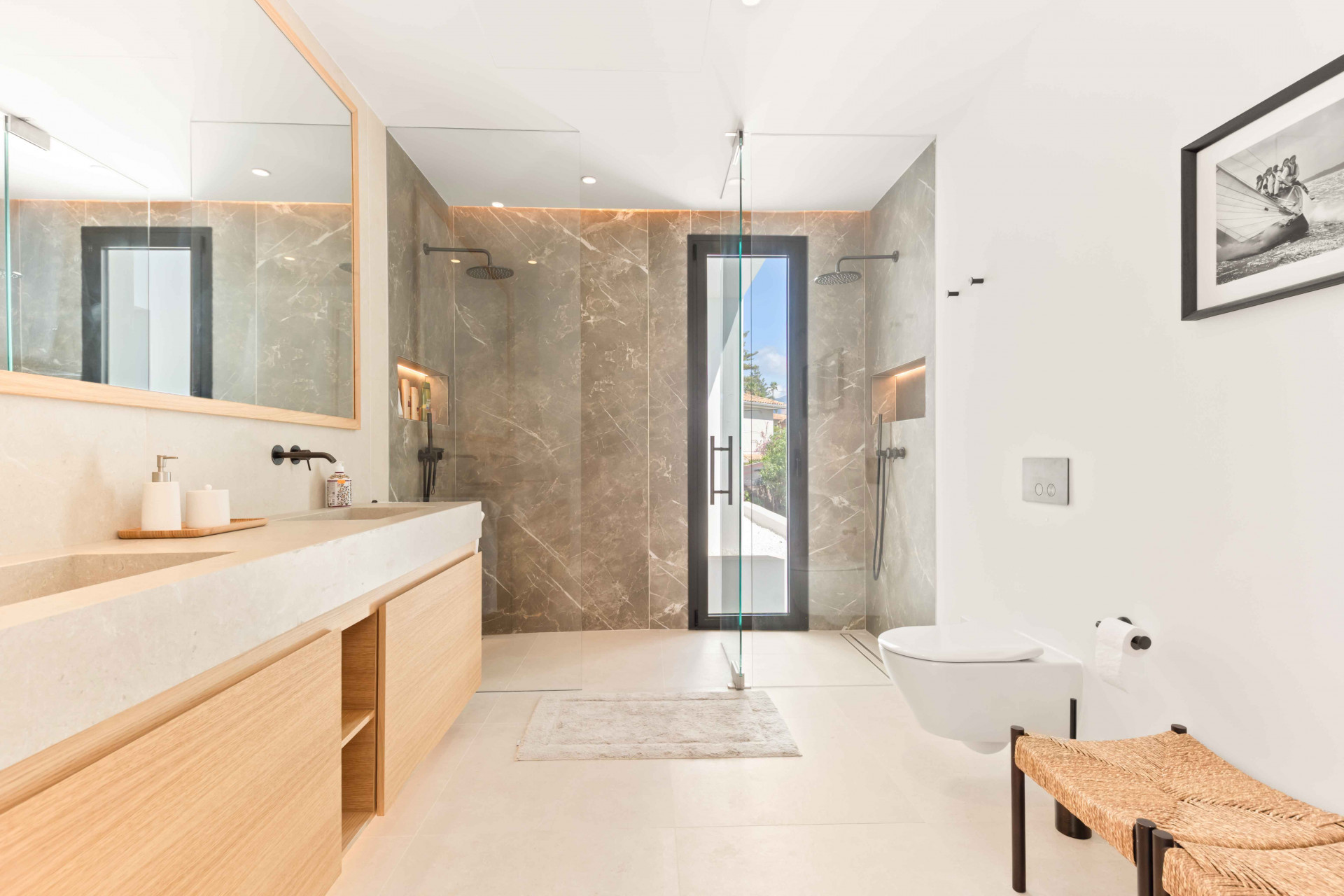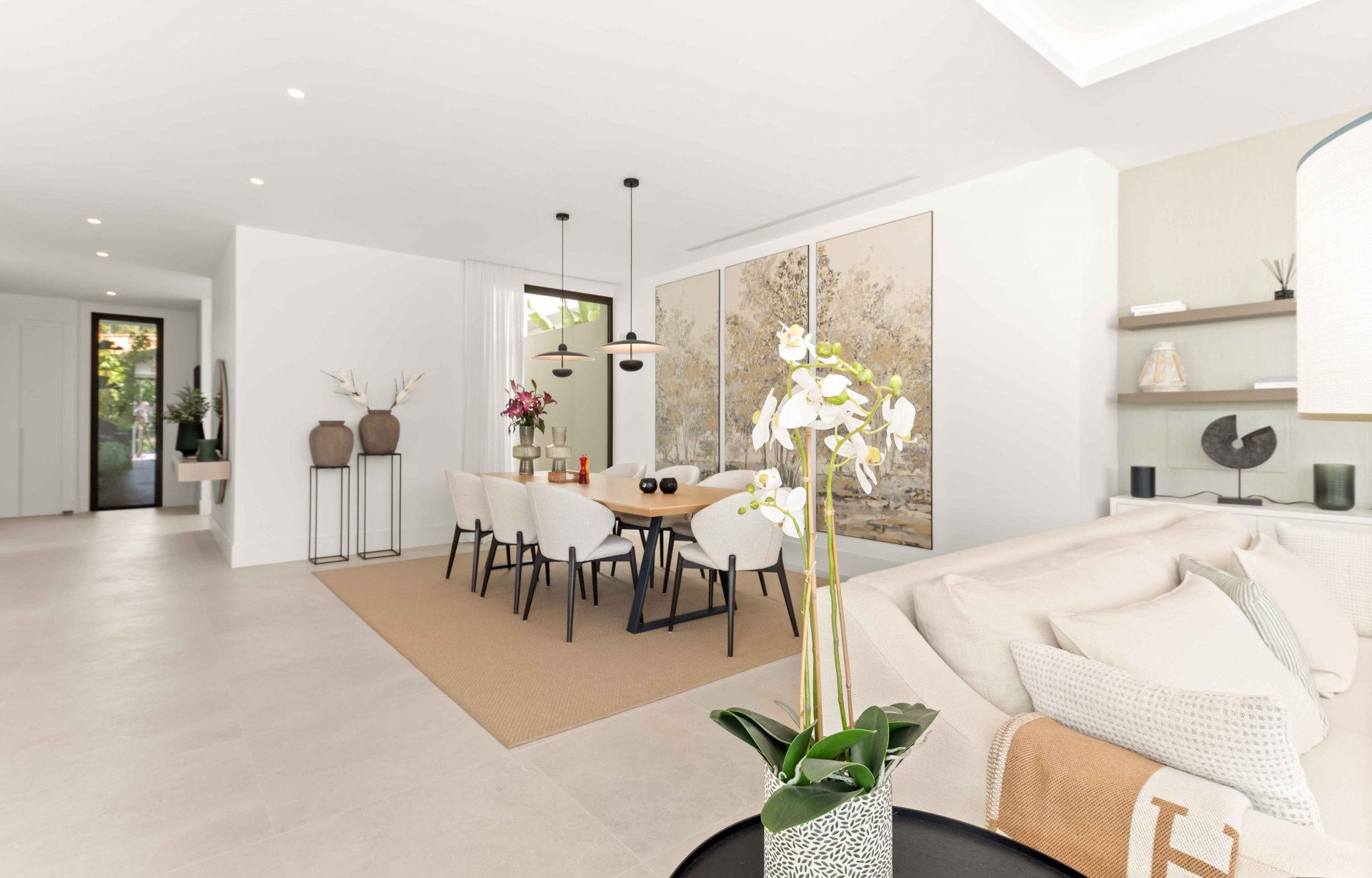 Villa, Nueva Alcantara – This contemporary villa in San Pedro Alcántara embodies a refined interpretation of modern Mediterranean living, where clean architectural lines meet the warmth of natural materials to create a residence that feels both sophisticated and inviting. Defined by a harmonious composition of white volumes and stone accents, the property is designed to maximise natural light throughout the day, with a seamless connection between indoor and outdoor spaces that enhances the overall sense of openness and tranquillity. The main living area unfolds as a fluid, open-plan environment where the lounge, dining space, and designer kitchen integrate effortlessly, forming a natural setting for both everyday living and elegant entertaining, while expansive sliding doors extend the experience onto generous terraces that overlook the private pool and serene outdoor lounge areas. The kitchen acts as the social heart of the home, combining sleek design with functionality, centred around a statement island that encourages connection and interaction. The residence offers a carefully balanced distribution of bedrooms, each designed to provide comfort and privacy, with the principal suite standing out for its direct access to the terrace and its calm, refined atmosphere. Throughout the home, every detail has been considered to enhance comfort and quality of life, from the ambient warmth of the fireplace to the advanced climate systems and intelligent home features that ensure effortless living. The lower level introduces additional versatility, offering flexible spaces that can adapt to different lifestyles, whether for wellness, leisure, or service areas, all complemented by generous storage and private parking. Set within one of the most established and sought-after residential areas on the Costa del Sol, this property offers a lifestyle defined by ease, where proximity to Marbella, the beach, and essential amenities blends seamlessly with a sense of privacy and understated luxury