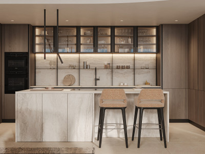 Villa, Lomas del Virrey – This detached villa is arranged across four levels connected by lift and staircase. The ground floor opens with a bright entrance hall leading to a south-facing terrace. To the right, a fluid living, dining, and kitchen area extends outdoors through sliding glass doors. The kitchen is centred around a large island and links to a separate prep area. A guest suite with walk-in wardrobe and en-suite opens directly to the terrace. Upstairs, the main suite includes a dressing area, spacious bathroom, and direct access to an outdoor space on this level. One of the two additional bedrooms also opens onto this area; both feature walk-in wardrobes and en-suite bathrooms. The rooftop solarium includes a shaded pergola and barbecue pre-installation. On the lower floor: lounge with bar, wine cellar, fifth bedroom with full bathroom. Natural light and fresh air filter through the central patio. Guest WC, laundry, utility, and storage are discreetly integrated. This project blends nature’s serenity with modern sophistication, delivering an unparalleled level of comfort in your own personal haven.