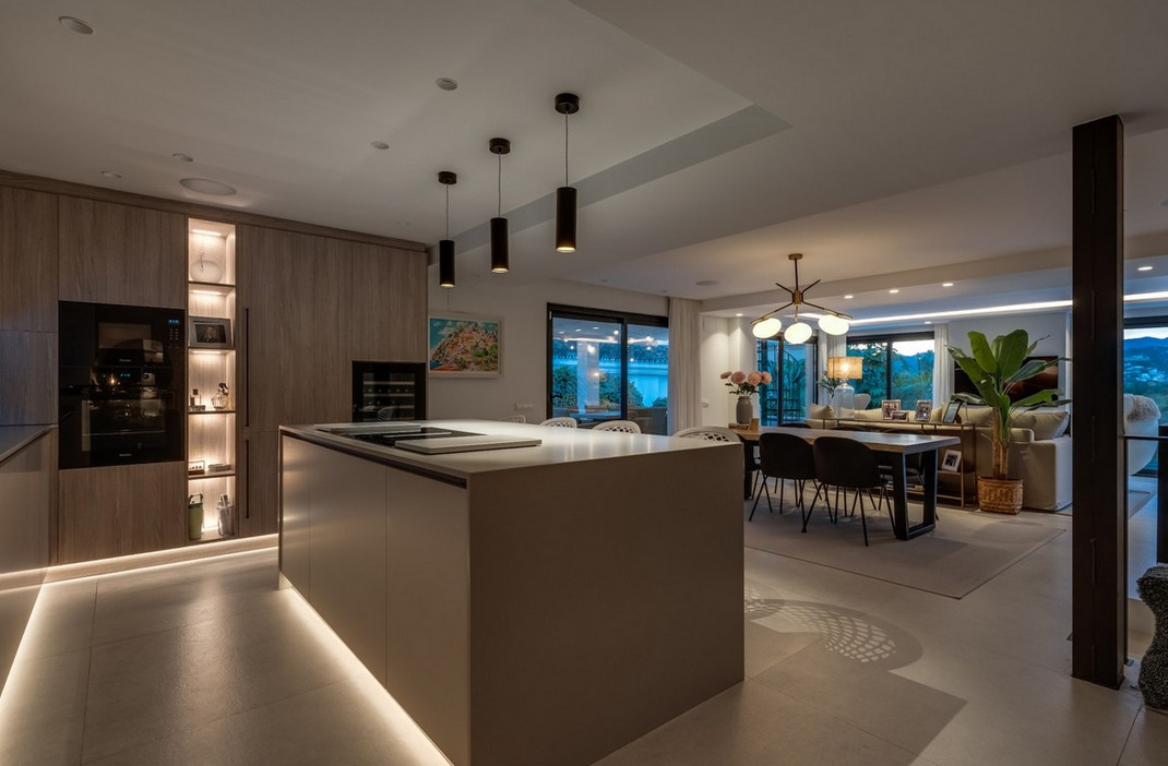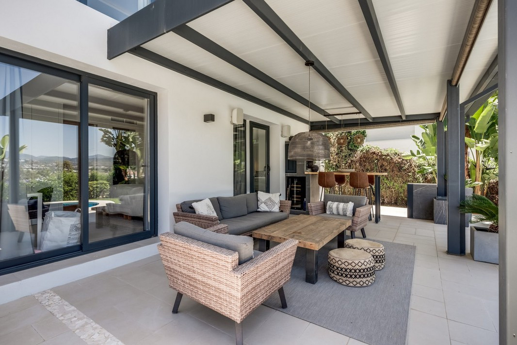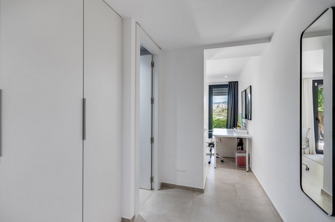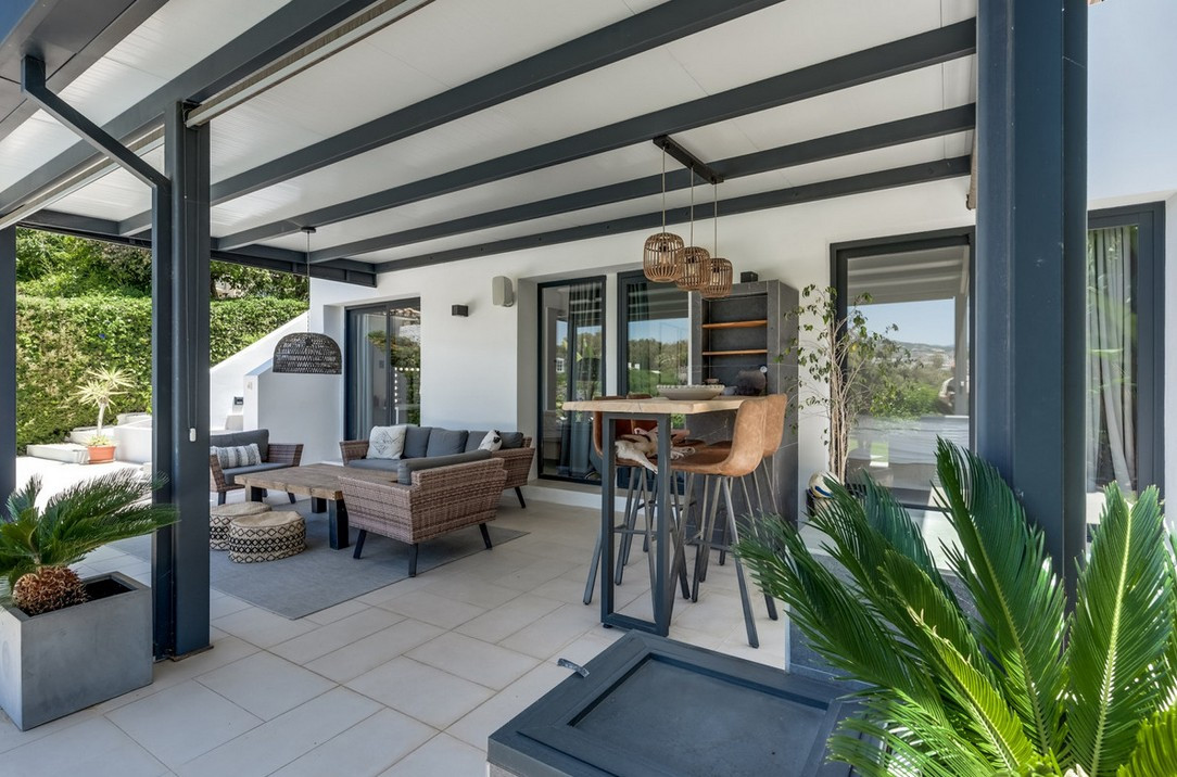 Villa, Nueva Andalucia – Discover this stunning 4-bedroom, 4-bathroom villa for sale in Nueva Andalucía, offering 226 m² of stylish living space on a private 572 m² plot. Perfectly positioned in Marbella’s sought-after Golf Valley, the property combines modern comfort, energy efficiency and Mediterranean charm with amazing sunset views. The main level features a bright open-plan living area and a high-end kitchen equipped with Miele and Siemens appliances. From here, large sliding doors open onto a spacious terrace ideal for outdoor dining and access to the rooftop solarium, where you can enjoy panoramic views and all-day sunshine. This level also includes the master suite with en-suite bathroom and a guest bedroom with a separate bathroom. A carport for two cars is prepared with EV-charging capability. On the lower level, you’ll find two additional bedrooms with en-suite bathrooms, a utility/laundry room, and direct access to a beautiful west-facing terrace with heated swimming pool, pergola, and outdoor bar — the perfect spot to relax and entertain while enjoying the afternoon sun. Conveniently located within walking distance of restaurants, supermarkets, and local amenities, this villa is also just a 5-minute drive to beaches and world-class golf courses.
