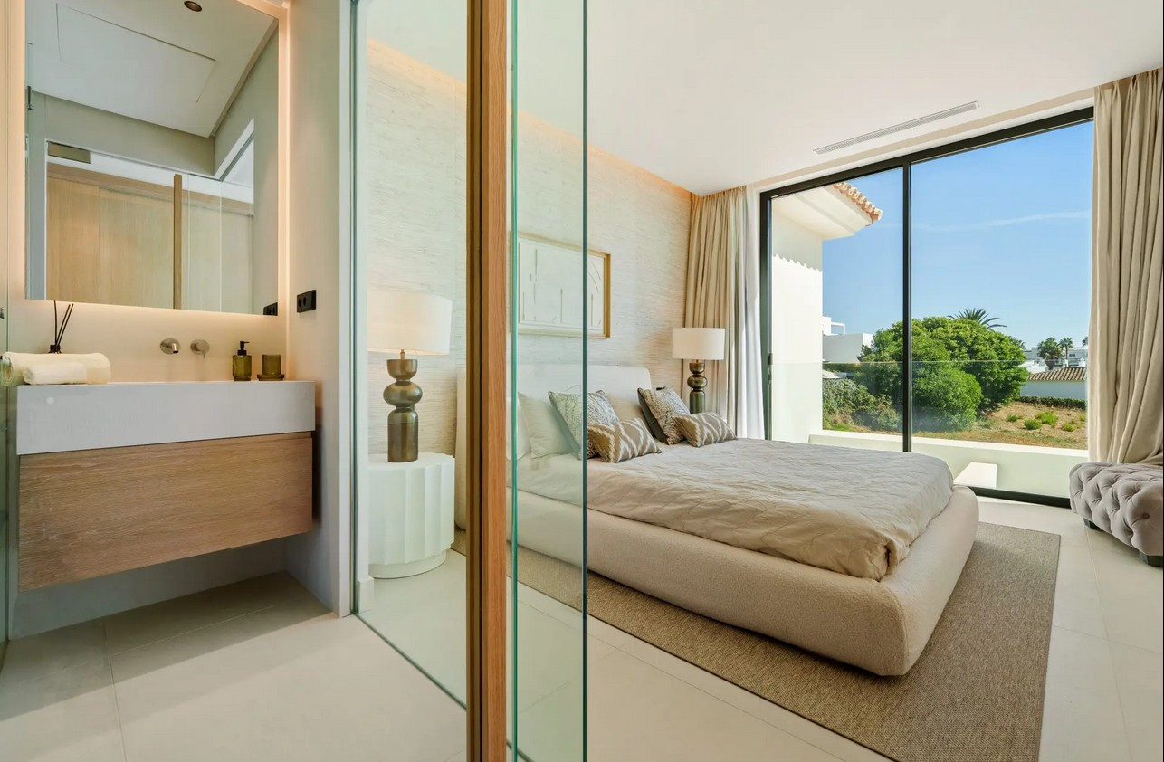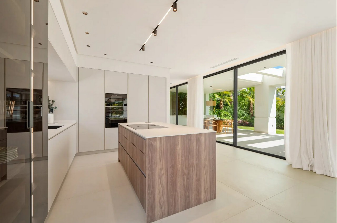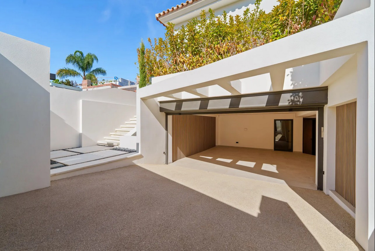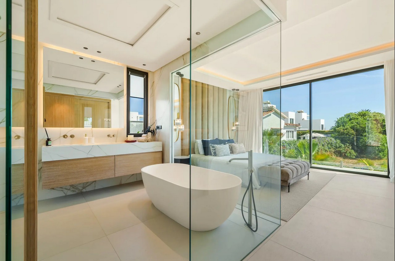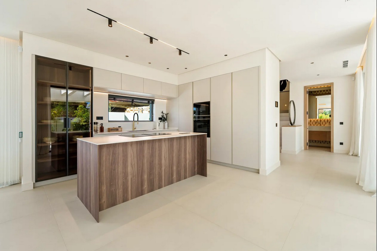 Villa, Linda Vista Baja – This contemporary villa in the sought-after neighborhood of San Pedro de Alcántara combines sleek architecture with luxurious amenities. Set behind clean white walls and landscaped greenery, the property offers a private oasis with a sparkling pool bordered by a stylish wooden deck and an expansive covered terrace for dining and lounging. Generous outdoor spaces, including a rooftop solarium, create the perfect setting for relaxation and entertaining. Inside, the design is bright and modern, highlighted by soft neutral tones, elegant recessed lighting, and floor-to-ceiling windows that fill the home with natural light. The open-plan living and dining area features a striking custom entertainment wall and contemporary fixtures, seamlessly flowing into the state-of-the-art kitchen. Here, a warm wood island contrasts beautifully with sleek cabinetry and integrated appliances, while a spacious dining area invites convivial meals with friends and family. The villa’s private quarters continue the sophisticated aesthetic. Bedrooms are serene and airy, with floor-to-ceiling glass doors that open to terraces, and en-suite bathrooms that exude spa-like elegance with floating vanities, marble finishes, and freestanding tubs. The primary suite impresses with its luxurious proportions and direct access to a sunlit terrace, creating an intimate retreat within the home. For wellness and leisure, the lower level includes a fully equipped gym, complete with a sauna and steam room enclosed in glass, and ample space for exercise and relaxation. A secure garage and refined entryway add convenience and privacy to this exceptional residence.