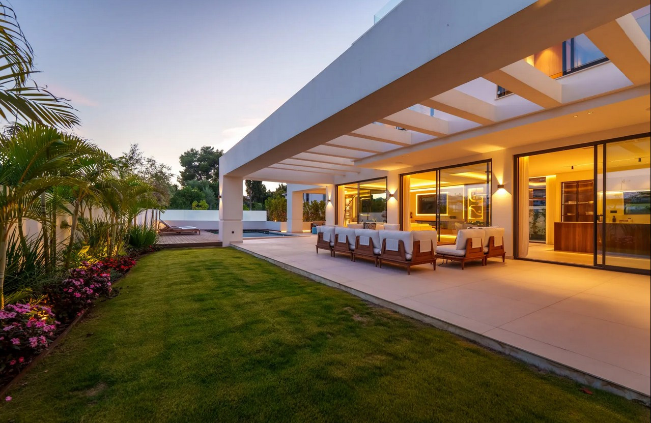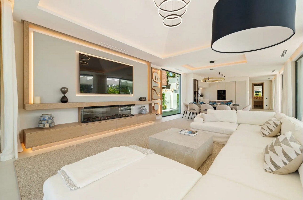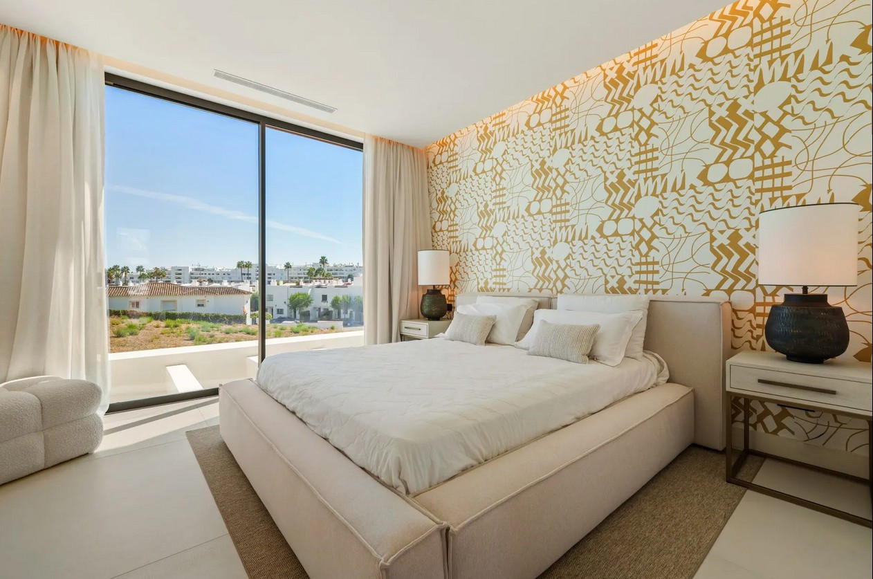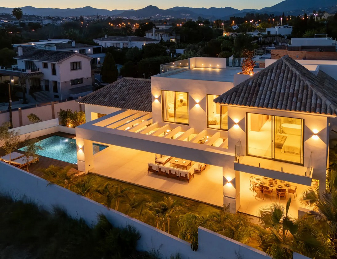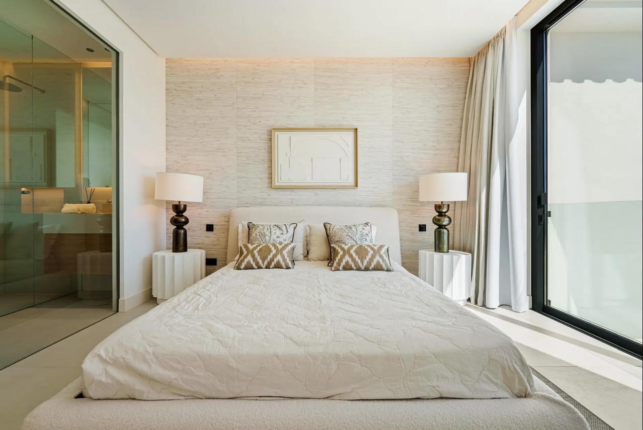 Villa, Linda Vista Baja – This contemporary villa in the sought-after neighborhood of San Pedro de Alcántara combines sleek architecture with luxurious amenities. Set behind clean white walls and landscaped greenery, the property offers a private oasis with a sparkling pool bordered by a stylish wooden deck and an expansive covered terrace for dining and lounging. Generous outdoor spaces, including a rooftop solarium, create the perfect setting for relaxation and entertaining. Inside, the design is bright and modern, highlighted by soft neutral tones, elegant recessed lighting, and floor-to-ceiling windows that fill the home with natural light. The open-plan living and dining area features a striking custom entertainment wall and contemporary fixtures, seamlessly flowing into the state-of-the-art kitchen. Here, a warm wood island contrasts beautifully with sleek cabinetry and integrated appliances, while a spacious dining area invites convivial meals with friends and family. The villa’s private quarters continue the sophisticated aesthetic. Bedrooms are serene and airy, with floor-to-ceiling glass doors that open to terraces, and en-suite bathrooms that exude spa-like elegance with floating vanities, marble finishes, and freestanding tubs. The primary suite impresses with its luxurious proportions and direct access to a sunlit terrace, creating an intimate retreat within the home. For wellness and leisure, the lower level includes a fully equipped gym, complete with a sauna and steam room enclosed in glass, and ample space for exercise and relaxation. A secure garage and refined entryway add convenience and privacy to this exceptional residence.
