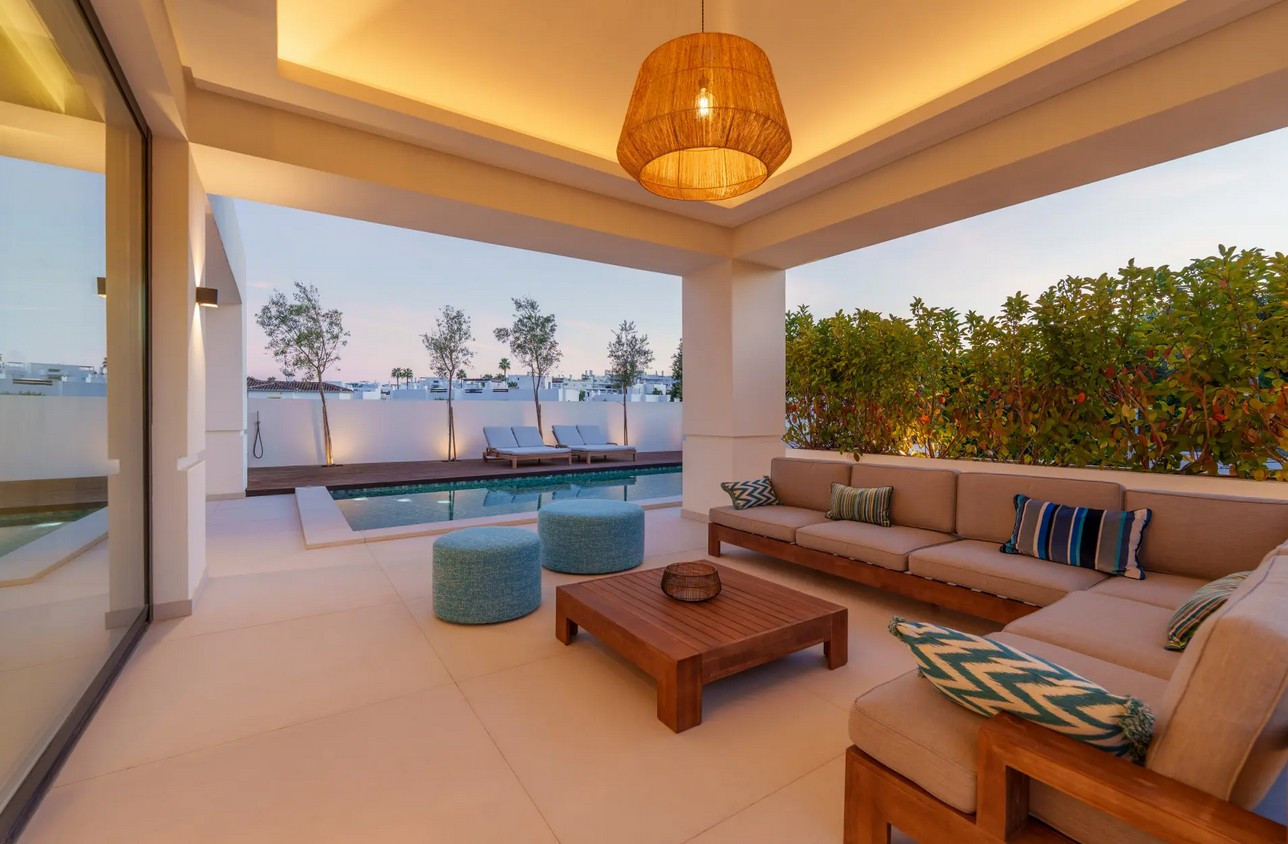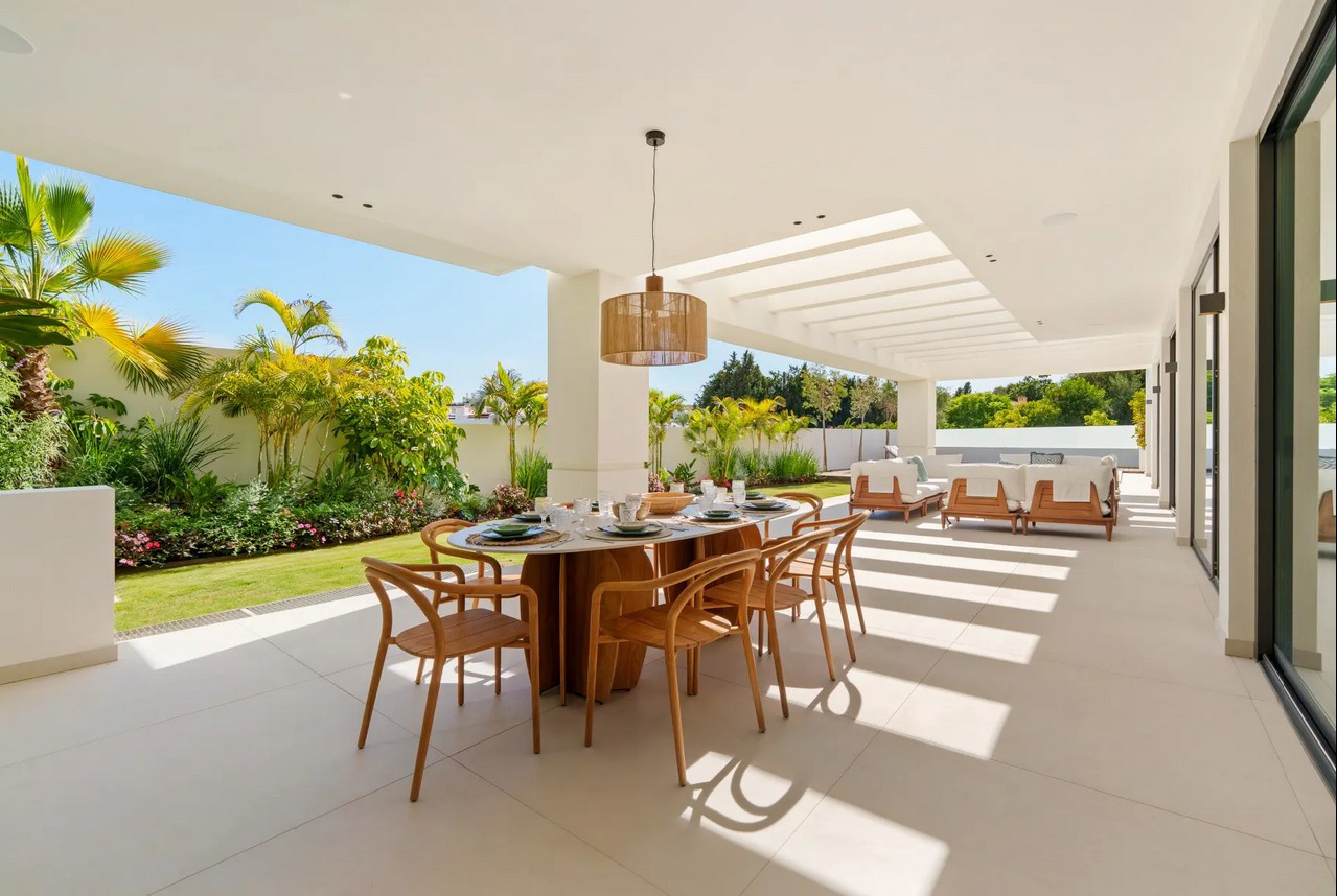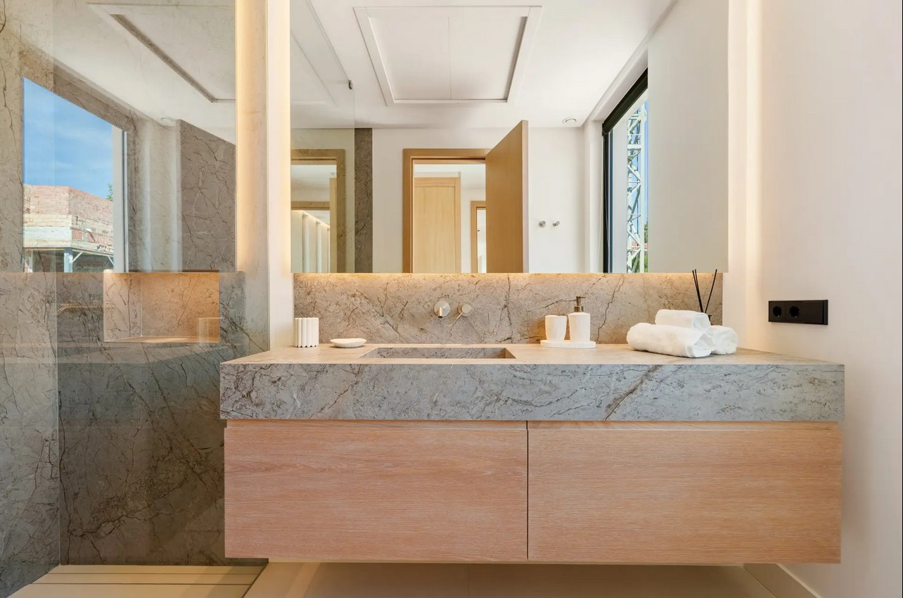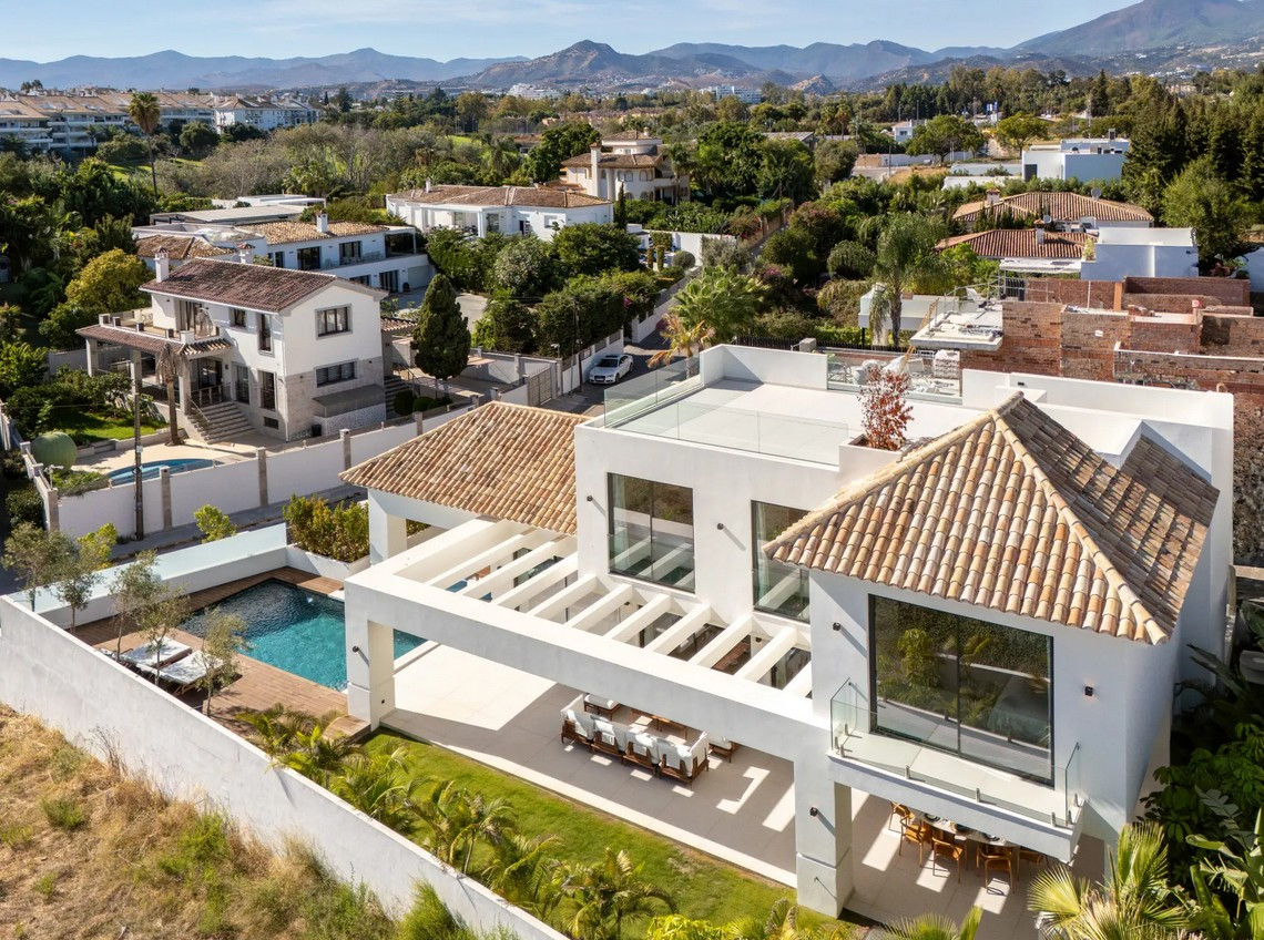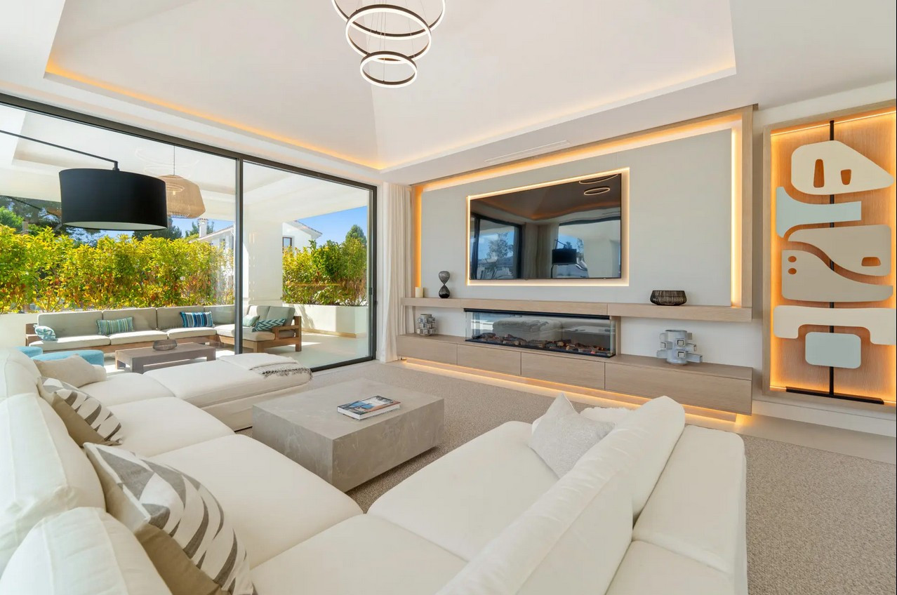Villa, Linda Vista Baja – This contemporary villa in the sought-after neighborhood of San Pedro de Alcántara combines sleek architecture with luxurious amenities. Set behind clean white walls and landscaped greenery, the property offers a private oasis with a sparkling pool bordered by a stylish wooden deck and an expansive covered terrace for dining and lounging. Generous outdoor spaces, including a rooftop solarium, create the perfect setting for relaxation and entertaining. Inside, the design is bright and modern, highlighted by soft neutral tones, elegant recessed lighting, and floor-to-ceiling windows that fill the home with natural light. The open-plan living and dining area features a striking custom entertainment wall and contemporary fixtures, seamlessly flowing into the state-of-the-art kitchen. Here, a warm wood island contrasts beautifully with sleek cabinetry and integrated appliances, while a spacious dining area invites convivial meals with friends and family. The villa’s private quarters continue the sophisticated aesthetic. Bedrooms are serene and airy, with floor-to-ceiling glass doors that open to terraces, and en-suite bathrooms that exude spa-like elegance with floating vanities, marble finishes, and freestanding tubs. The primary suite impresses with its luxurious proportions and direct access to a sunlit terrace, creating an intimate retreat within the home. For wellness and leisure, the lower level includes a fully equipped gym, complete with a sauna and steam room enclosed in glass, and ample space for exercise and relaxation. A secure garage and refined entryway add convenience and privacy to this exceptional residence.