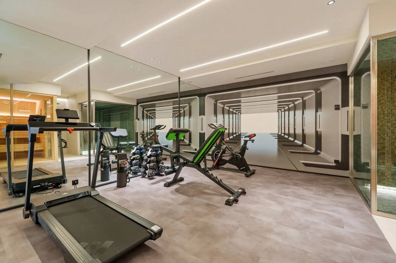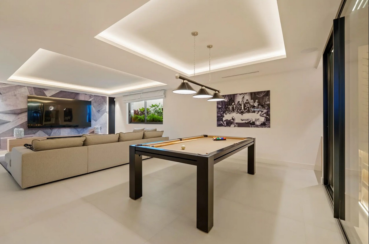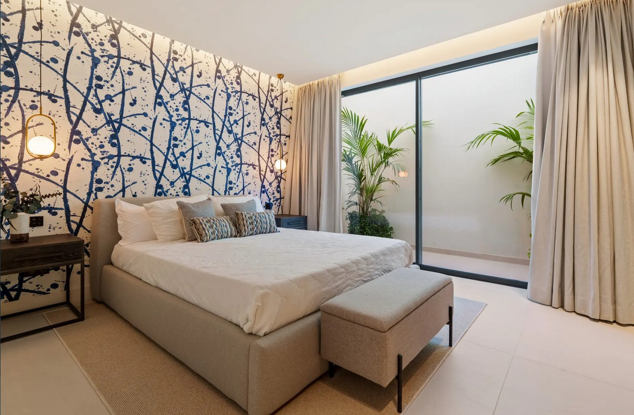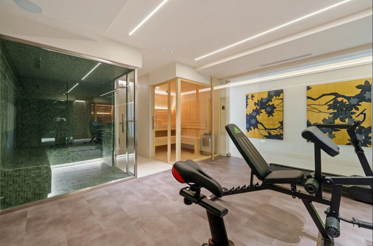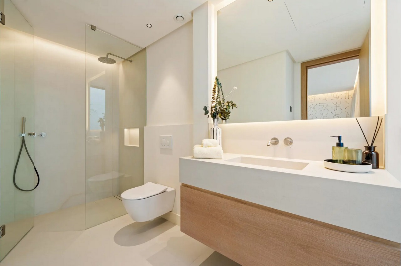 Villa, Linda Vista Baja – This contemporary villa in the sought-after neighborhood of San Pedro de Alcántara combines sleek architecture with luxurious amenities. Set behind clean white walls and landscaped greenery, the property offers a private oasis with a sparkling pool bordered by a stylish wooden deck and an expansive covered terrace for dining and lounging. Generous outdoor spaces, including a rooftop solarium, create the perfect setting for relaxation and entertaining. Inside, the design is bright and modern, highlighted by soft neutral tones, elegant recessed lighting, and floor-to-ceiling windows that fill the home with natural light. The open-plan living and dining area features a striking custom entertainment wall and contemporary fixtures, seamlessly flowing into the state-of-the-art kitchen. Here, a warm wood island contrasts beautifully with sleek cabinetry and integrated appliances, while a spacious dining area invites convivial meals with friends and family. The villa’s private quarters continue the sophisticated aesthetic. Bedrooms are serene and airy, with floor-to-ceiling glass doors that open to terraces, and en-suite bathrooms that exude spa-like elegance with floating vanities, marble finishes, and freestanding tubs. The primary suite impresses with its luxurious proportions and direct access to a sunlit terrace, creating an intimate retreat within the home. For wellness and leisure, the lower level includes a fully equipped gym, complete with a sauna and steam room enclosed in glass, and ample space for exercise and relaxation. A secure garage and refined entryway add convenience and privacy to this exceptional residence.