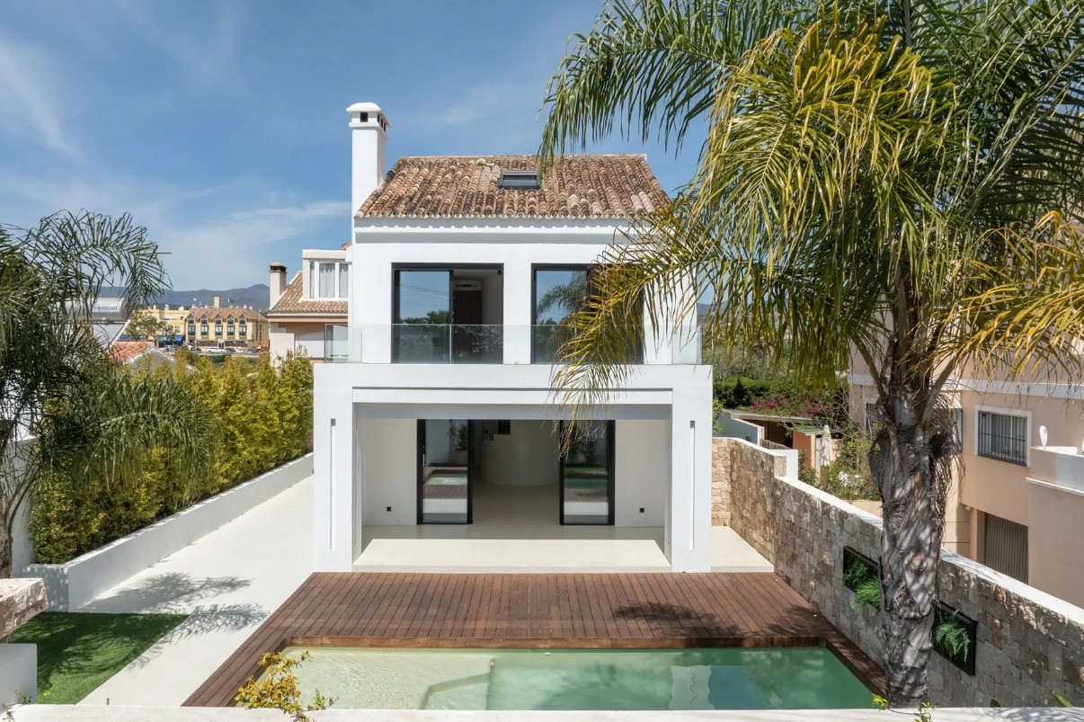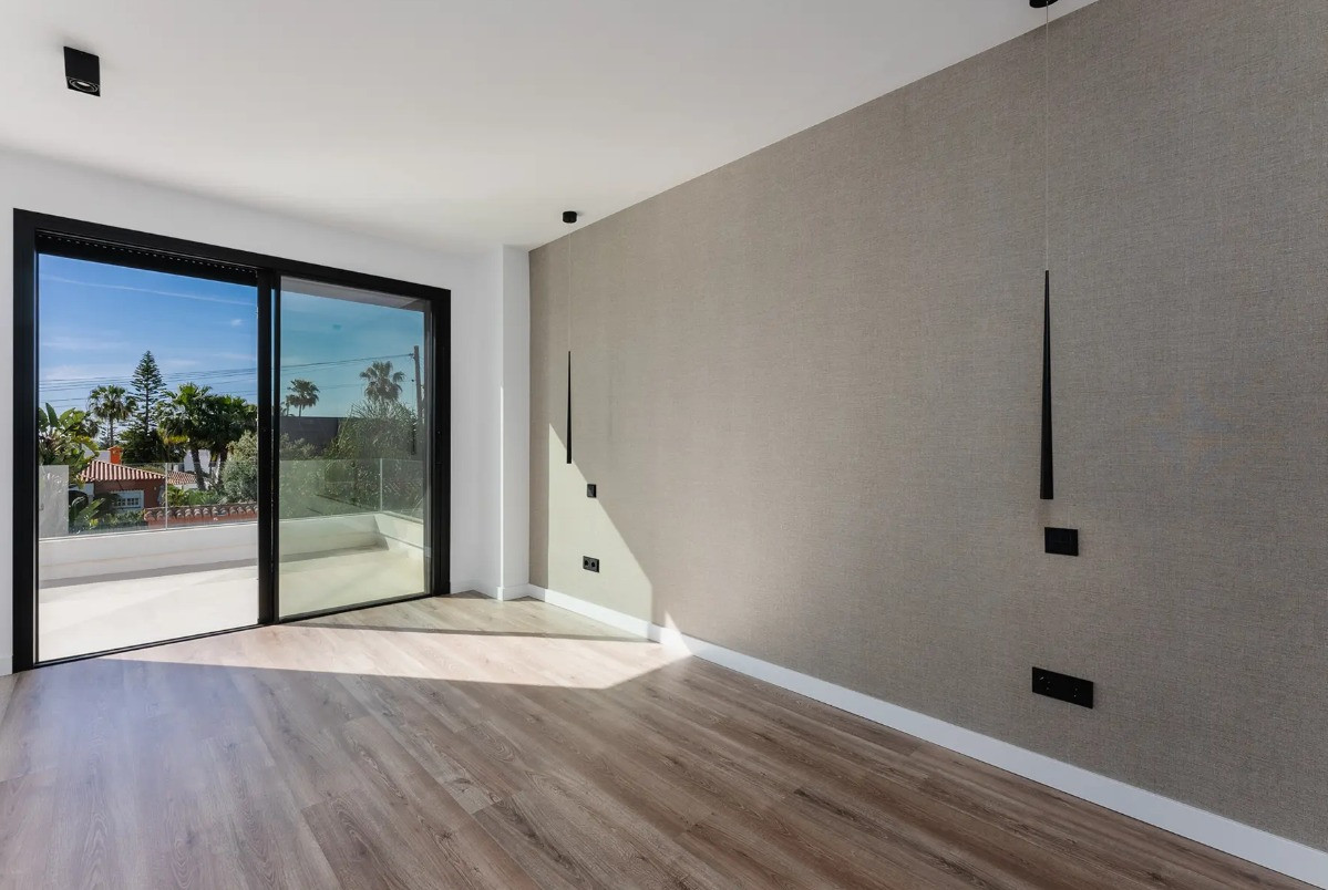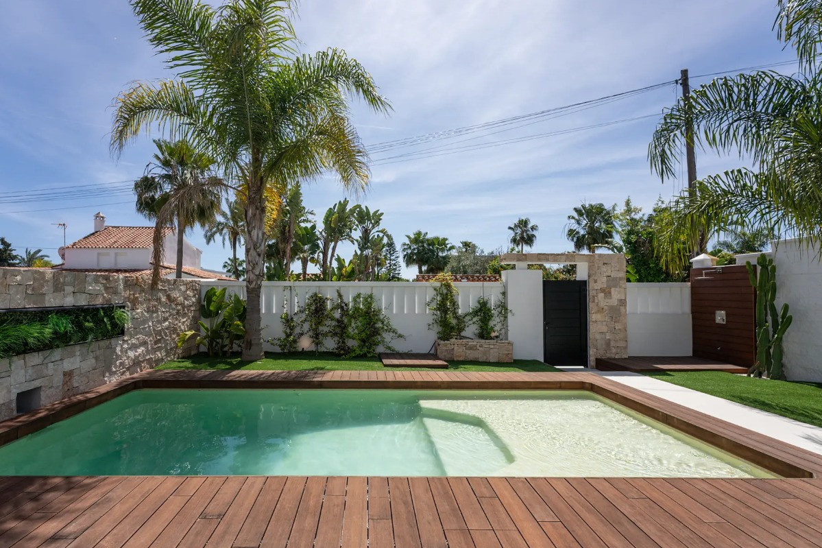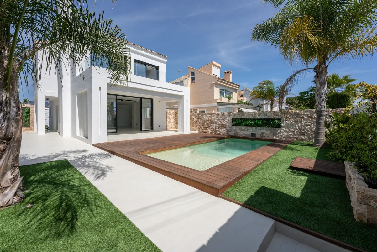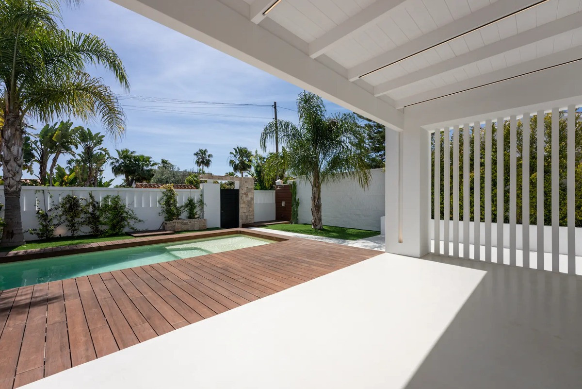 Villa, Costalita – Stunning Mediterranean-style villa with a modern touch, situated in a prime location just steps from the beach on Estepona’s New Golden Mile. The property boasts four bedrooms and four bathrooms, as well as a fully equipped kitchen with Siemens appliances. Enjoy a spacious terrace with a chill-out area, an outdoor shower, and a private swimming pool surrounded by meticulously landscaped gardens. The villa is located in a quiet and secure residential area of villas, just a short walk from the beautiful beaches of the New Golden Mile. Nearby, you’ll find fabulous beach restaurants, beach clubs, sports facilities, and prestigious golf courses.
