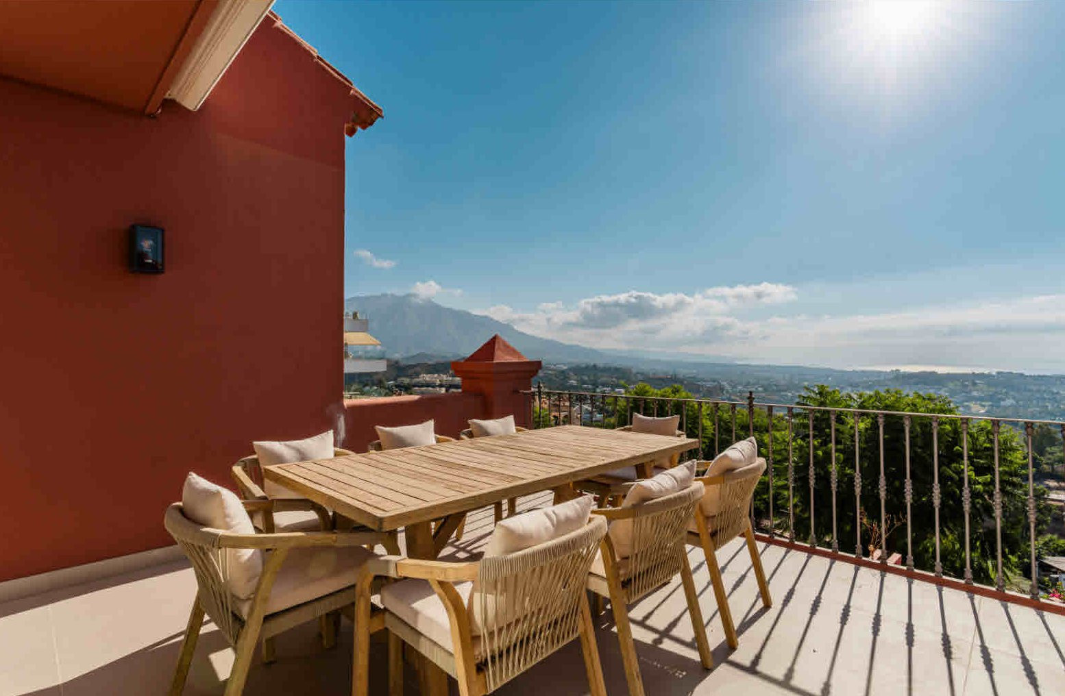Duplex Penthouse, Monte Halcones – Is an exceptional duplex penthouse for sale within the charming urbanization in Benahavís. South-facing and elevated, this residence captures panoramic views that sweep from the Mediterranean coastline to the surrounding mountains, a daily backdrop of natural beauty to enjoy from its expansive terraces. This home brings together contemporary architecture, luxury finishes, and the comfort of modern functionality. Completely renovated Developments, reflects Scandinavian-inspired elegance with a focus on clean lines and natural light. Chevron herringbone wood flooring, bespoke carpentry, and high-performance Cortizo windows set the tone for quality throughout. Every element of the design has been considered to create a property that is both visually striking and highly practical for everyday living.