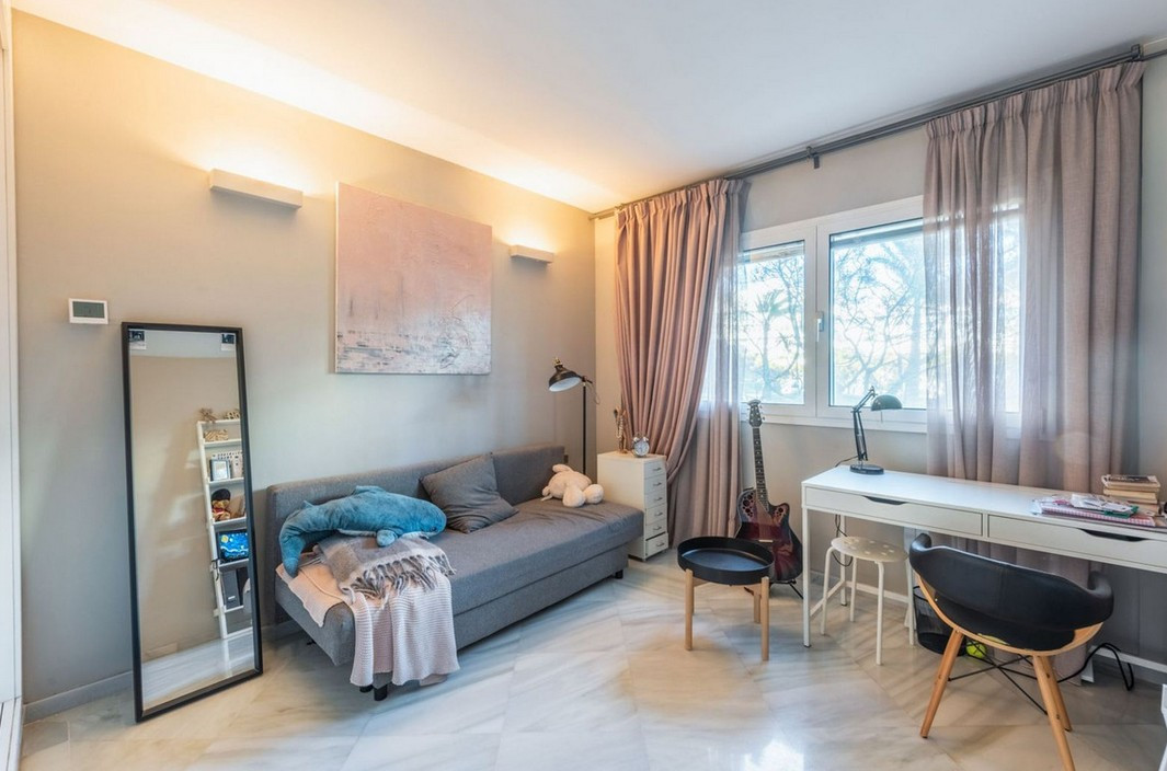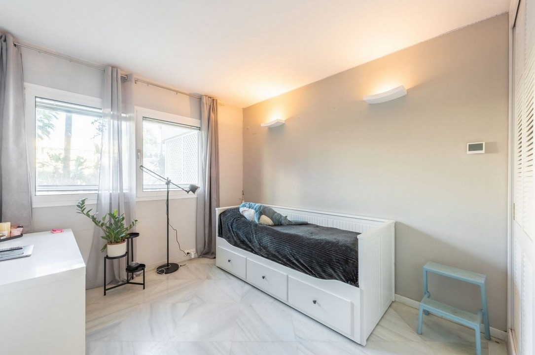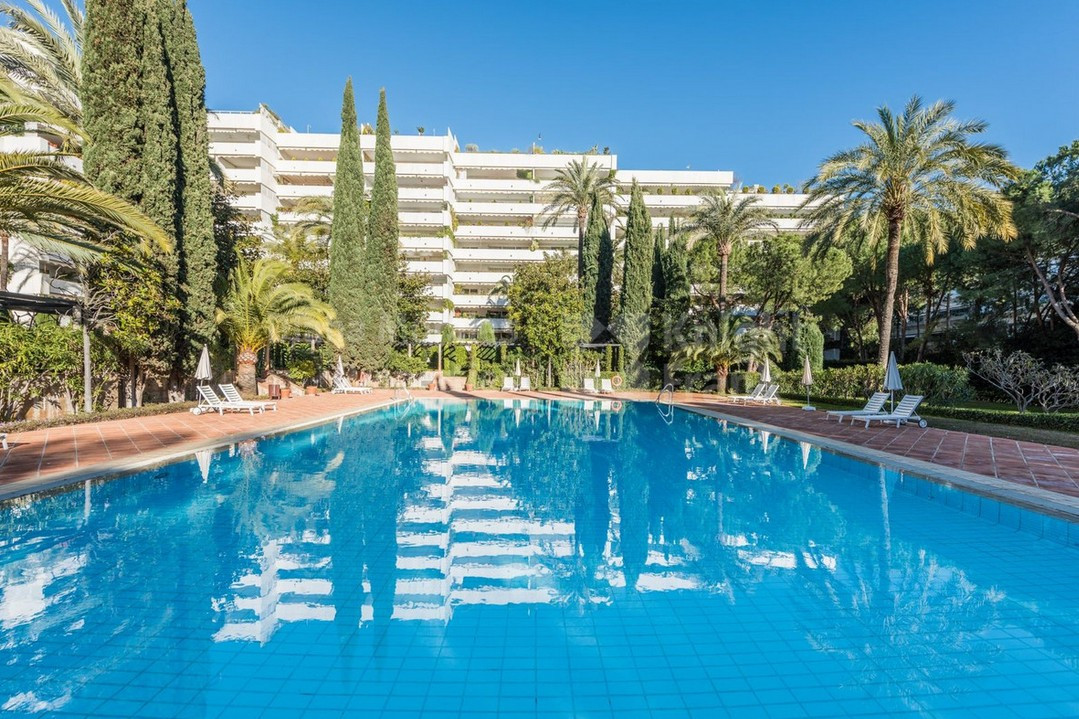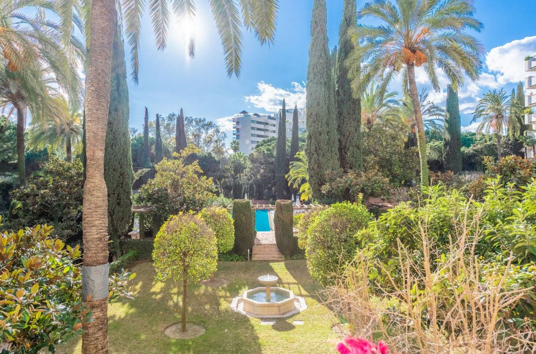 Appartement, Don Gonzalo – Spacious apartment on the second line of the Paseo Maritimo in Marbella. Beautiful and very private apartment in the prestigious complex, located in the center of Marbella, on the second line of the beach and the famous Paseo Maritimo. The complex offers beautiful gardens with two swimming pools, one for children, 24 hour security and concierge service. There is als a new gym with SPA under construction. The apartment offers beautiful views to the garden and pool and has West orientation, it consists of an entrance that leads to the large living room with access to the terrace, the renovated kitchen with the laundry room, the master bedroom en-suite with access to the terrace, two other bedrooms with their bathrooms. The bathrooms are renovated. An ideal property for investment, permanent or vacation residence.