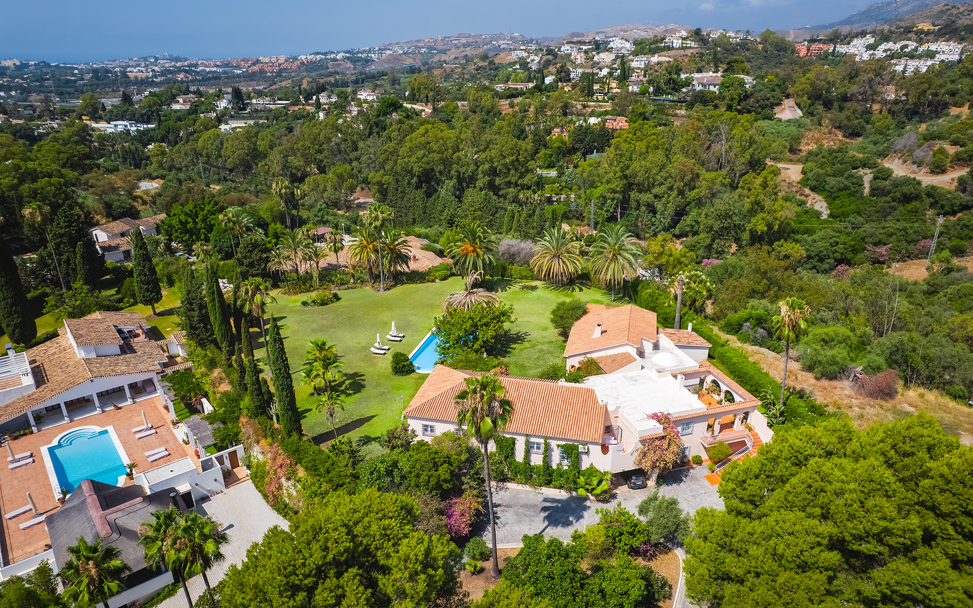 Villa, Fuente del Espanto – Charming Andalusian style villa ust 5 km from the beach and walking distance to San Pedro. Set on a 5,300 m² elevated plot with sea views, it blends timeless character with modern comfort. Features include a central courtyard, high-ceilinged living spaces, 4 en-suite bedrooms, wonderful mature gardens and a private pool. The lower level offers garage space for 5 cars and conversion potential. Surrounded by lush gardens, it’s a peaceful retreat near top amenities. Also a smart investment, with scope to build up to 4 additional villas.