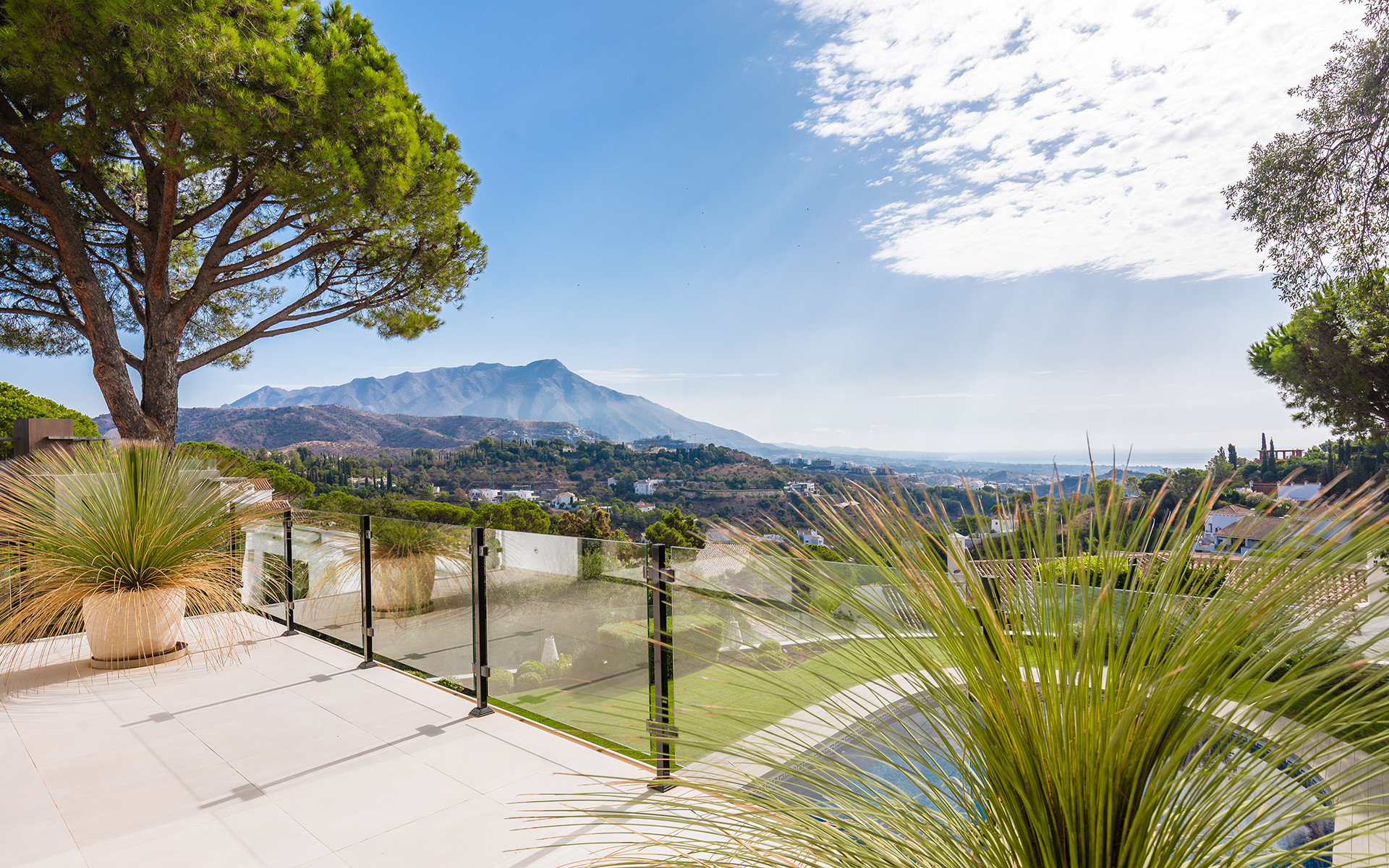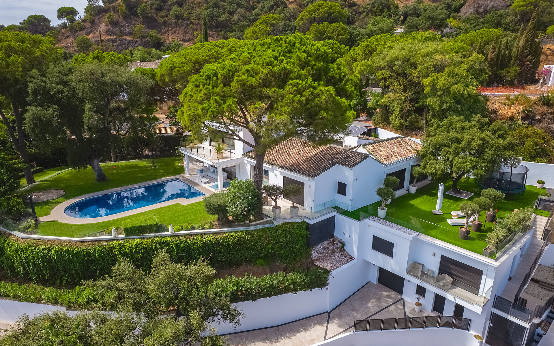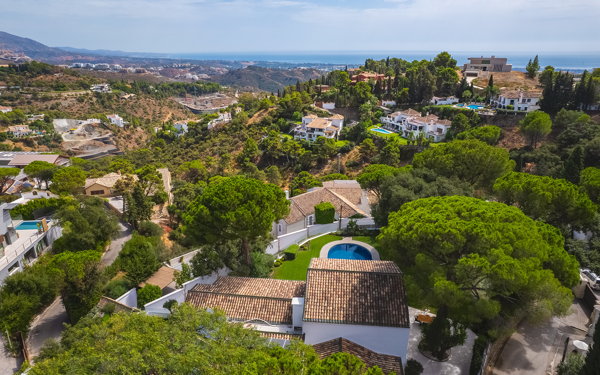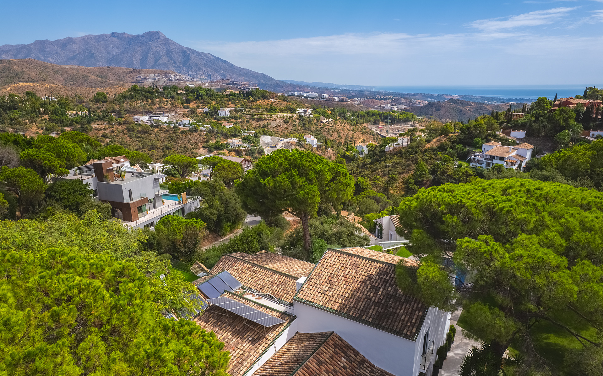 Villa, El Madroñal – Set within the prestigious residential in Benahavís, this elegant villa offers the perfect blend of privacy, nature, and breathtaking panoramic views of the mountains and Mediterranean coastline. The property sits on a generous 1,865 m² plot and features 598 m² of built space distributed over two levels. The main residence comprises five bedrooms and four bathrooms, plus a guest toilet. On the ground floor, you’ll find the living room, dining area, and main kitchen with direct access to spacious terraces and the garden. Just behind it, a convenient summer kitchen provides additional space for cooking and entertaining. This level also includes four en-suite bedrooms, a laundry room, and a storage area. The upper floor is dedicated to the master suite, which offers a bright bedroom, a bathroom with bathtub and shower, a walk-in wardrobe, and a private terrace with stunning views. An independent guest house adds further accommodation, featuring three bedrooms and three bathrooms across two levels, as well as living areas and a kitchen — ensuring total privacy for visitors or staff. Outdoors, the villa boasts an inviting swimming pool, multiple terraces ideal for al fresco dining and relaxation, and a landscaped garden. Parking facilities include a closed garage and two additional covered spaces. Is renowned for its exclusivity, privacy, and unmatched natural surroundings. Despite its serene atmosphere, it is only a short drive from Marbella, Puerto Banús, beaches, renowned golf courses, international schools, and essential services.