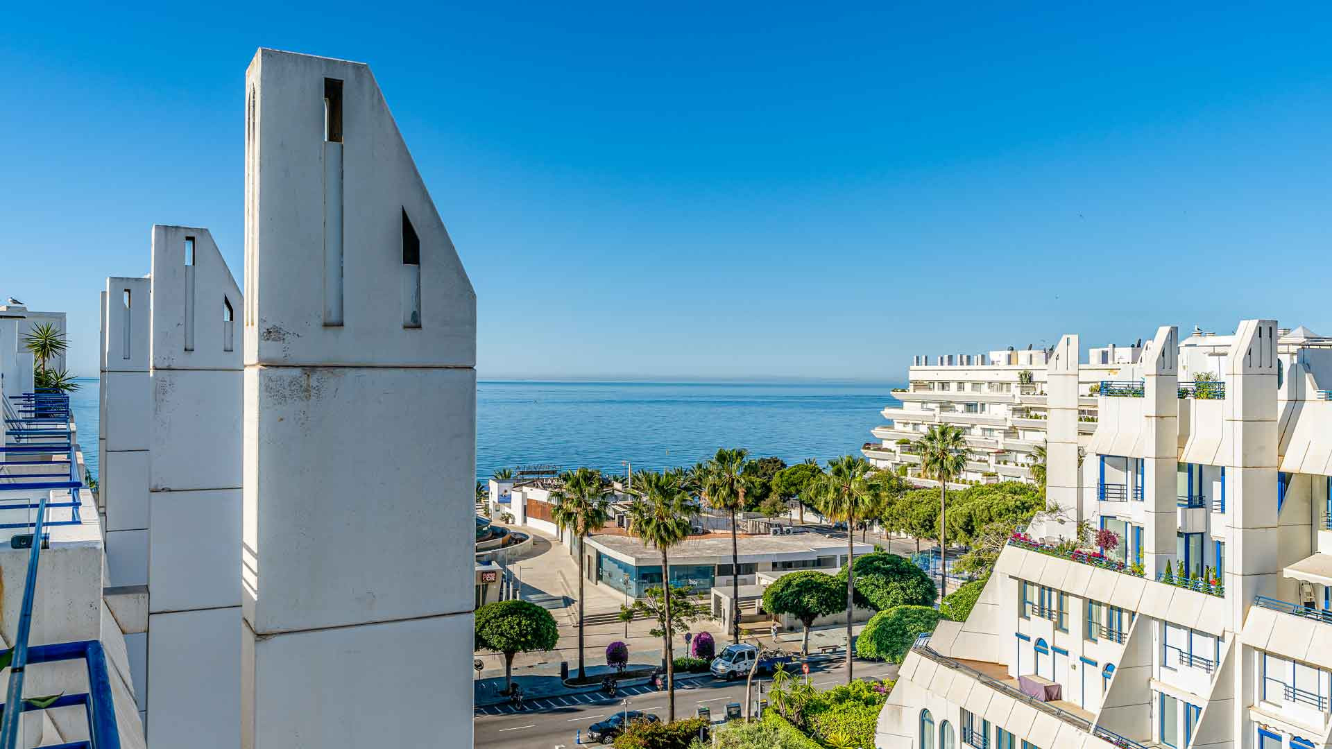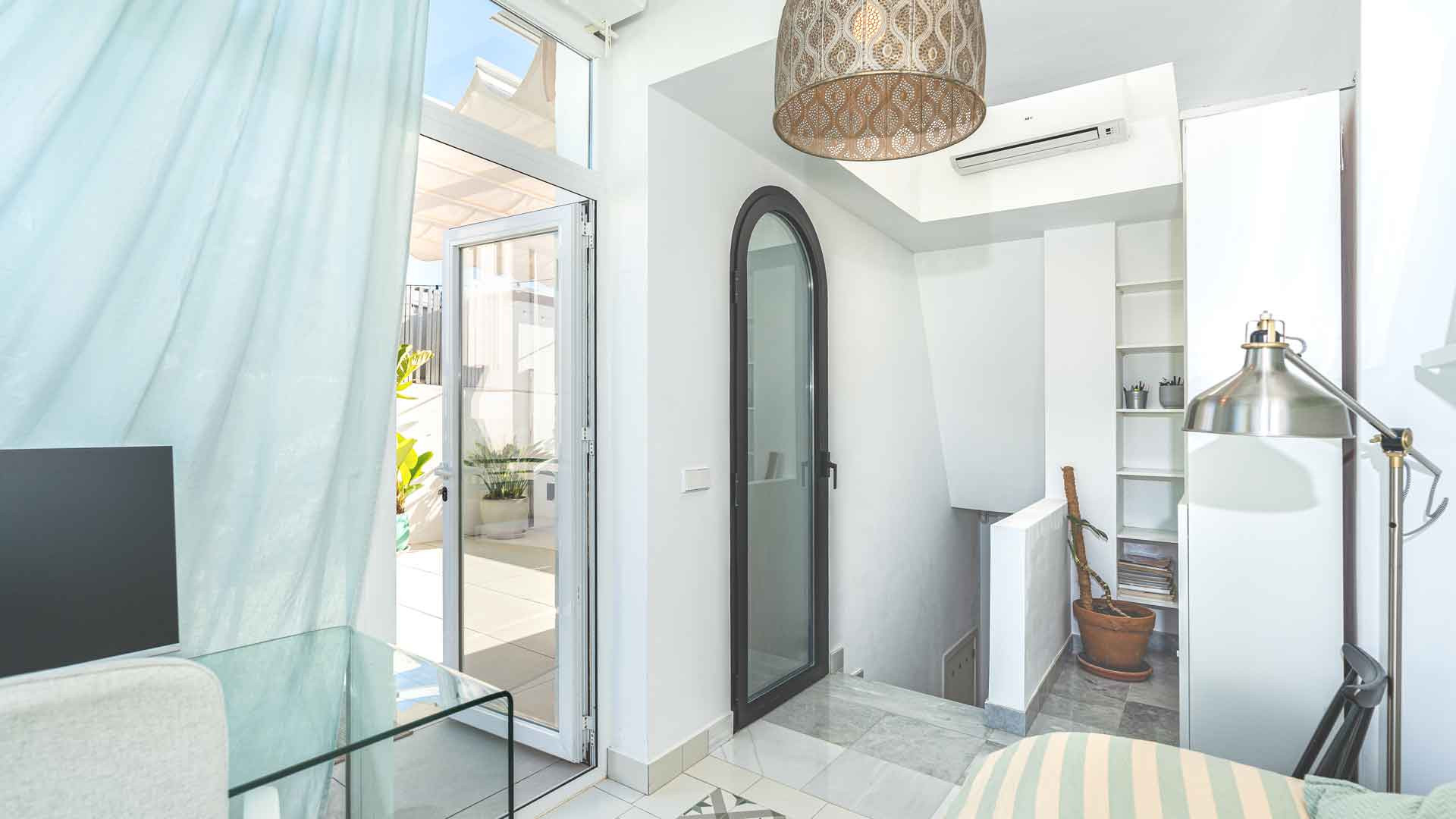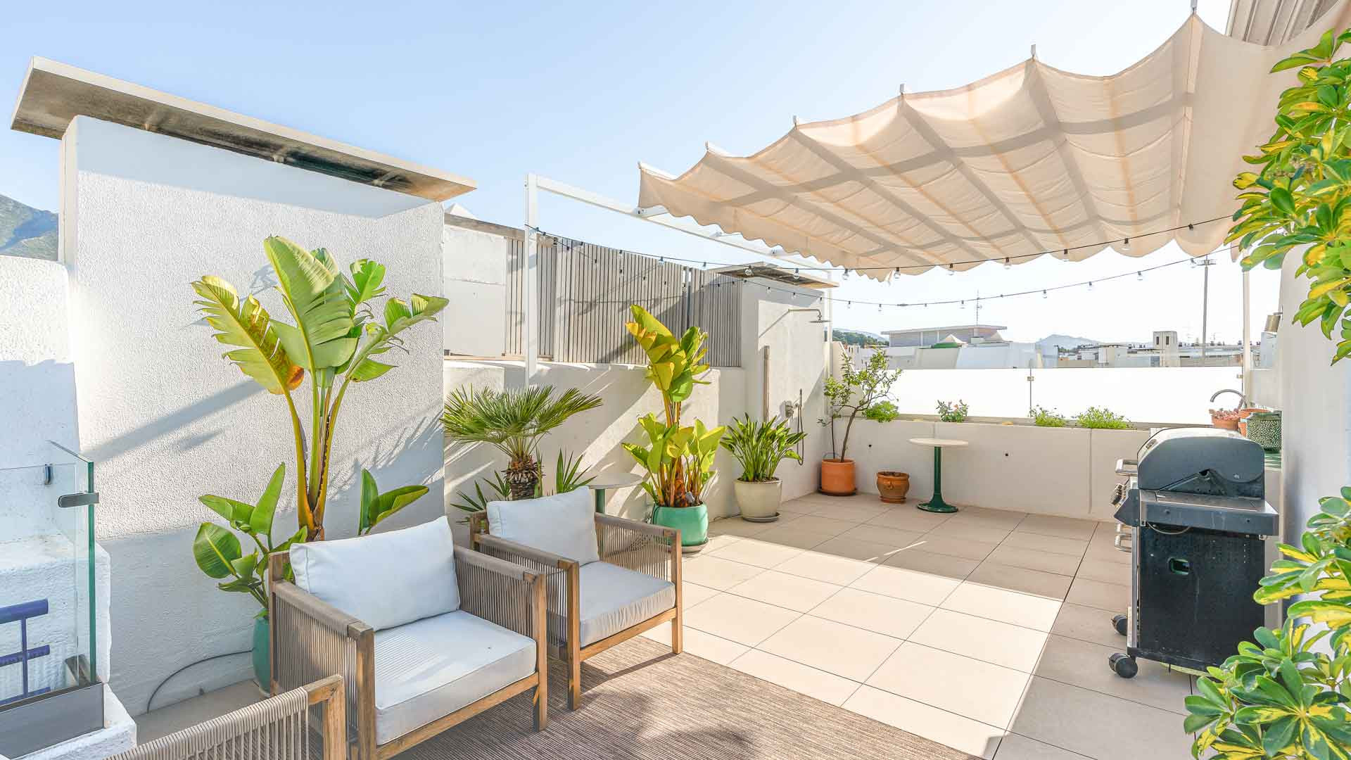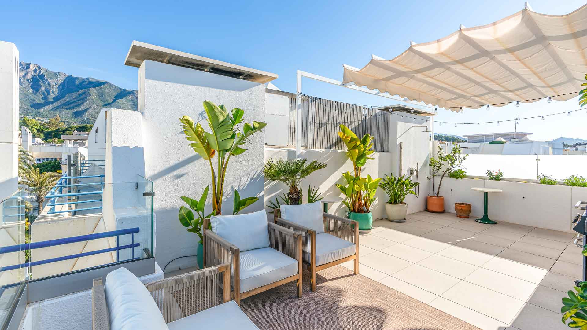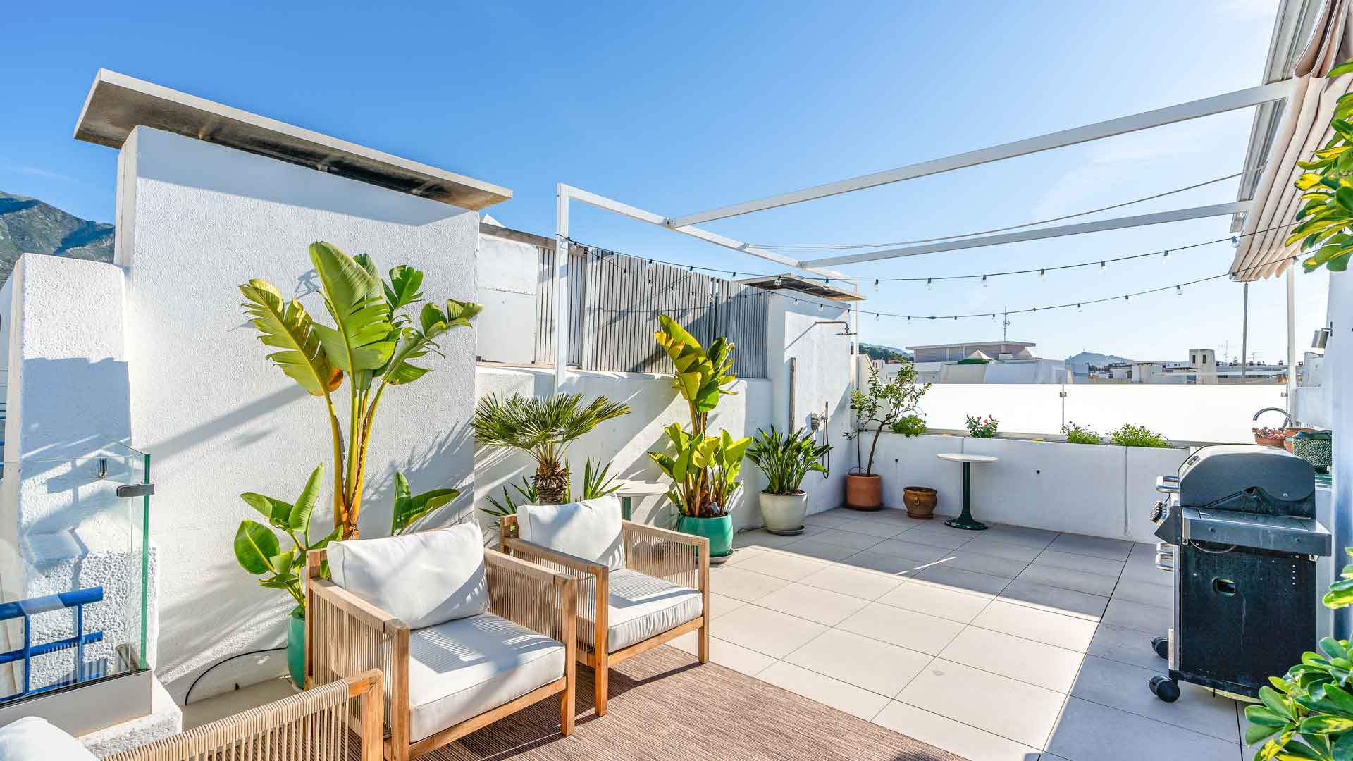 Appartement Terrasse, Marbella House – Penthouse in Marbella urbanization with sea views for sale. Located in the second line beach complex in Marbella, this penthouse offers an unbeatable combination of luxury, privacy and sea views. Situated just steps away from the Paseo Maritimo, this completely refurbished penthouse is located in one of the most desirable areas of Marbella. With a privileged orientation, each floor is designed to make the most of the surroundings, natural light and views of the Mediterranean. On the main floor, the open-plan living room opens onto a spacious terrace, ideal for relaxing or entertaining outdoors. The modern and fully equipped kitchen is stylishly integrated into the overall design of the property, offering functionality and elegance. On the same floor there is a toilet with natural light.