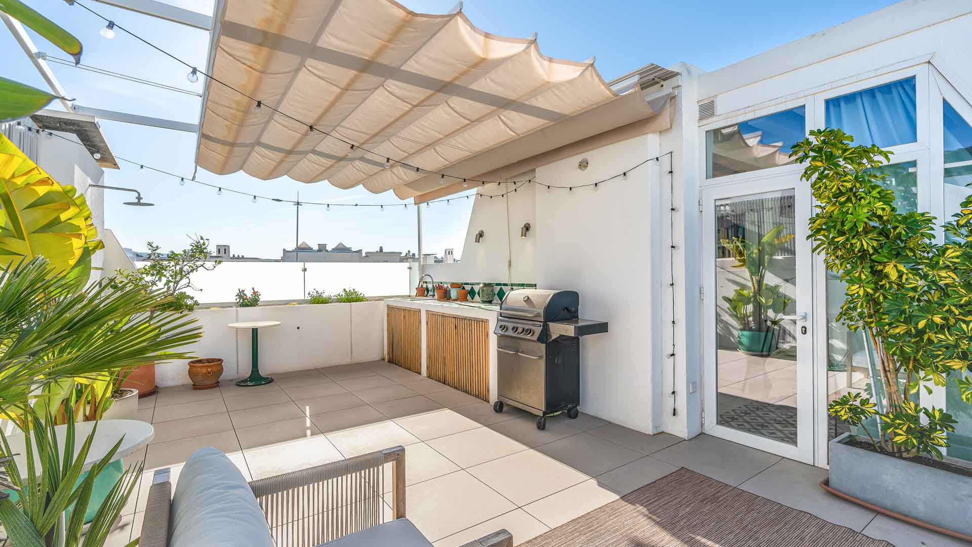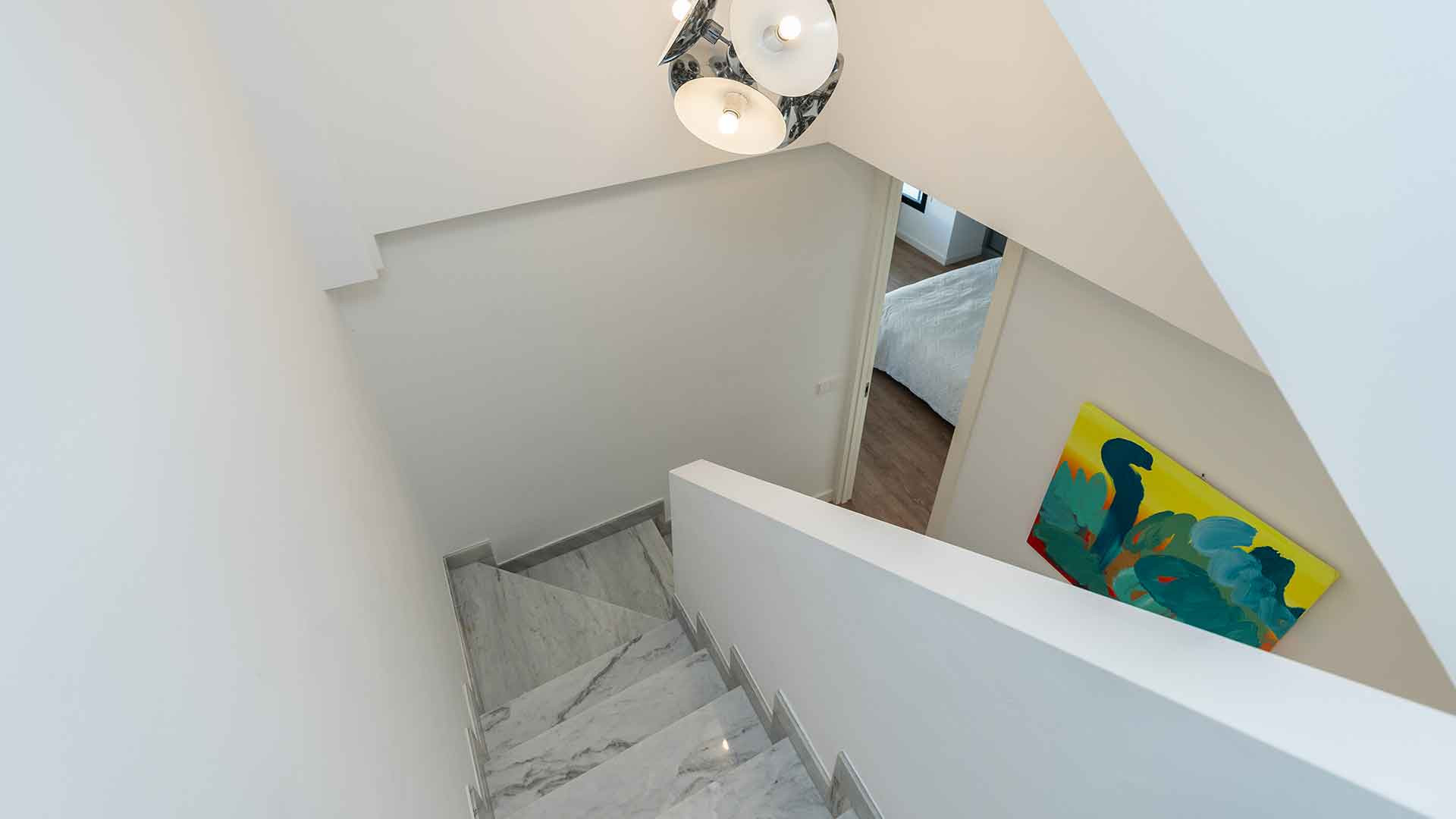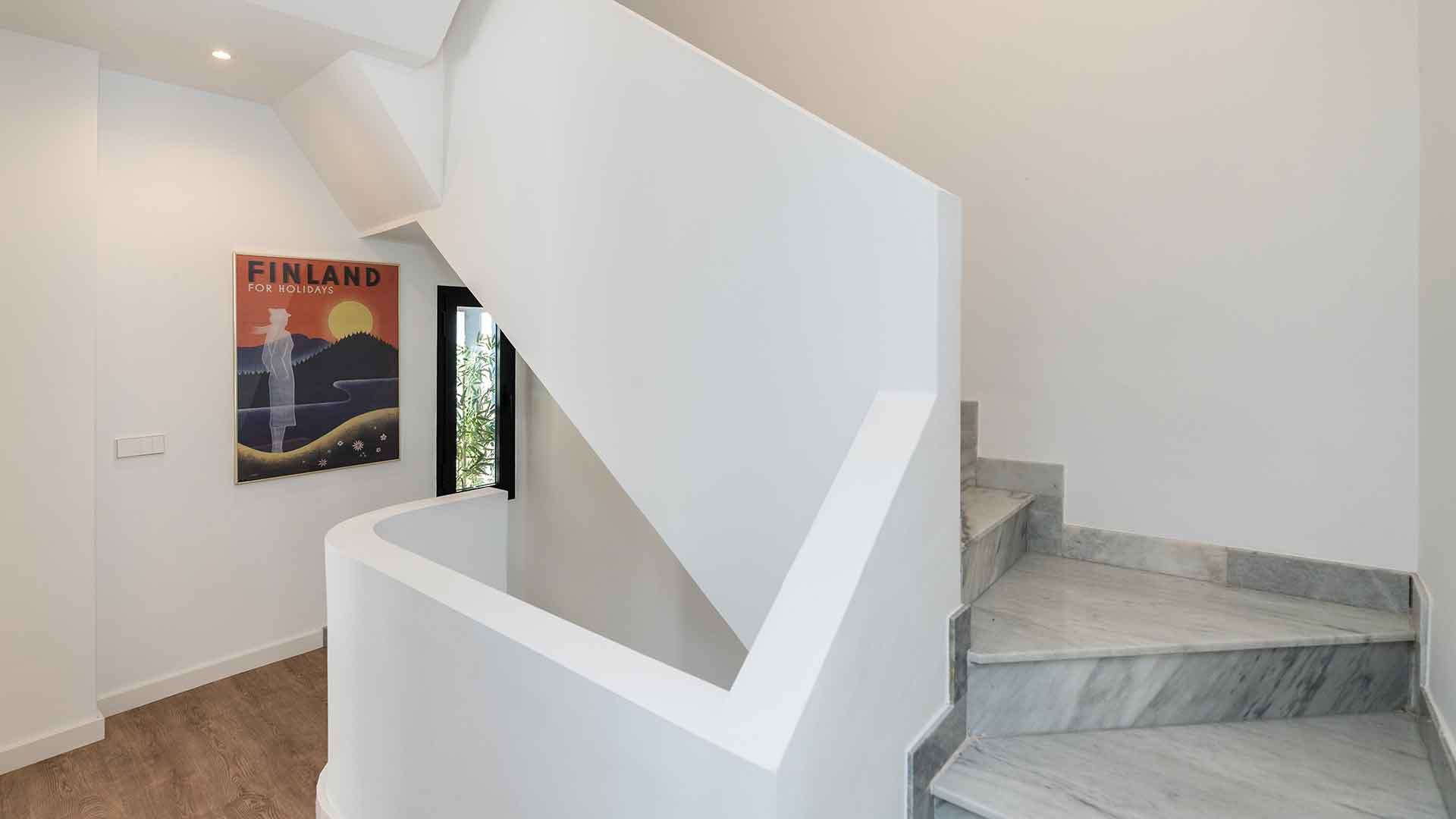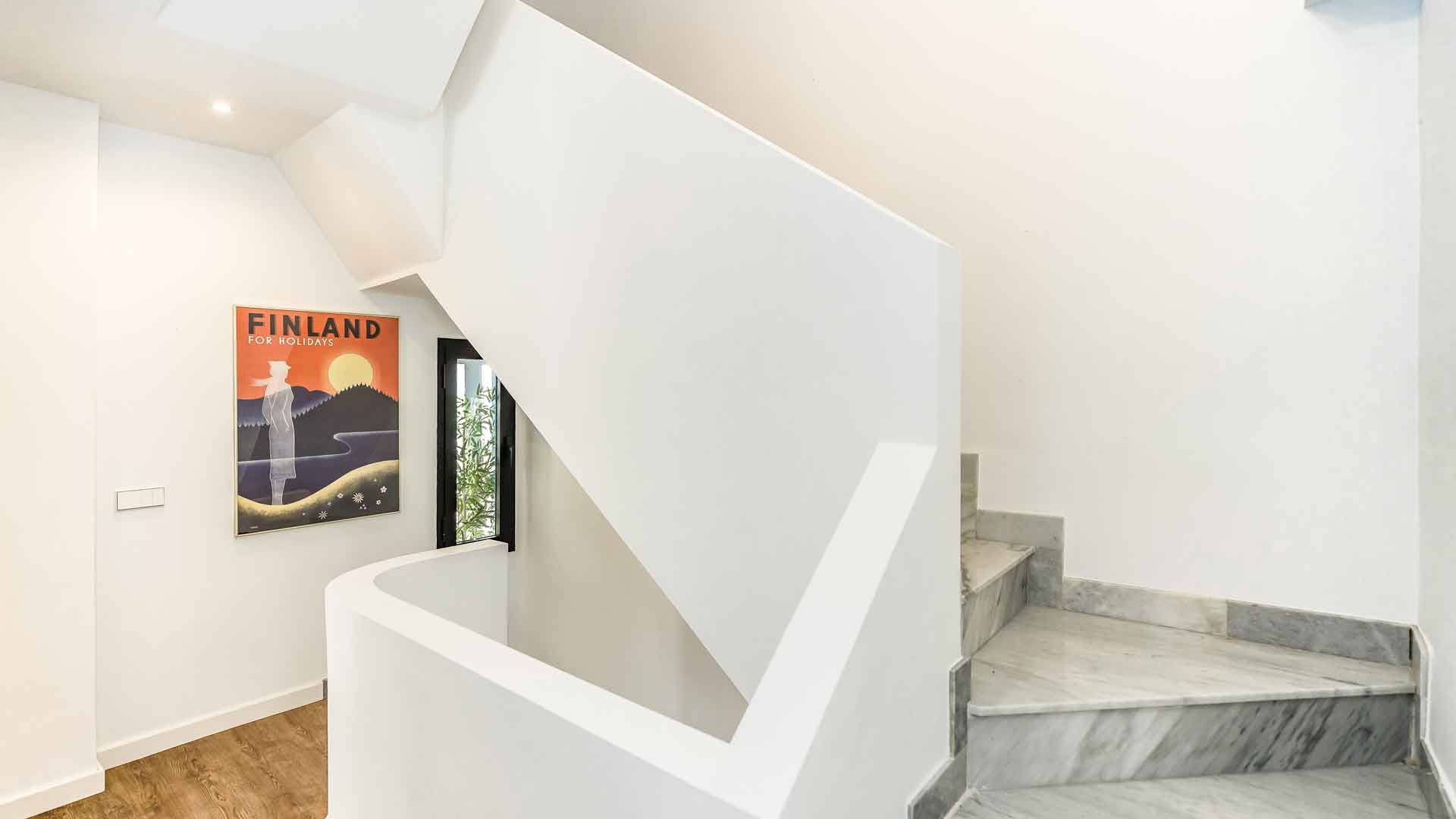 Appartement Terrasse, Marbella House – Penthouse in Marbella urbanization with sea views for sale. Located in the second line beach complex in Marbella, this penthouse offers an unbeatable combination of luxury, privacy and sea views. Situated just steps away from the Paseo Maritimo, this completely refurbished penthouse is located in one of the most desirable areas of Marbella. With a privileged orientation, each floor is designed to make the most of the surroundings, natural light and views of the Mediterranean. On the main floor, the open-plan living room opens onto a spacious terrace, ideal for relaxing or entertaining outdoors. The modern and fully equipped kitchen is stylishly integrated into the overall design of the property, offering functionality and elegance. On the same floor there is a toilet with natural light.