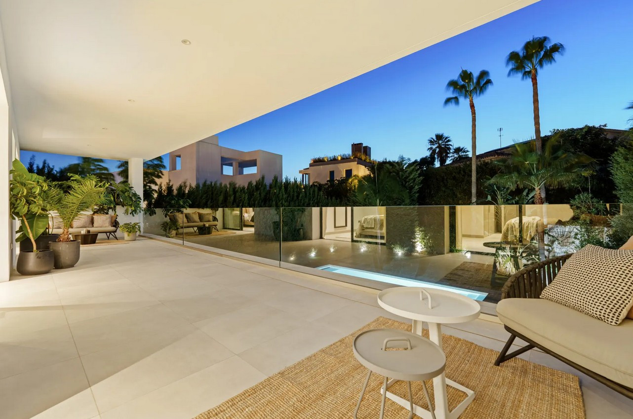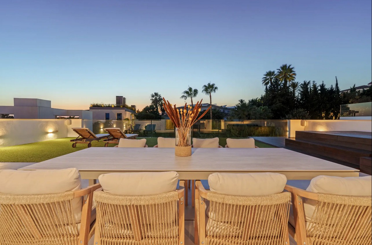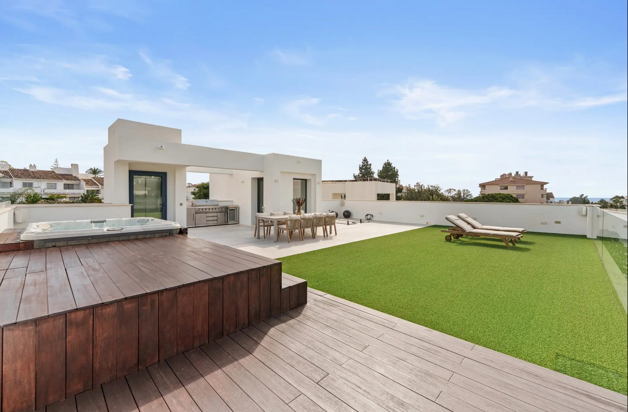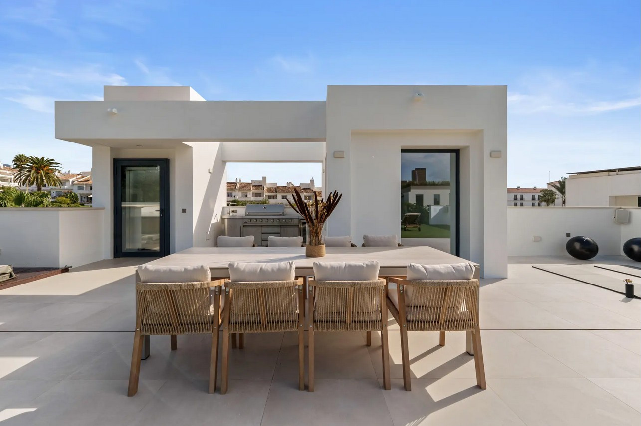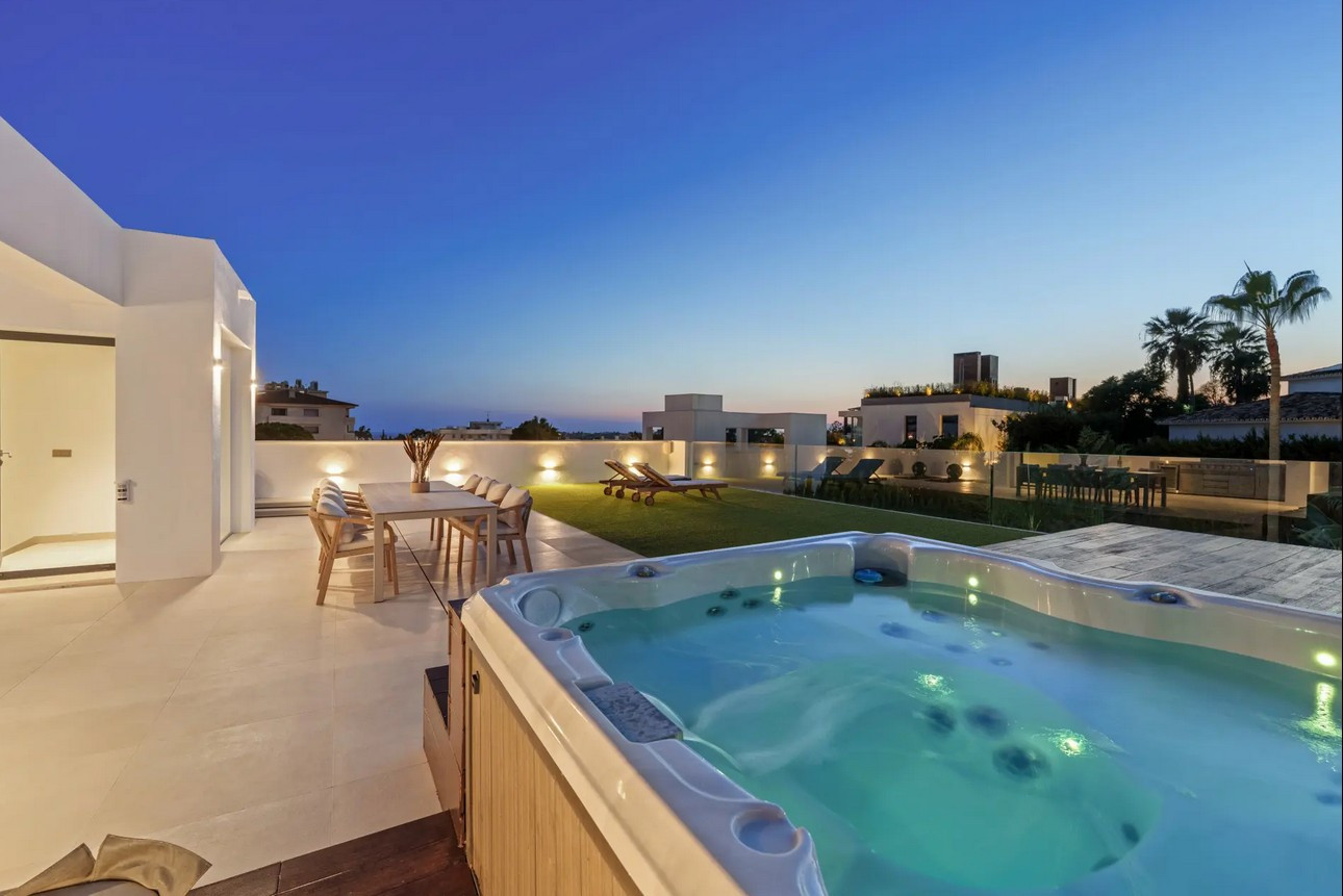 Villa, Nueva Andalucia – Located in the sought-after area of Nueva Andalucía, just minutes from Puerto Banús, is a beautifully presented contemporary villa combining style, comfort, and functionality. The home features open-plan living areas with large sliding doors that seamlessly connect the interior with the outdoor spaces. Natural light fills the spacious lounge and dining areas, while the modern kitchen is equipped with sleek cabinetry and a generous island for casual dining. The property offers multiple stunning terraces and a private garden with a pool, creating the perfect setting for relaxation and entertaining. The rooftop solarium adds an exceptional touch, complete with a jacuzzi, outdoor dining area, and built-in barbecue, all framed by panoramic views of the surrounding neighbourhood. Each bedroom is designed with sophistication and warmth, featuring fitted wardrobes and elegant ensuite bathrooms. Additional highlights include a private cinema and entertainment room, a fully equipped home gym, and a secure private garage.Is an ideal modern residence in one of Marbella’s most desirable locations, offering refined living close to beaches, golf, and all amenities.