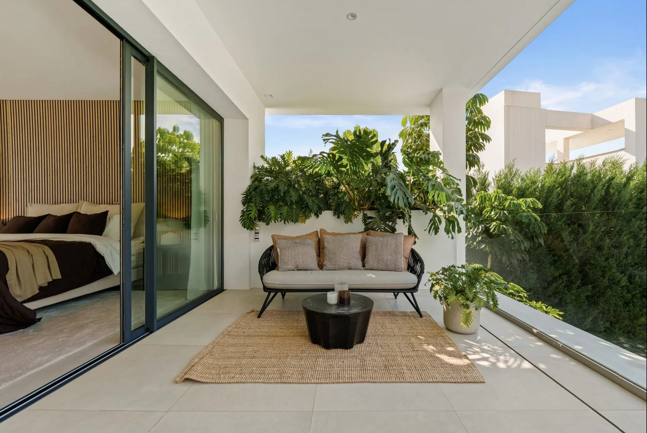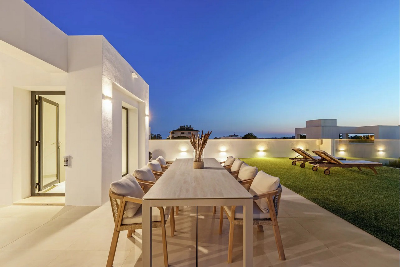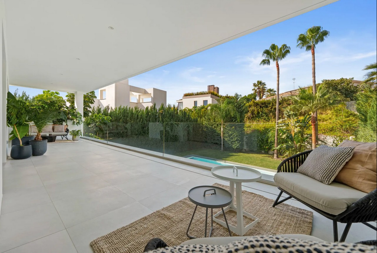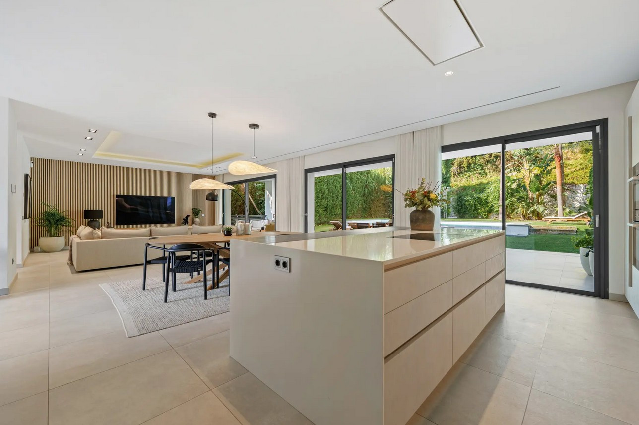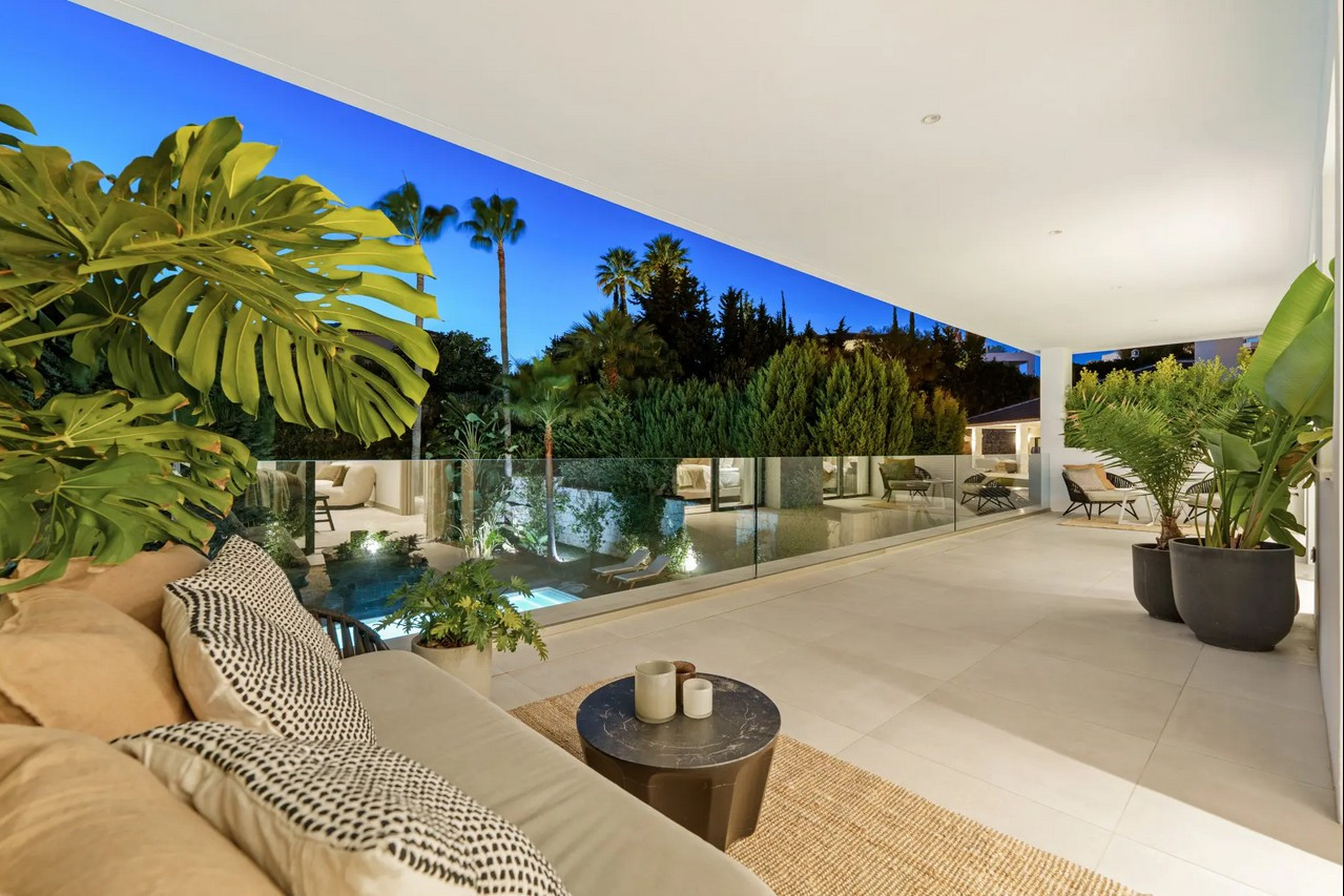 Villa, Nueva Andalucia – Located in the sought-after area of Nueva Andalucía, just minutes from Puerto Banús, is a beautifully presented contemporary villa combining style, comfort, and functionality. The home features open-plan living areas with large sliding doors that seamlessly connect the interior with the outdoor spaces. Natural light fills the spacious lounge and dining areas, while the modern kitchen is equipped with sleek cabinetry and a generous island for casual dining. The property offers multiple stunning terraces and a private garden with a pool, creating the perfect setting for relaxation and entertaining. The rooftop solarium adds an exceptional touch, complete with a jacuzzi, outdoor dining area, and built-in barbecue, all framed by panoramic views of the surrounding neighbourhood. Each bedroom is designed with sophistication and warmth, featuring fitted wardrobes and elegant ensuite bathrooms. Additional highlights include a private cinema and entertainment room, a fully equipped home gym, and a secure private garage.Is an ideal modern residence in one of Marbella’s most desirable locations, offering refined living close to beaches, golf, and all amenities.