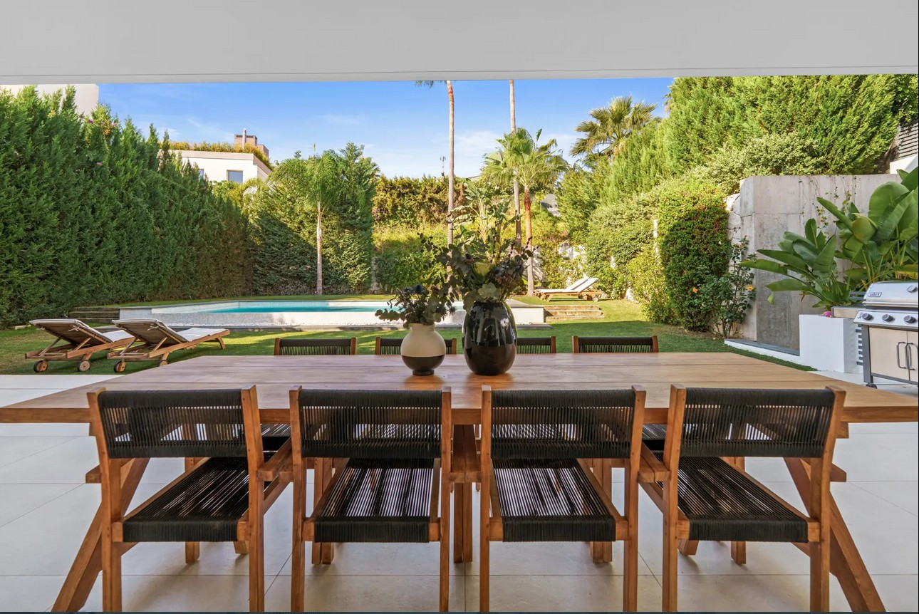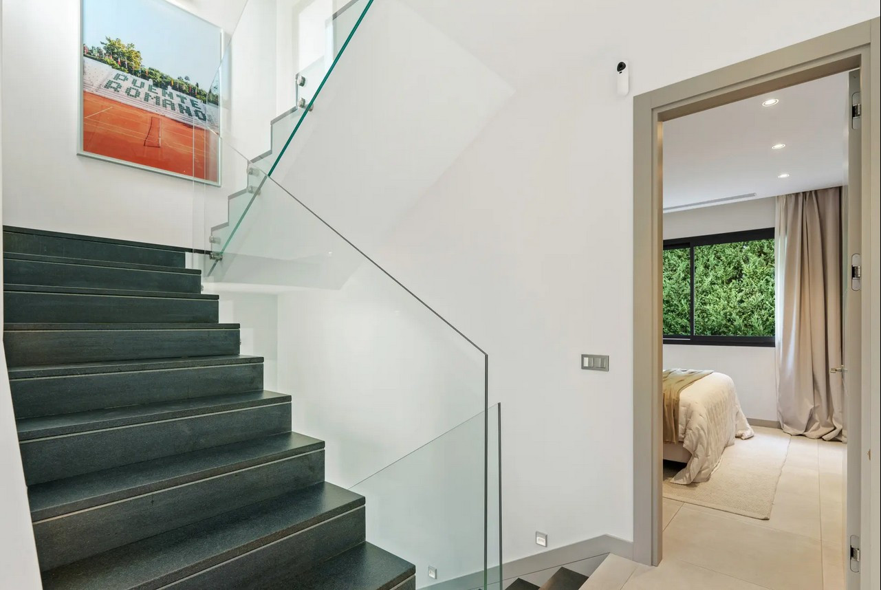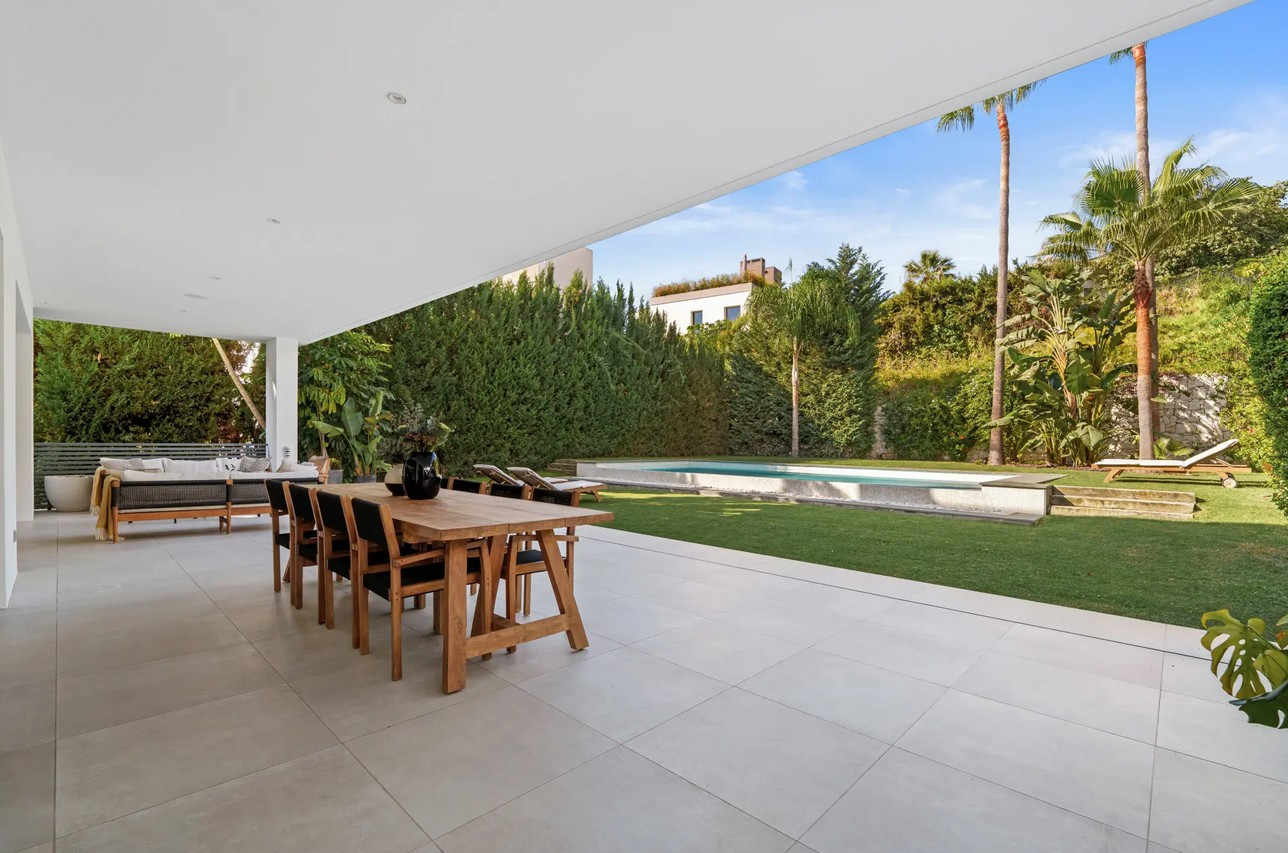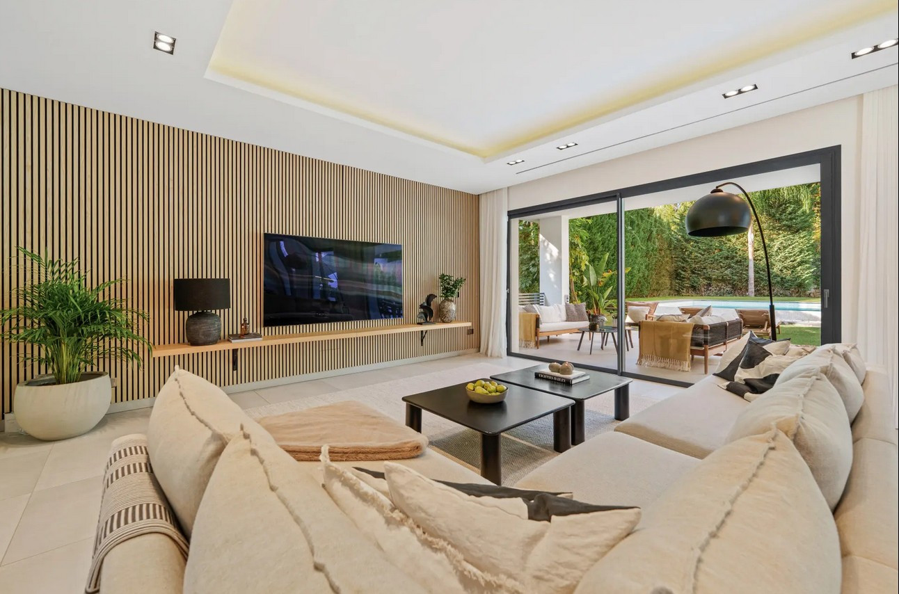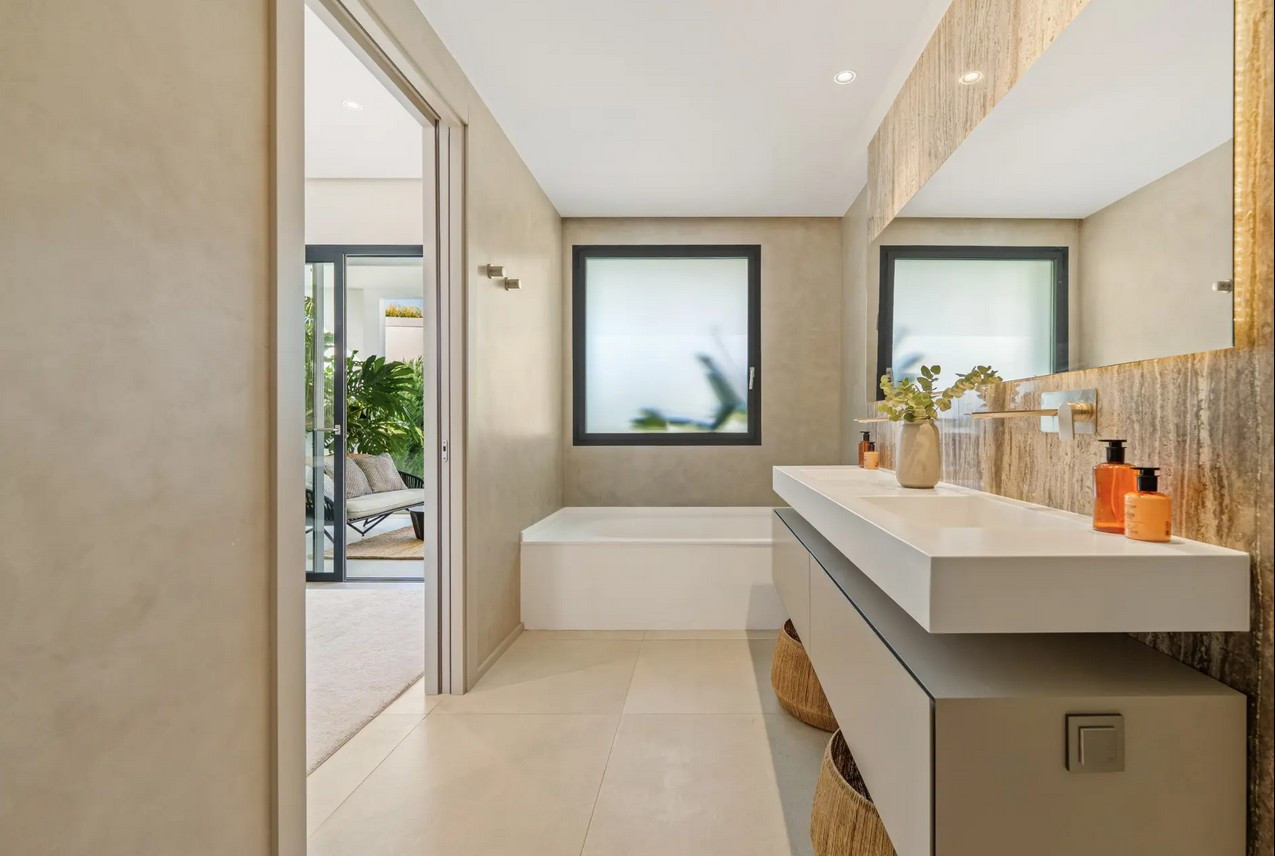 Villa, Nueva Andalucia – Located in the sought-after area of Nueva Andalucía, just minutes from Puerto Banús, is a beautifully presented contemporary villa combining style, comfort, and functionality. The home features open-plan living areas with large sliding doors that seamlessly connect the interior with the outdoor spaces. Natural light fills the spacious lounge and dining areas, while the modern kitchen is equipped with sleek cabinetry and a generous island for casual dining. The property offers multiple stunning terraces and a private garden with a pool, creating the perfect setting for relaxation and entertaining. The rooftop solarium adds an exceptional touch, complete with a jacuzzi, outdoor dining area, and built-in barbecue, all framed by panoramic views of the surrounding neighbourhood. Each bedroom is designed with sophistication and warmth, featuring fitted wardrobes and elegant ensuite bathrooms. Additional highlights include a private cinema and entertainment room, a fully equipped home gym, and a secure private garage.Is an ideal modern residence in one of Marbella’s most desirable locations, offering refined living close to beaches, golf, and all amenities.