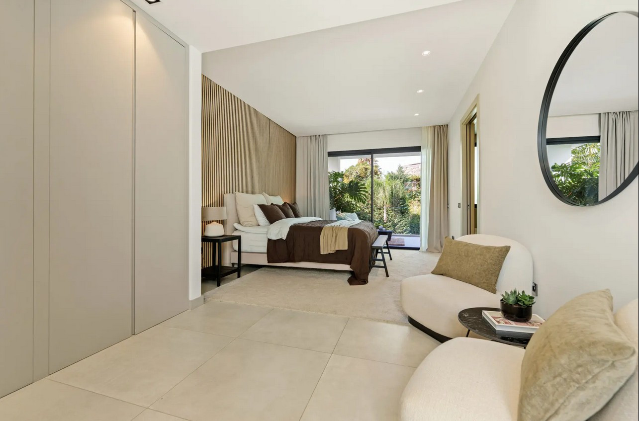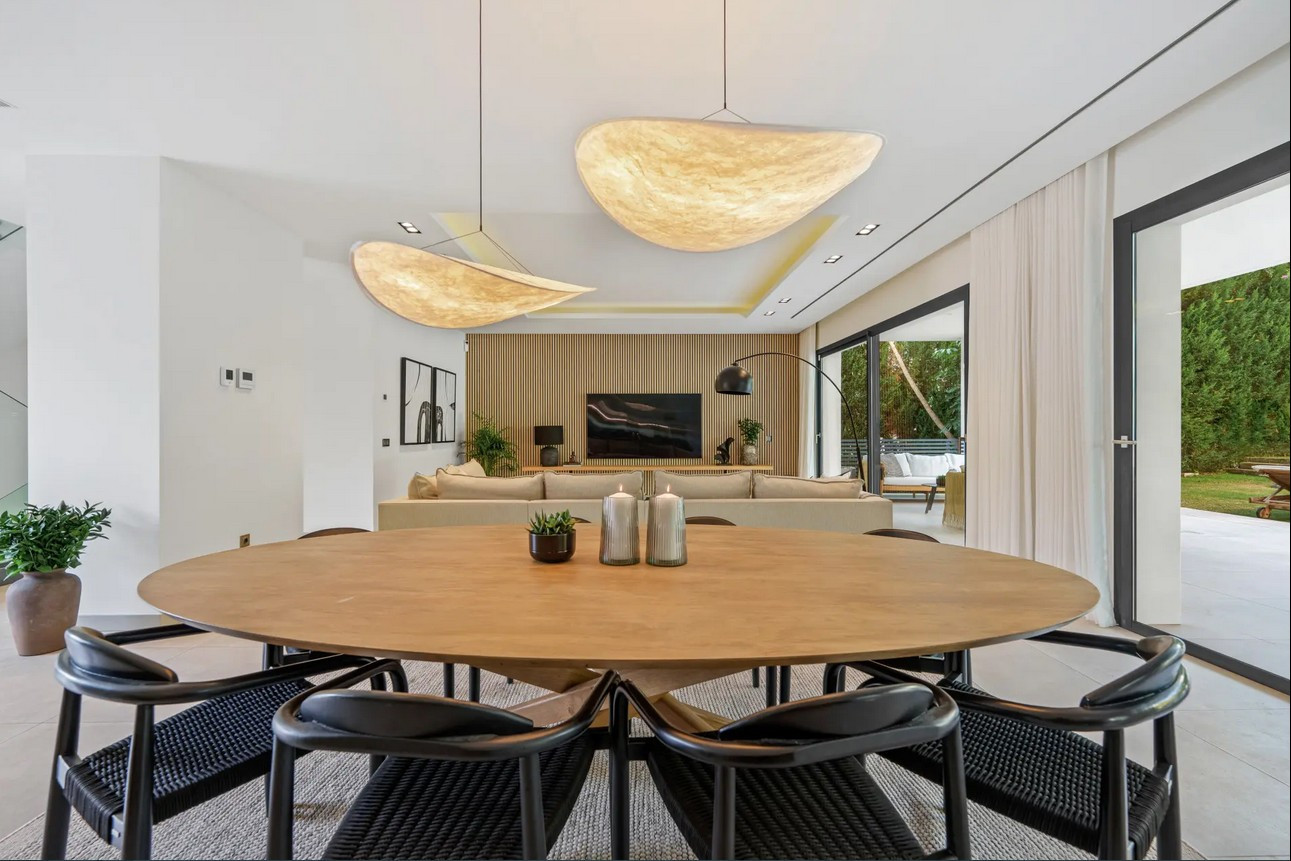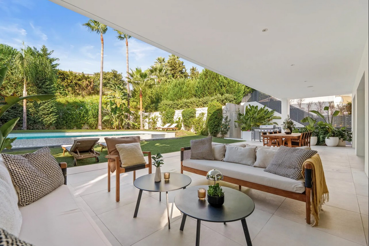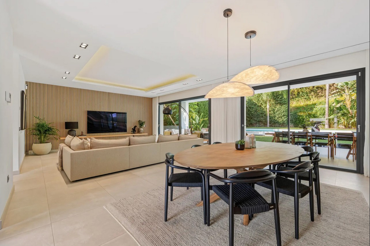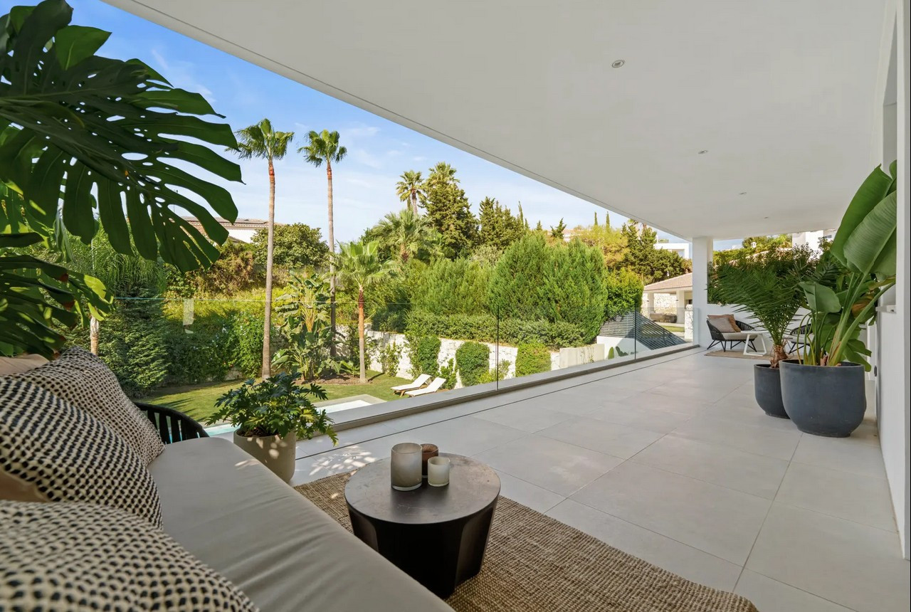 Villa, Nueva Andalucia – Located in the sought-after area of Nueva Andalucía, just minutes from Puerto Banús, is a beautifully presented contemporary villa combining style, comfort, and functionality. The home features open-plan living areas with large sliding doors that seamlessly connect the interior with the outdoor spaces. Natural light fills the spacious lounge and dining areas, while the modern kitchen is equipped with sleek cabinetry and a generous island for casual dining. The property offers multiple stunning terraces and a private garden with a pool, creating the perfect setting for relaxation and entertaining. The rooftop solarium adds an exceptional touch, complete with a jacuzzi, outdoor dining area, and built-in barbecue, all framed by panoramic views of the surrounding neighbourhood. Each bedroom is designed with sophistication and warmth, featuring fitted wardrobes and elegant ensuite bathrooms. Additional highlights include a private cinema and entertainment room, a fully equipped home gym, and a secure private garage.Is an ideal modern residence in one of Marbella’s most desirable locations, offering refined living close to beaches, golf, and all amenities.
