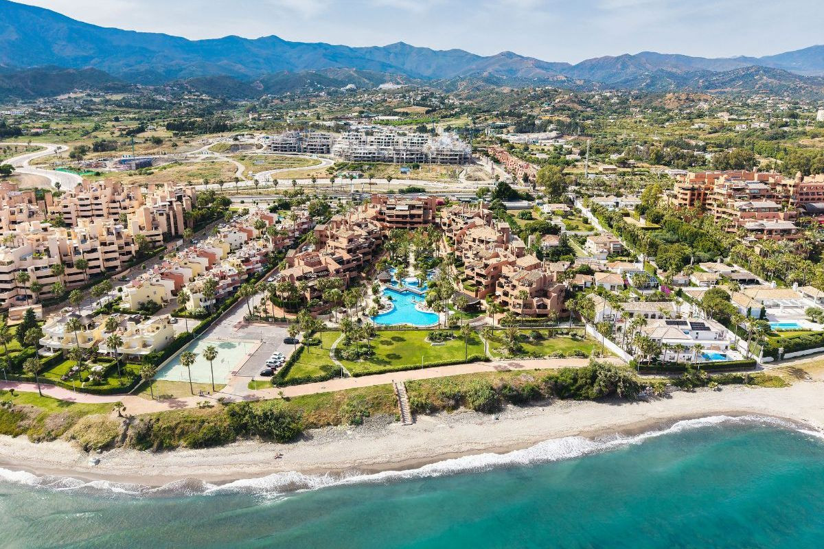 Appartement Terrasse, Mar Azul – This exceptional 3-bedroom penthouse in Estepona, offers a luxurious coastal lifestyle, combining elegance, comfort, and breathtaking sea views. Located on the sought-after New Golden Mile, is a prestigious beachfront urbanization next to the renowned Kempinski Hotel. Residents enjoy direct beach access and are just minutes from high-end boutiques, cafés, and restaurants. The charming Estepona town centre is only a 5-minute drive away. Just ten-minutes walk to luxurious Laguna Beach with several restaurants. One of the standout features of this unique penthouse is that it is built entirely on one level, offering ease of living and a seamless flow throughout the home. The highlight is the unusually large southwest-facing terrace, accessible directly from the living room. This expansive outdoor space includes a lounge area, space for sunbeds, and a glazed corner dining area that can be opened or closed depending on the season — ideal for year-round use and entertaining. Additionally, the apartment and terrace are equipped with 8 integrated Sonos speakers, providing premium-quality sound throughout. Inside, the property welcomes you with a bright and spacious open-plan living and dining area, bathed in natural light through floor-to-ceiling glass doors. The refurbished modern, fully fitted kitchen is equipped with high-end appliances, offering both functionality and style. Underfloor heating and aircondition in all rooms. There are three generously sized bedrooms, one of them en-suite and the other two sharing one bathroom. Providing comfort and privacy for family and guests alike. Two of the bedrooms has directly access to separate outdoor space. Additional features include two underground garage spaces, ensuring secure parking and two store rooms. From the garage there is an elevator with direct access to the entrance of the apartment.