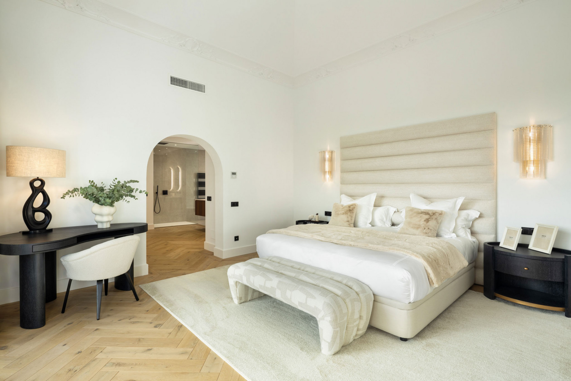 Villa, El Herrojo – Is an exceptional villa for sale in the prestigious gated community of Benahavis. Positioned on an elevated frontline golf plot, this landmark property harmoniously blends timeless Andalusian architecture with modern design, offering panoramic views across the La Quinta Golf Course toward the iconic La Concha mountain. The interior design and qualities of this brand new renovated property are nothing short of exceptional and stand as a refined statement of contemporary Mediterranean living. Spread across two levels and connected by a glass passenger lift, the residence ensures both comfort and full accessibility. A unique feature of this property is that all of the main living areas are laid out on the same floor spanning the kitchen, lounges, bedrooms, gymnasium and swimming pool to the generous external terraces that embrace the outdoor lifestyle of southern Spain. Two distinctive lounges provide versatility for family relaxation or social gatherings. Each has been furnished with custom-designed Eichholtz pieces, offering a refined yet welcoming atmosphere. The formal dining area leads to a bespoke KoK Studio kitchen fitted with Gaggenau appliances, natural wood cabinetry, and a secondary preparation area perfect for entertaining or everyday use. Throughout the property, Scandinavian oak and porcelain flooring, Fujitsu inverter air-conditioning, and underfloor heating.