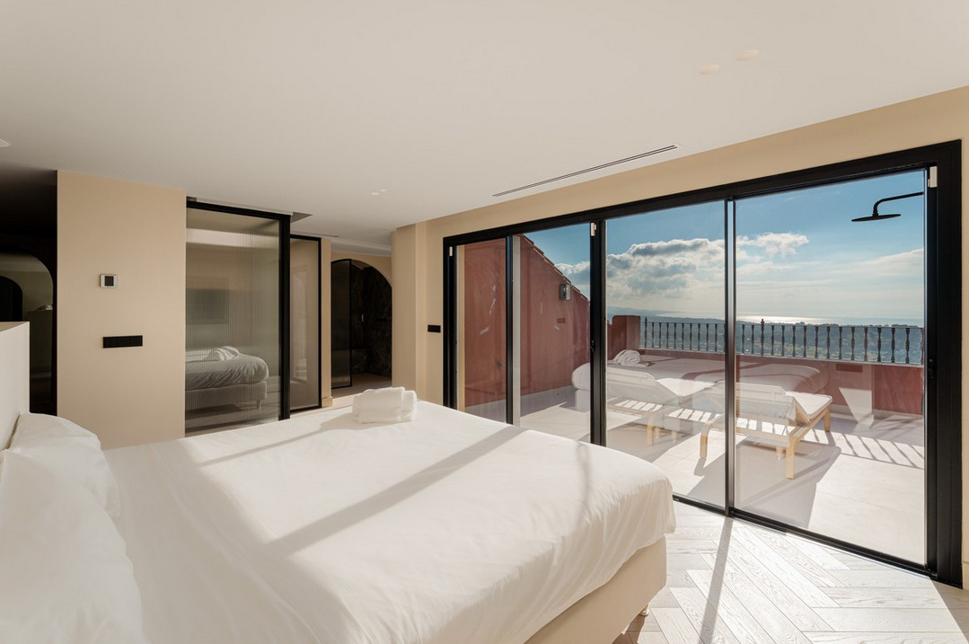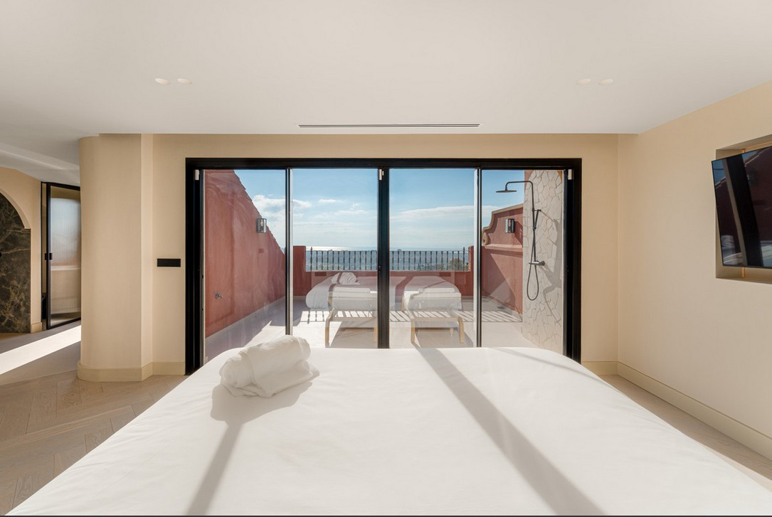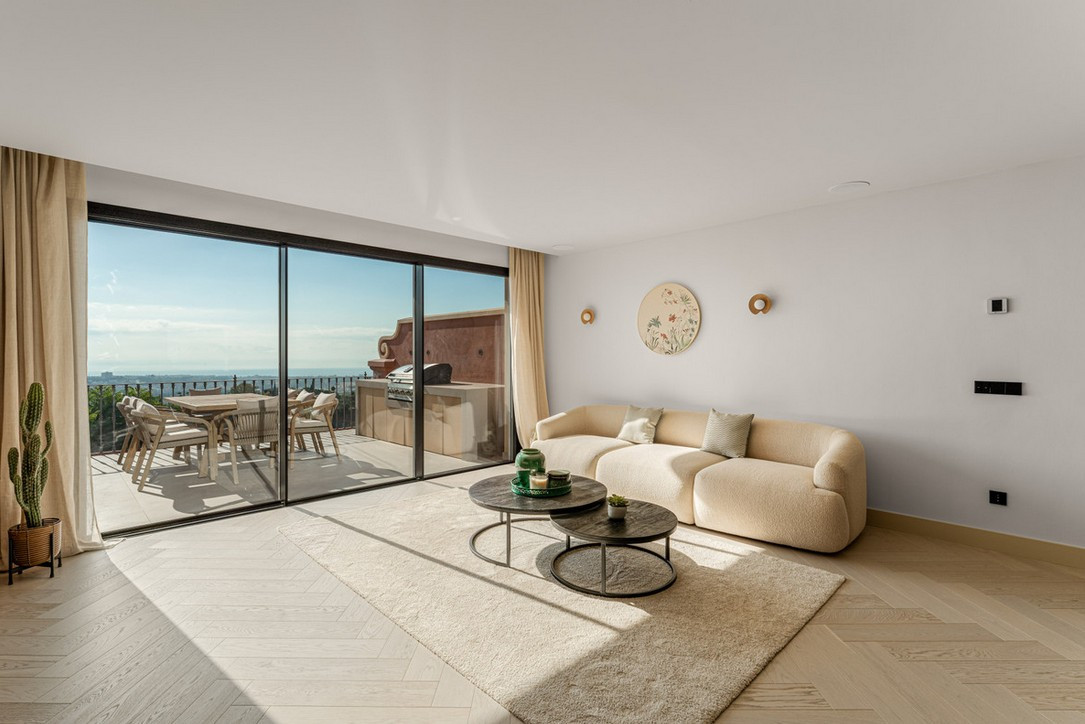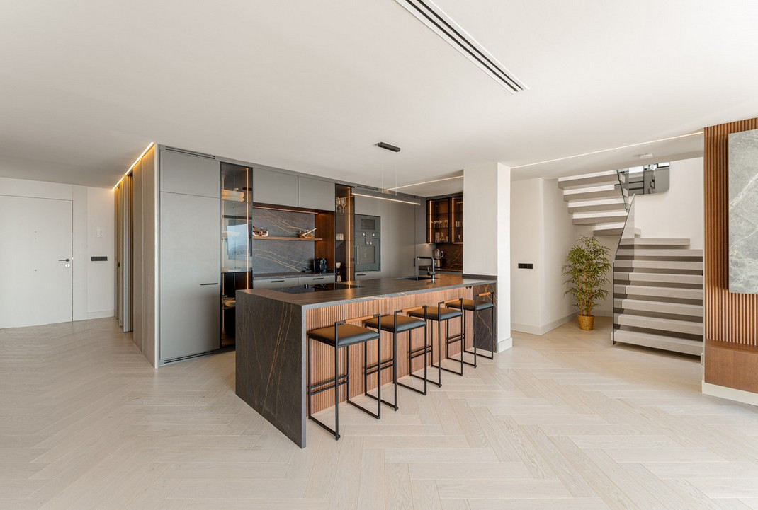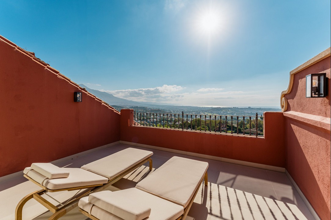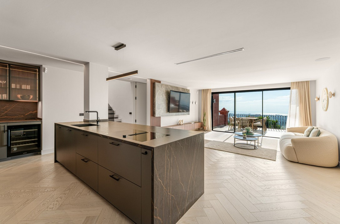 Appartement Terrasse, Monte Halcones – Is an exceptional duplex penthouse for sale within the charming urbanization in La Quinta, Benahavís. South-facing and elevated, this residence captures panoramic views that sweep from the Mediterranean coastline to the surrounding mountains, a daily backdrop of natural beauty to enjoy from its expansive terraces. This home brings together contemporary architecture, luxury finishes, and the comfort of modern functionality. Chevron herringbone wood flooring, bespoke carpentry, and high-performance Cortizo windows set the tone for quality throughout. Every element of the design has been considered to create a property that is both visually striking and highly practical for everyday living.