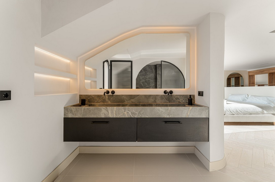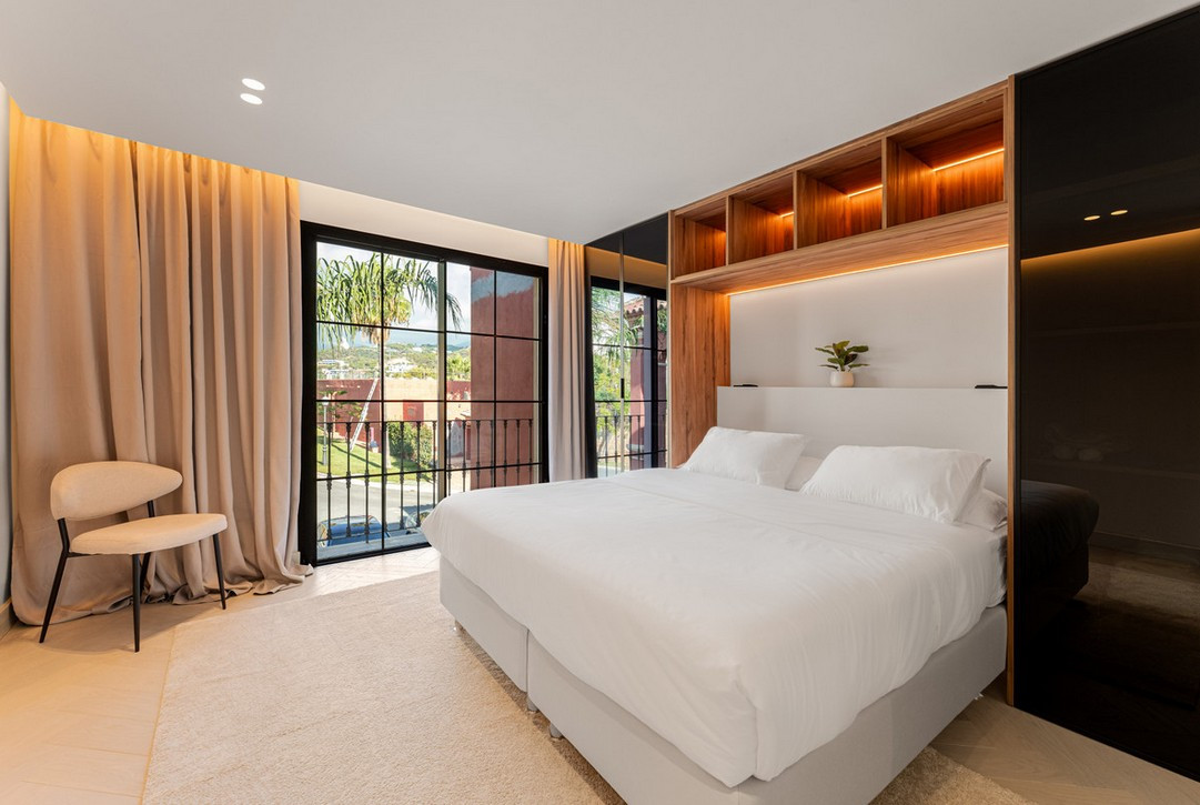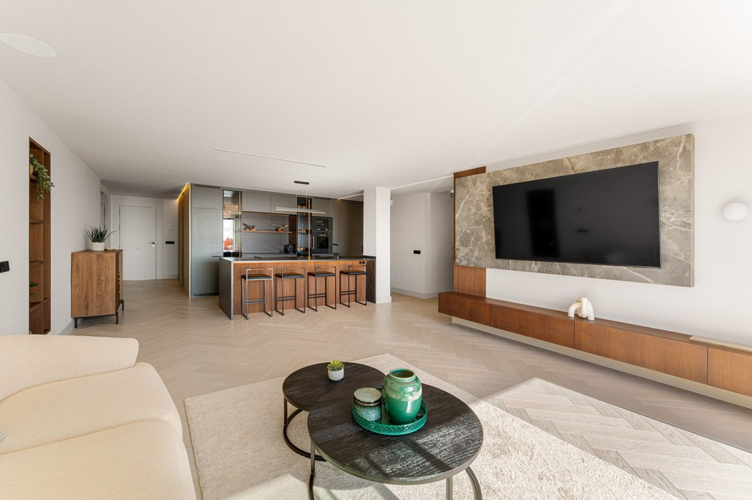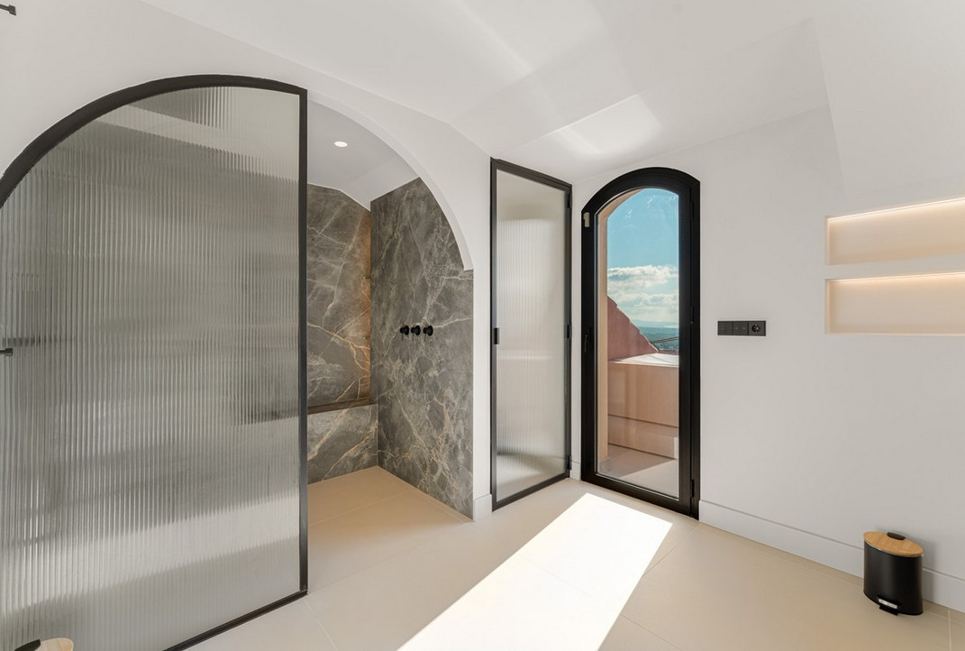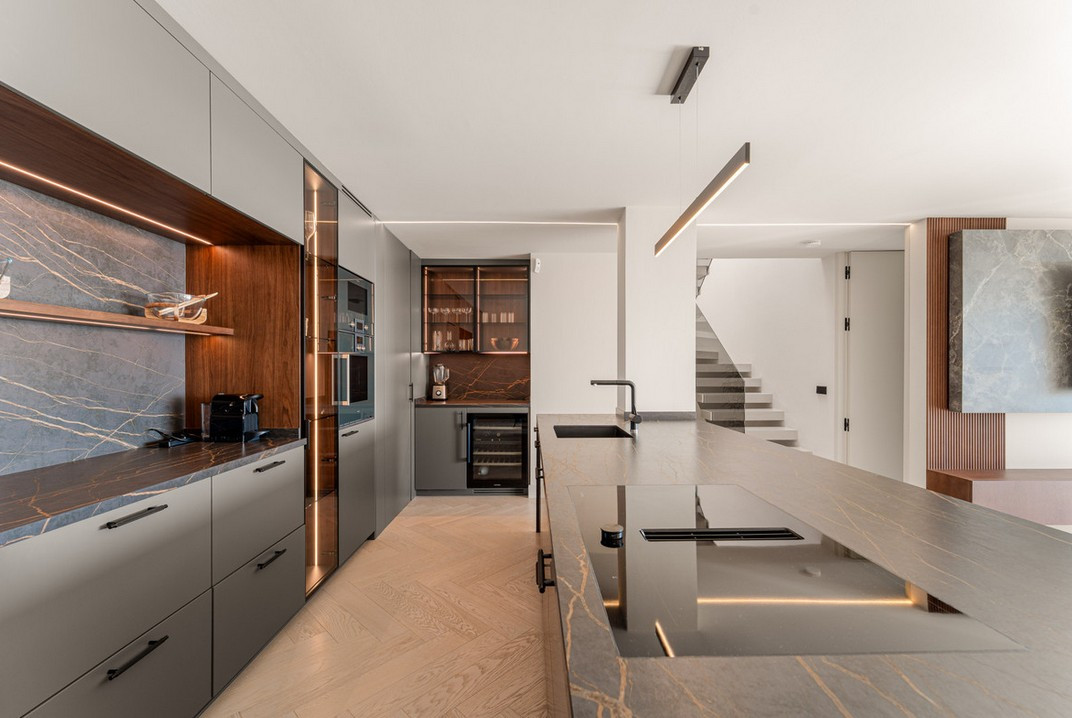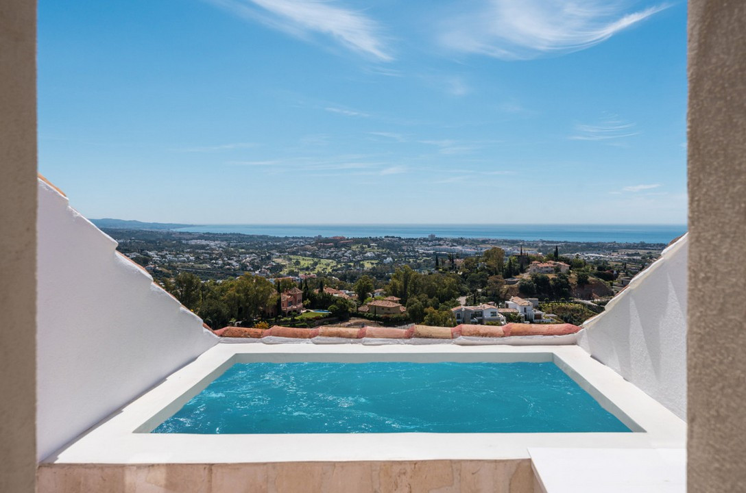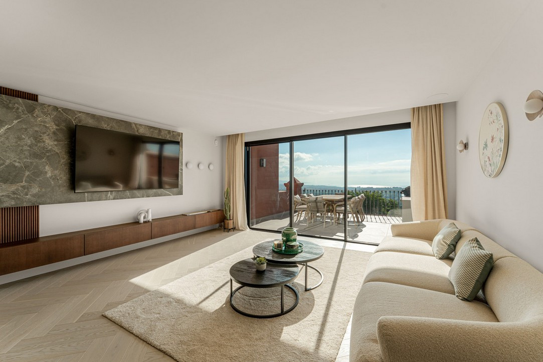 Appartement Terrasse, Monte Halcones – Is an exceptional duplex penthouse for sale within the charming urbanization in La Quinta, Benahavís. South-facing and elevated, this residence captures panoramic views that sweep from the Mediterranean coastline to the surrounding mountains, a daily backdrop of natural beauty to enjoy from its expansive terraces. This home brings together contemporary architecture, luxury finishes, and the comfort of modern functionality. Chevron herringbone wood flooring, bespoke carpentry, and high-performance Cortizo windows set the tone for quality throughout. Every element of the design has been considered to create a property that is both visually striking and highly practical for everyday living.