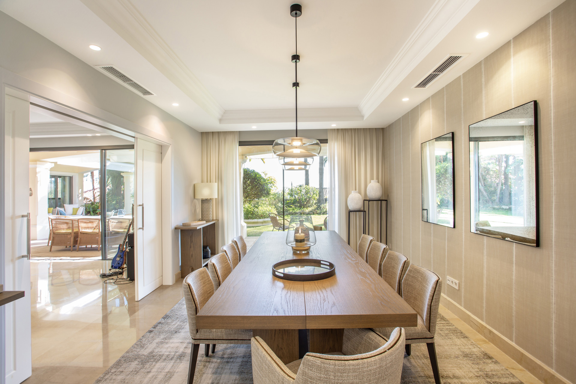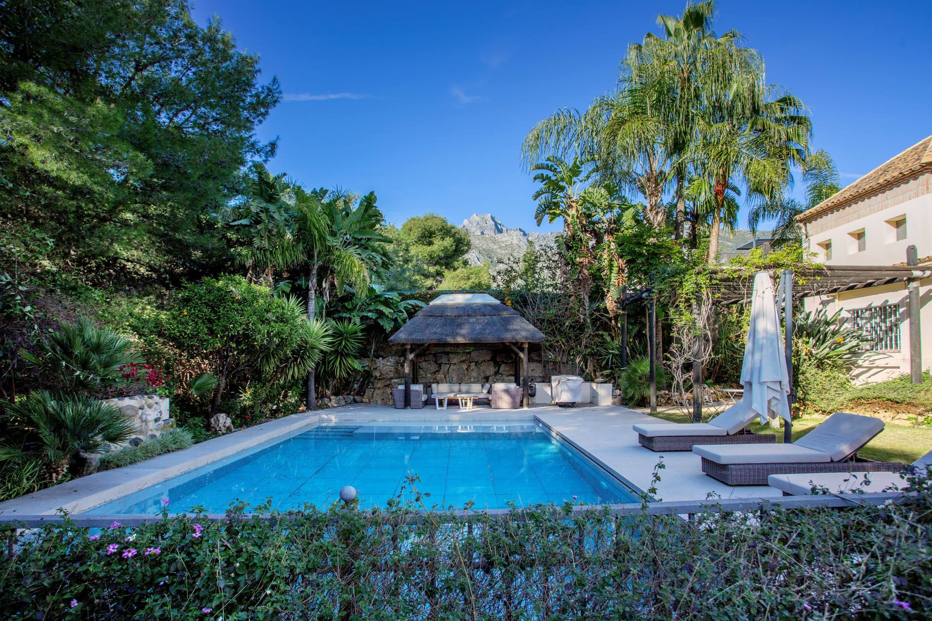 Villa, Sierra Blanca – Located in the prestigious neighbourhood of Sierra Blanca just minutes from the Marbella Golden Mile, this renovated detached villa enjoys a totally private plot with sea and La Concha mountain views. Upon entering the property there is a feature triple height entrance hall that connects 4 main parts of the house: Walking straight through you have a large living room area connected to the covered patio, gardens and pool. In the living room you will find connections to the dining room and large kitchen with breakfast and snack area. Turning left you have 3 generously sized guest rooms each with en-suite bathrooms. (3) Going upstairs we discover a fantastic master suite, totally private from the rest of the house with his and hers walk-in wardrobes, en-suite bathroom and private office. The master suite also enjoys a gorgeous private terrace with ocean and La Concha views. Walking downstairs we have a totally renovated basement space that has been transformed into a fully equipped gymnasium with rest room, kids playroom / customisable space, homecinema, storage areas and a laundry room. The exterior of the house: The gardens and pool are accessible from all areas of the ground floor and have been landscaped flat to the property. The pool was also renovated with new tiles and terrace. The property has two drive ways with total space for 5+ cars. If required, the gym can be converted back to an interior garage space for 2 additional cars. Book a tour to view this exceptional residence today in Sierra Blanca!