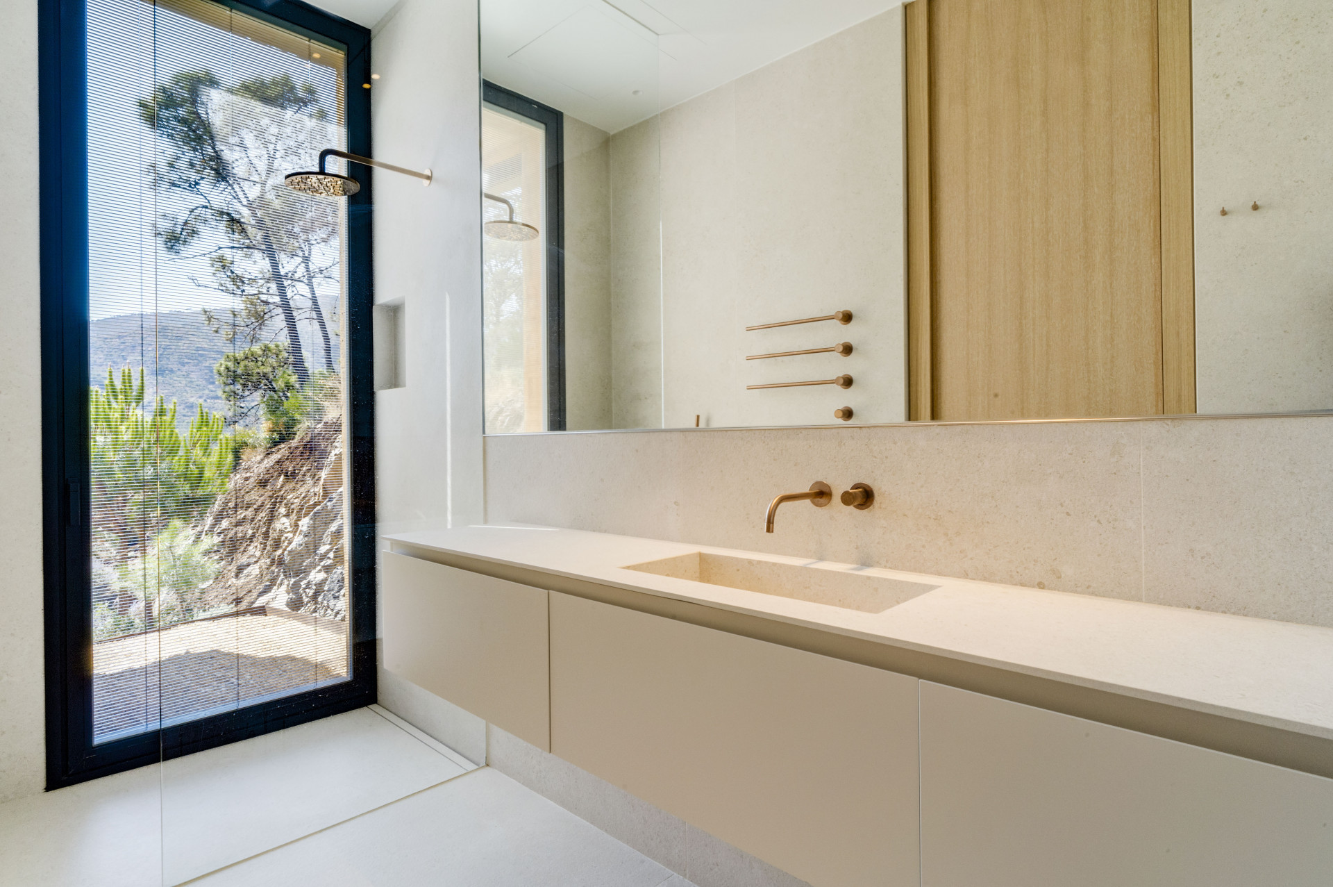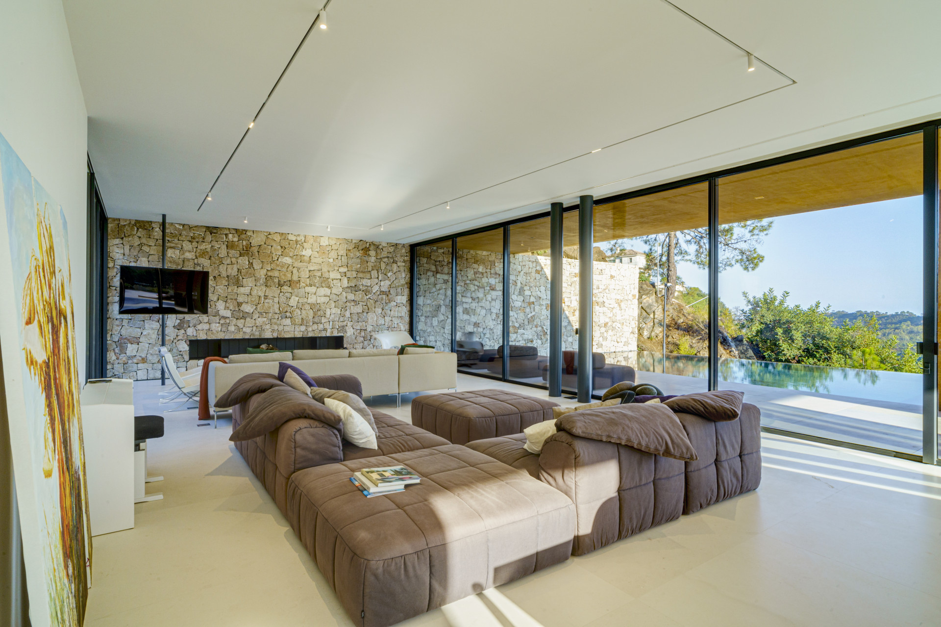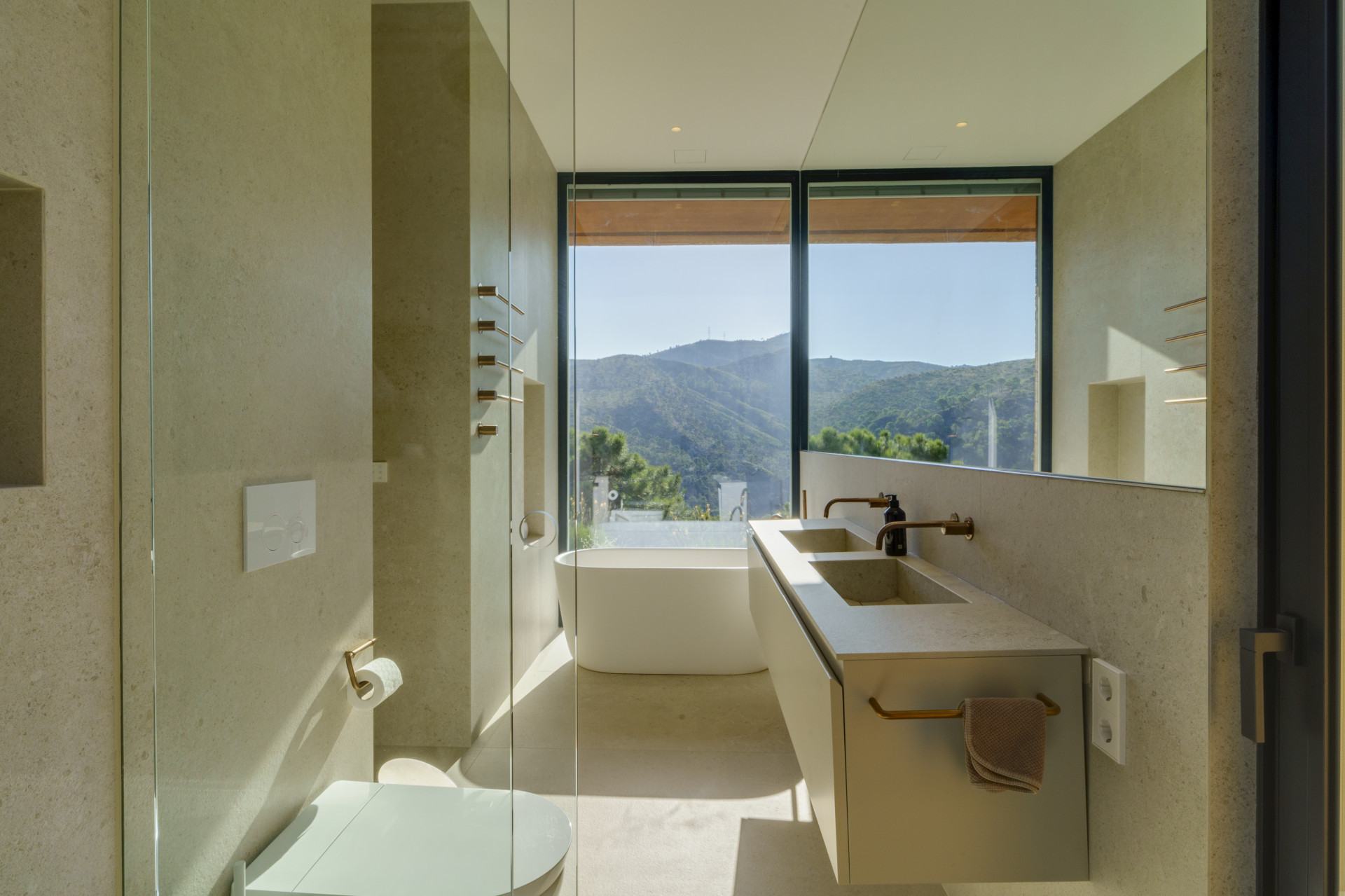 This exceptional five-bedroom villa, located in the prestigious gated community of Monte Mayor in Benahavís, Málaga, exemplifies residential luxury on the Costa del Sol. Designed by Ignacio Vicens of the renowned architectural studio Vicens & Ramos, the property is built using oxidized concrete and natural stone both inside and out, blending seamlessly with the surrounding green landscape that ensures complete privacy and no immediate neighbors. With spectacular mountain views, partial sea views, and river views, the villa is perfectly positioned for those seeking unparalleled quality, an exclusive lifestyle, and the region’s celebrated climate and gastronomy. With a generous built area of 602 m² and 200 m² of terraces set on a 3,200 m² plot, the villa is meticulously finished to the highest standards. The interior features five en-suite bedrooms and a total of seven bathrooms, each fitted with Iconico taps and Iconic smart sanitary ware, as well as large-format Inalco porcelain finishes. Natural oak carpentry is present throughout the home, from the oversized pivot entrance door to custom wall paneling, fitted wardrobes, and a spacious walk-in dressing room. The bedrooms are finished with large-format Astorga oak parquet flooring, while the living areas showcase 120×120 Piedra Paloma natural stone, complemented by impressive 3.08 m-high Technal windows. Comfort is guaranteed with underfloor heating, aerothermal energy, air conditioning, and a fireplace, while advanced amenities such as a gym, Turkish bath (hammam), fully equipped basement, and a dedicated office space cater to both relaxation and productivity. Outdoor living is equally impressive, featuring a private saltwater infinity pool equipped with the latest technology, multiple covered and uncovered terraces with panoramic and garden views, and a glass-walled courtyard with a carob tree. Natural plants adorn the terraces and rooftops, enhancing the villa’s integration with the landscape. Green areas surround the plot, ensuring uninterrupted views and tranquility. The private garden is ideal for enjoying the Costa del Sol lifestyle, and the villa’s proximity to the village of Benahavís and renowned restaurants further enhances its appeal for lovers of gastronomy and healthy living. Practical features include a garage for three large vehicles with a Tesla charger, three machine rooms for the pool and irrigation systems, a laundry room, double glazing, solar panels, and 24-hour security with an armored door and alarm system. The villa is brand new and ideal for discerning buyers seeking a combination of luxury, privacy, security, and top-tier amenities in one of the most sought-after locations on the Costa del Sol, less than 10 minutes from the Marbella Club Golf Resort.