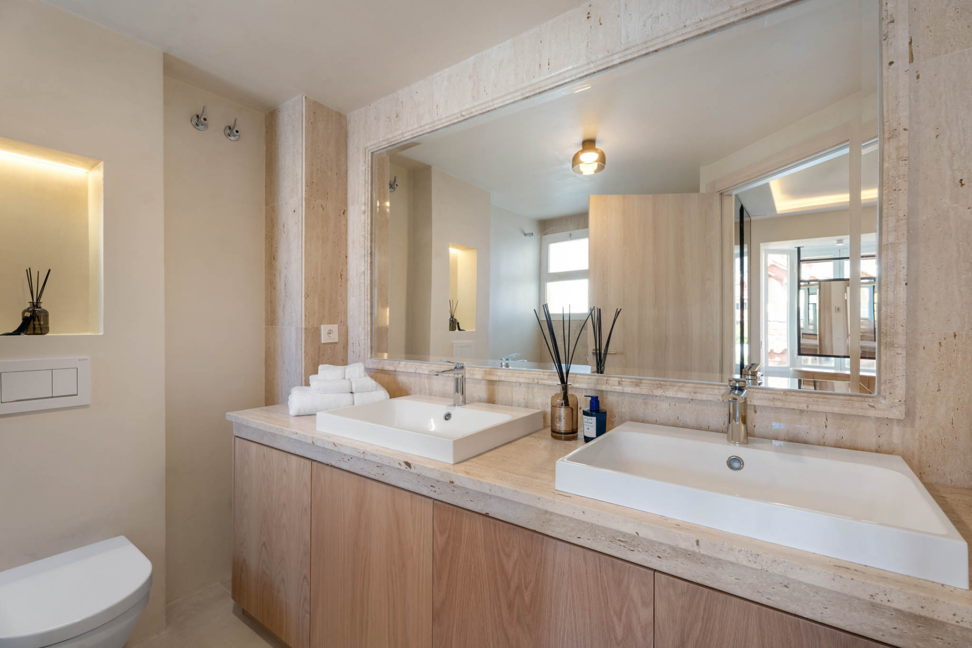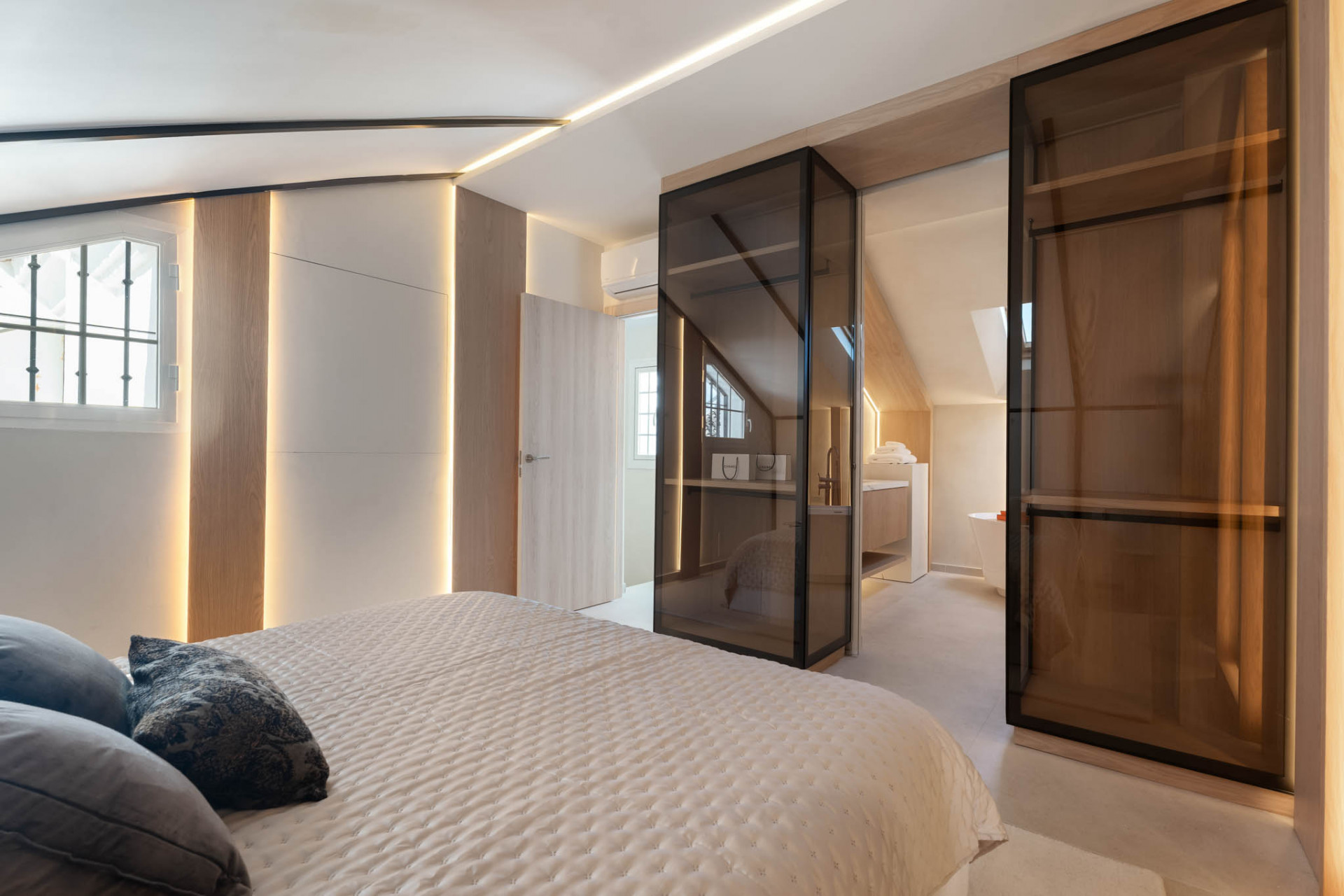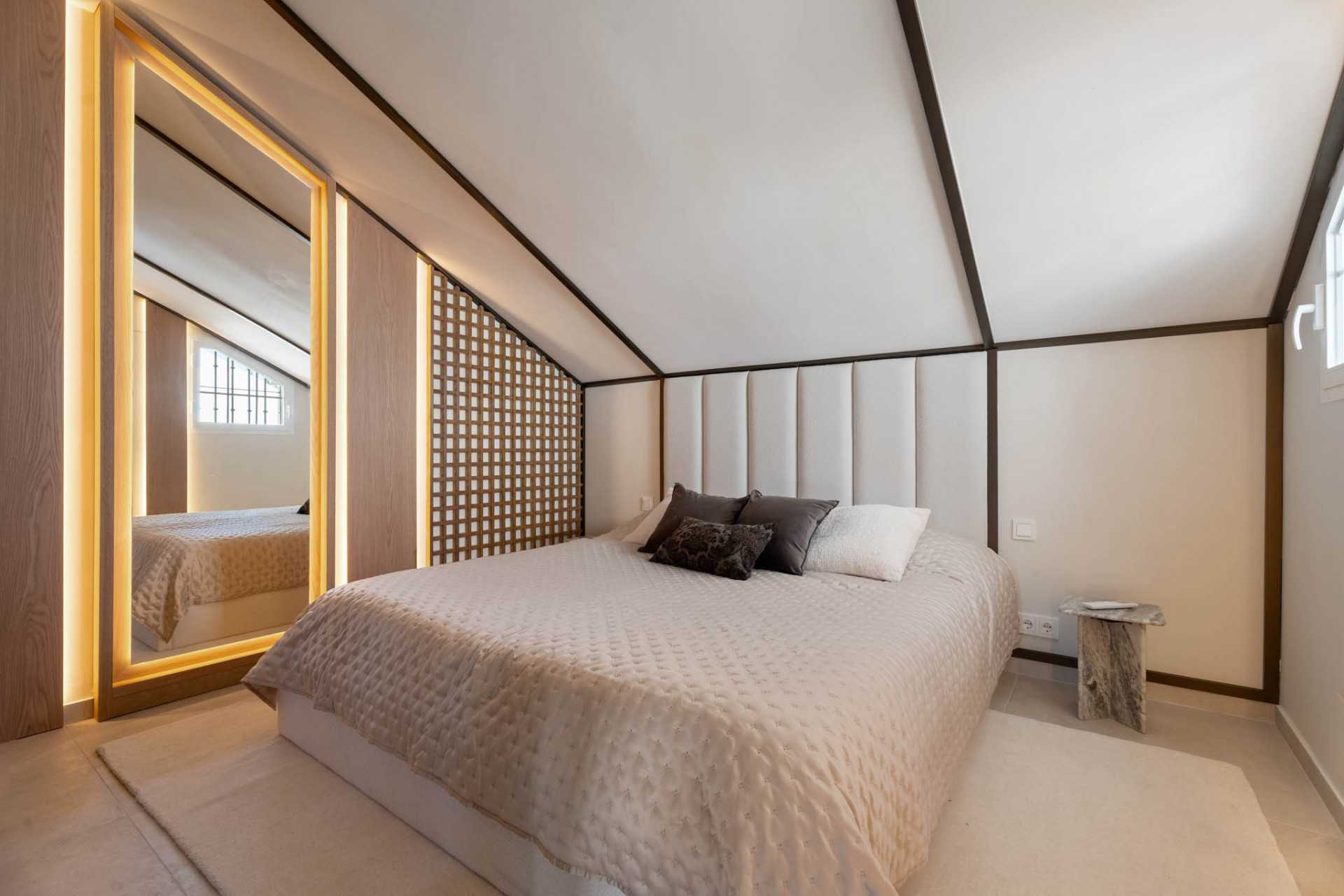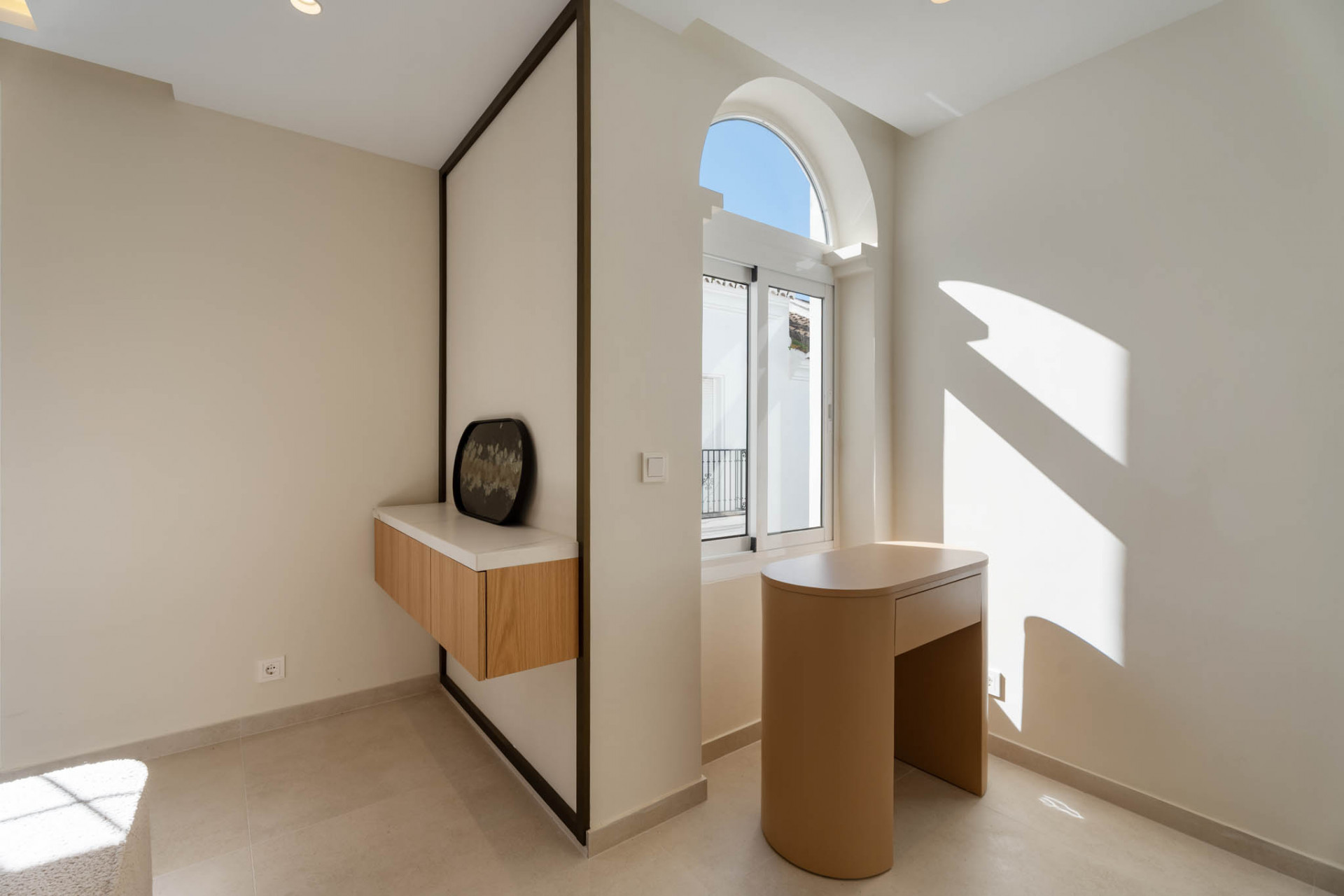 Maison de Ville, Arco Iris – legant fully refurbished townhouse located in one of the most prestigious areas of the Golden Mile, just a short walk from the beach and all essential amenities, set within a secure gated community with beautiful communal gardens and swimming pool. Distributed over three levels and offering 171 m² built with 21 m² of terraces, the property features a bright contemporary open-plan layout where a designer kitchen with premium appliances flows seamlessly into the dining and living area, leading out to a spacious private terrace with outdoor kitchen and laundry cupboard, ideal for entertaining. The first floor offers two generous bedroom suites with fitted wardrobes and bathrooms, while the top level is dedicated to an impressive master suite with high ceilings, a luxurious bathroom with freestanding bathtub and double sinks, and access to a private terrace with mountain views. Finished to high standards with modern technology and home automation, the property also includes two private parking spaces and a storage room, making it an exceptional option as a primary residence, stylish holiday home or investment.