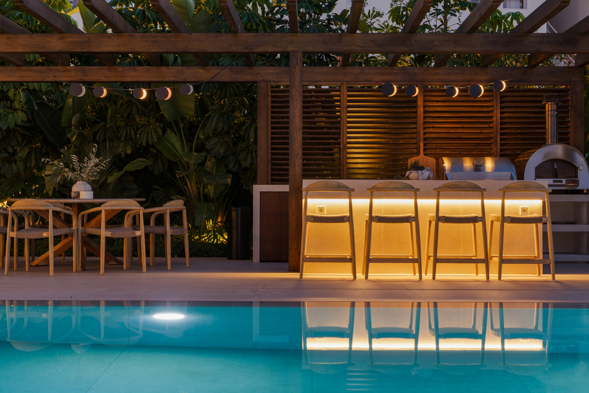 Villa, Los Naranjos Golf – An exceptional family residence set within one of the most prestigious gated communities in Los Naranjos, Nueva Andalucía, just moments from one of Marbella’s finest golf courses, this beautifully renovated villa embodies refined Mediterranean living at its finest. Positioned on a flat, west-facing plot, the property enjoys an abundance of natural light and open views that stretch across the golf course towards the mountains, creating a serene and private atmosphere throughout the day. From the moment you arrive, a landscaped Mediterranean garden with a tranquil water feature sets the tone for a home defined by elegance and calm. Inside, the main living space unfolds in a seamless open-plan design, where the entrance hall flows effortlessly into the lounge, dining area, and a fully equipped kitchen fitted with top-of-the-line Miele appliances, complemented by a stylish dry bar and a separate concealed chef’s kitchen for added practicality. The villa offers six bedrooms, including an independent staff or nanny suite with private access, ensuring both comfort and flexibility for modern family living. Designed for both relaxation and entertainment, the home features a dedicated office, a wellness area with gym, sauna, and indoor jacuzzi, as well as a fully soundproofed cinema room. Premium finishes such as herringbone wood flooring, bespoke carpentry, natural stone elements, and underfloor heating enhance the sense of quality throughout, while a state-of-the-art security system adds complete peace of mind. The outdoor spaces are equally impressive, with an elegant outdoor kitchen and bar, and a heated saltwater swimming pool with a striking mirrored overflow edge, perfectly capturing the essence of indoor-outdoor living in Marbella.