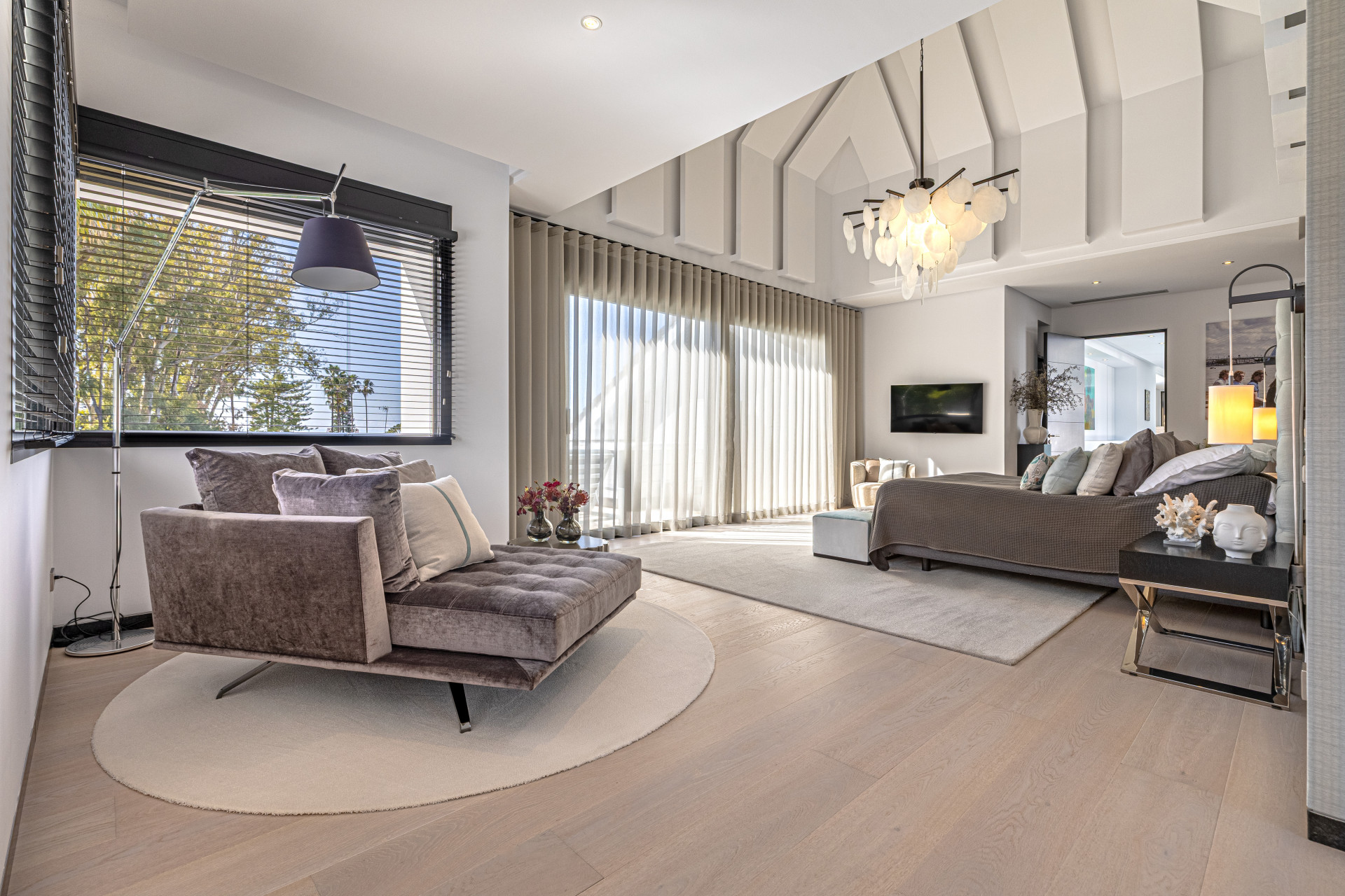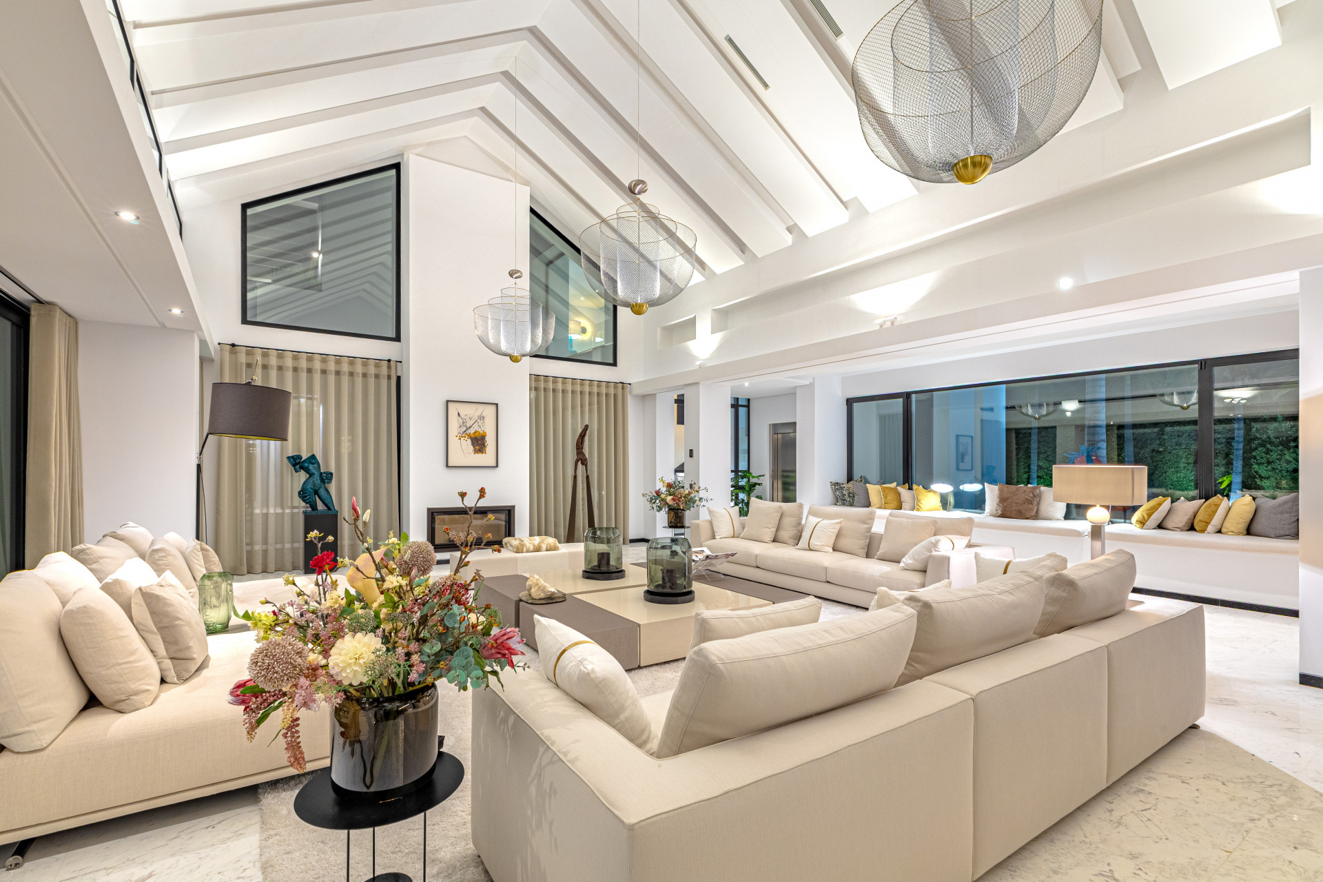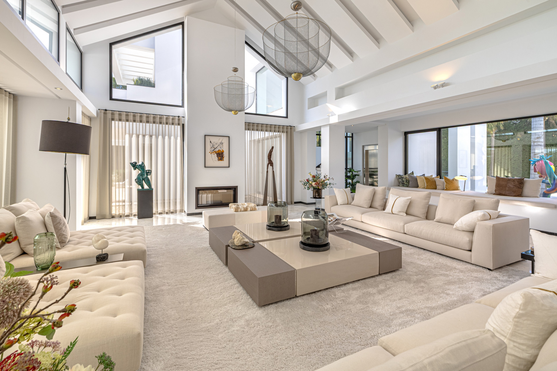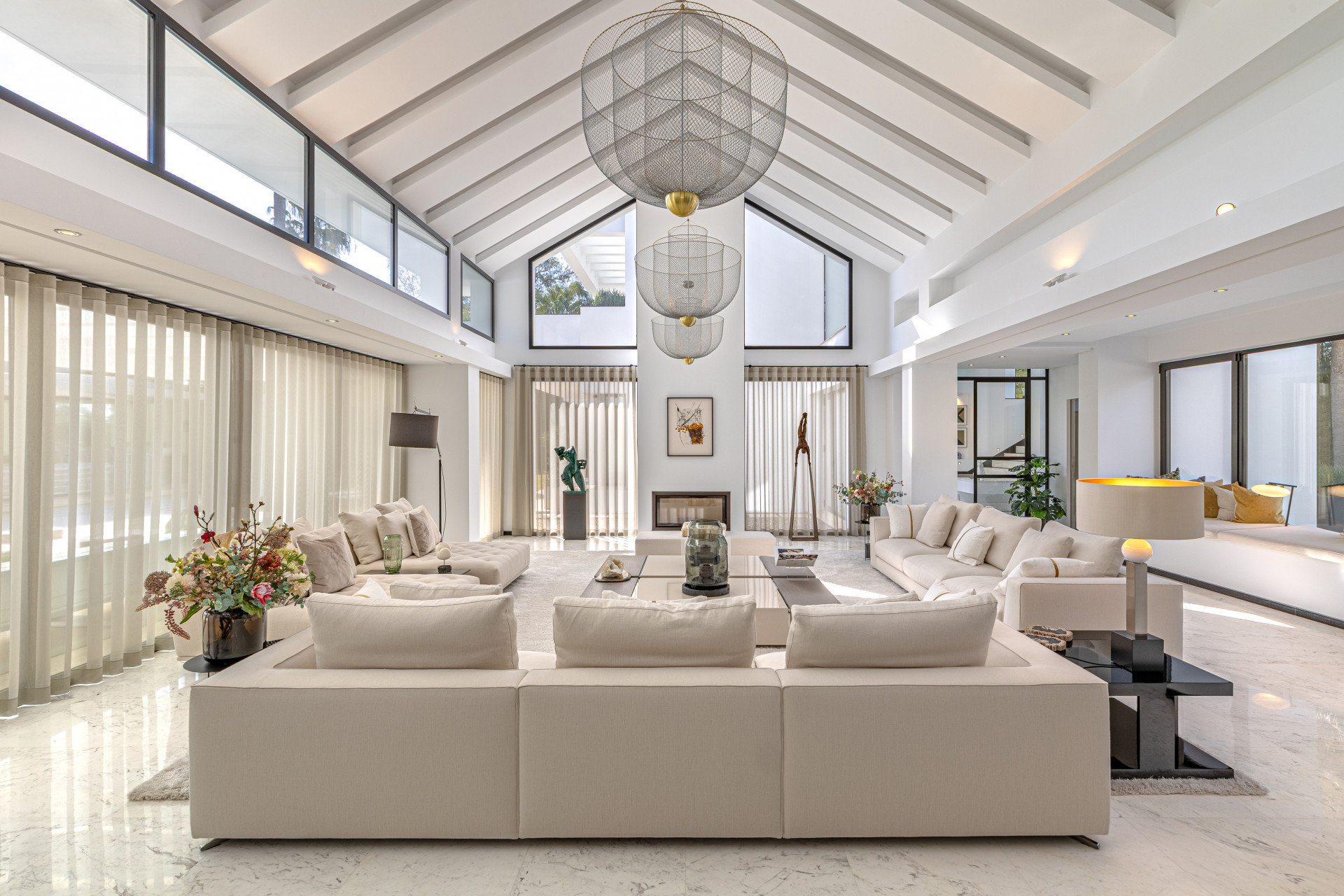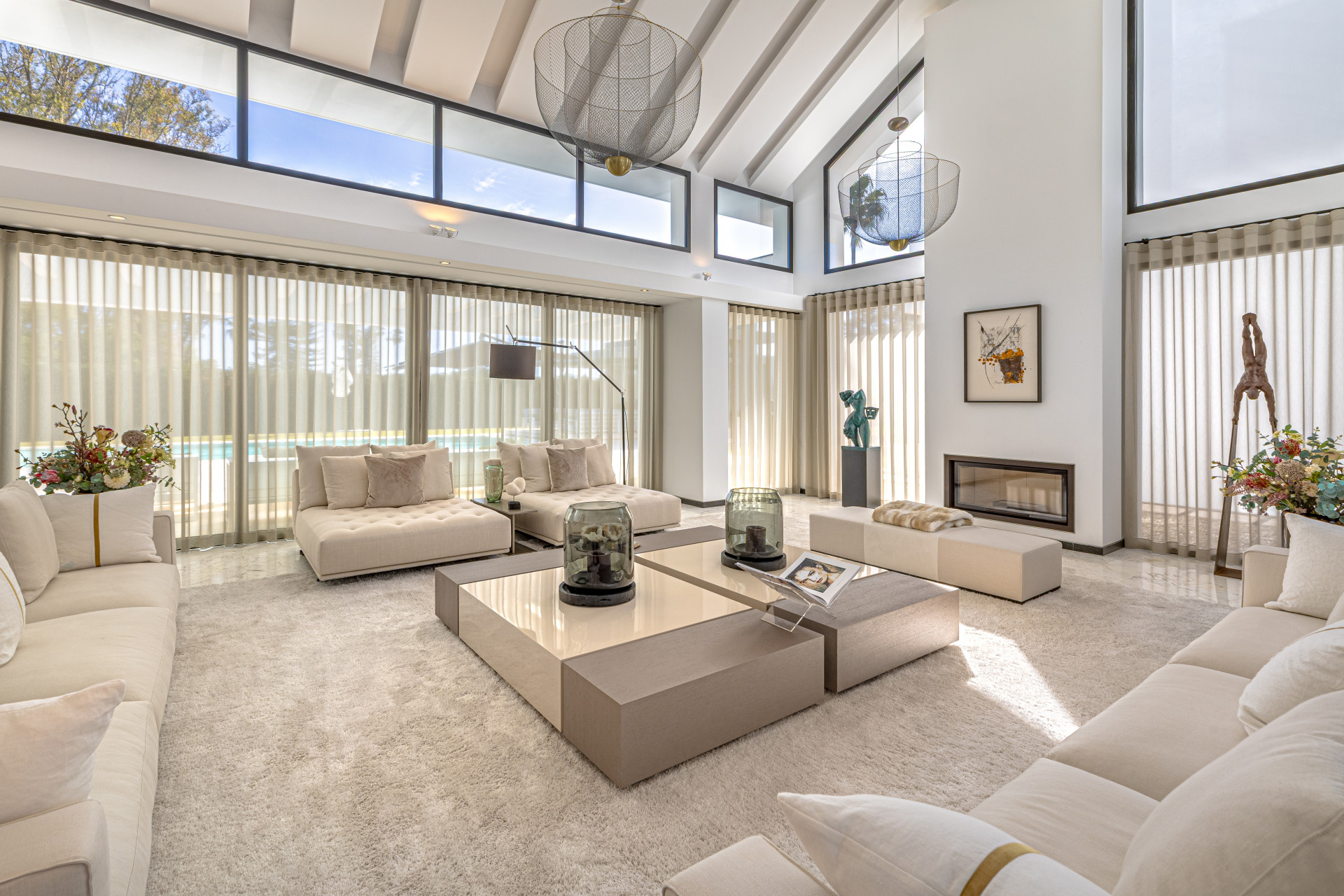 Villa, Guadalmina Baja – A luxury villa constructed to the highest standards of quality within the prestigious enclave of Guadalmina Baja. Featuring a south-facing, modern architectural design with serene views of the private garden and swimming pool. The entrance hall opens into a sophisticated living area featuring a fireplace, defined by vaulted wooden beamed ceilings and expansive windows that create a seamless visual flow to the dining room. This interior elegance transitions effortlessly to the outdoors, where generous open and covered terraces provide an idyllic setting for embracing the Mediterranean lifestyle at any hour. The villa’s main hall leads to a modern living room with a fireplace, characterized by high wooden beamed ceilings and large windows that visually connect with the dining room. Access is through an elegant entrance patio. The gourmet kitchen is magnificent and fully equipped with a central island and a separate laundry area. From the kitchen, there is direct access to spacious terraces, both open and covered, perfect for the Mediterranean lifestyle. Definitely worth viewing!