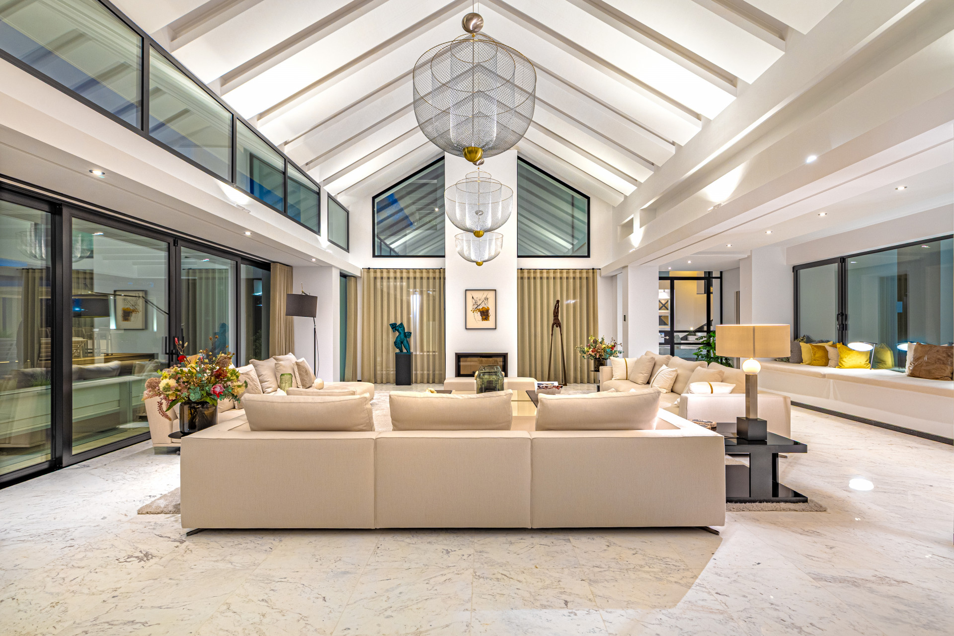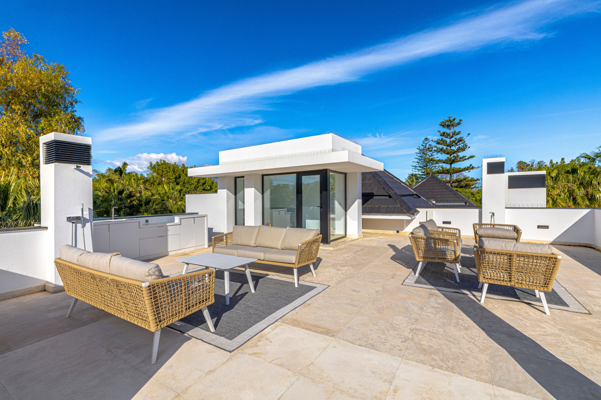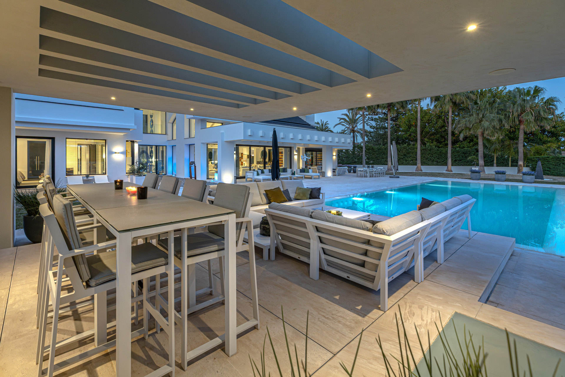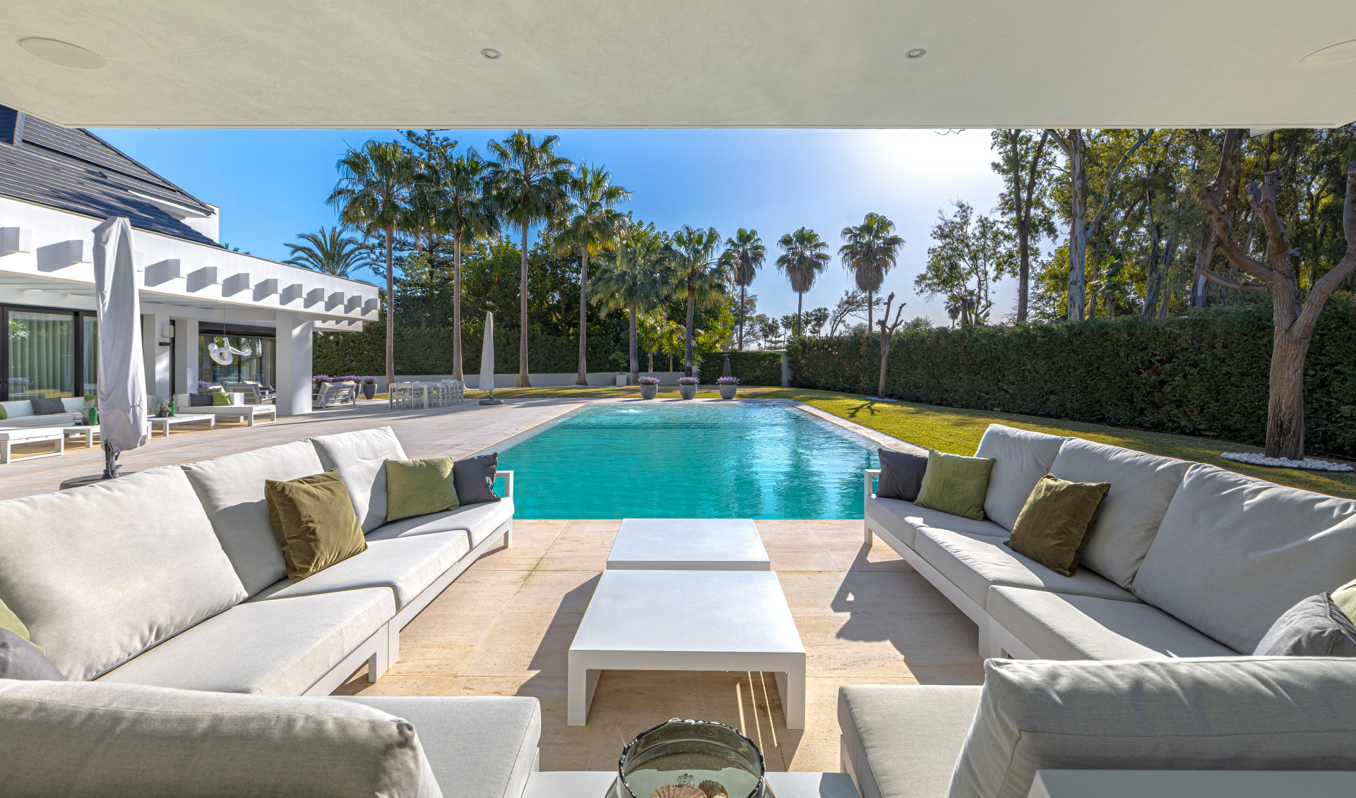 Villa, Guadalmina Baja – A luxury villa constructed to the highest standards of quality within the prestigious enclave of Guadalmina Baja. Featuring a south-facing, modern architectural design with serene views of the private garden and swimming pool. The entrance hall opens into a sophisticated living area featuring a fireplace, defined by vaulted wooden beamed ceilings and expansive windows that create a seamless visual flow to the dining room. This interior elegance transitions effortlessly to the outdoors, where generous open and covered terraces provide an idyllic setting for embracing the Mediterranean lifestyle at any hour. The villa’s main hall leads to a modern living room with a fireplace, characterized by high wooden beamed ceilings and large windows that visually connect with the dining room. Access is through an elegant entrance patio. The gourmet kitchen is magnificent and fully equipped with a central island and a separate laundry area. From the kitchen, there is direct access to spacious terraces, both open and covered, perfect for the Mediterranean lifestyle. Definitely worth viewing!