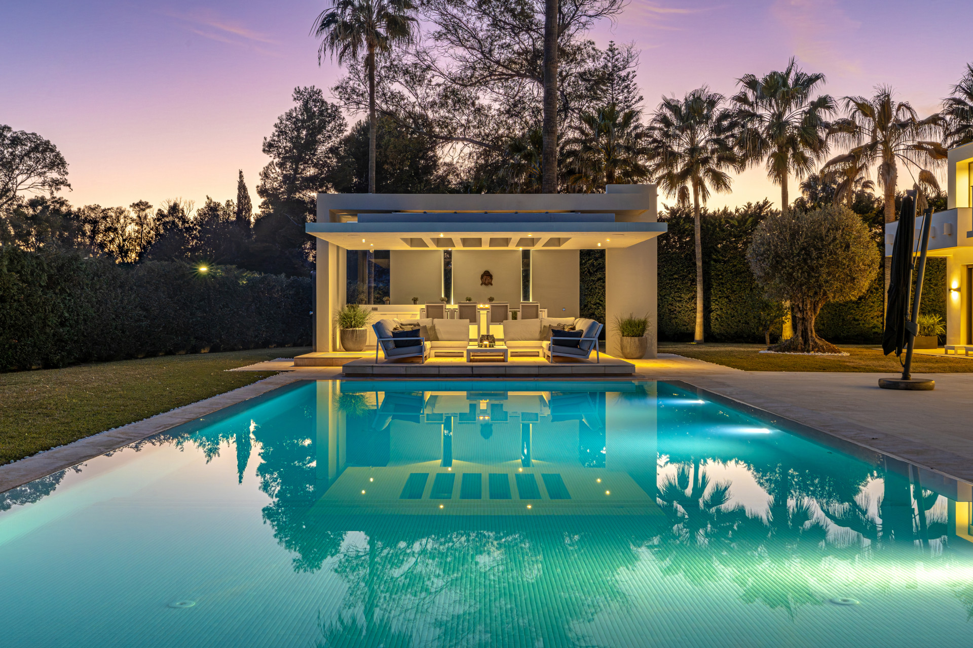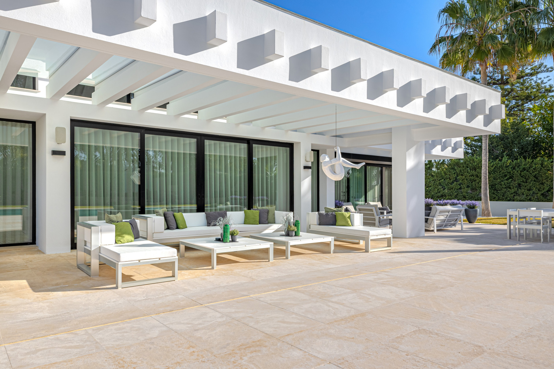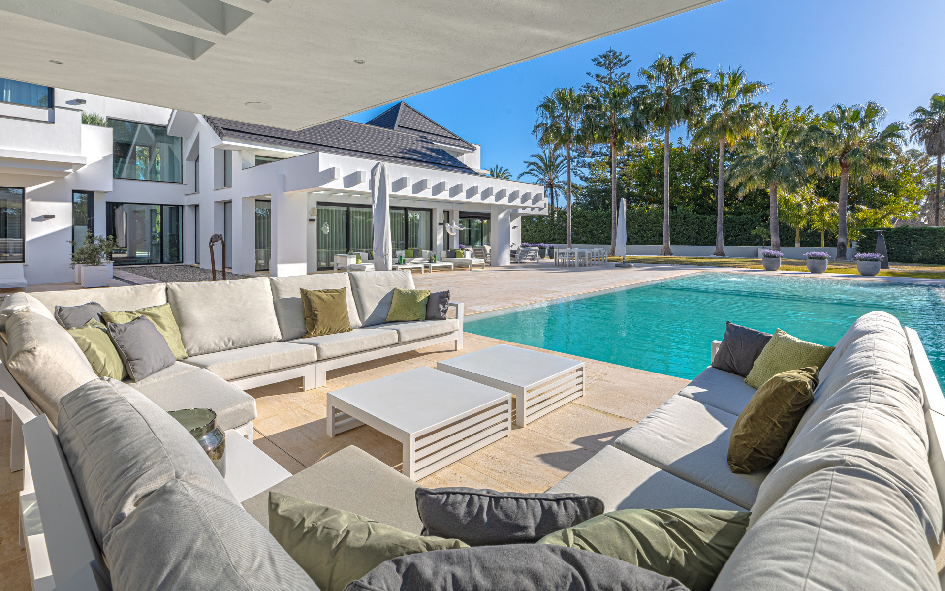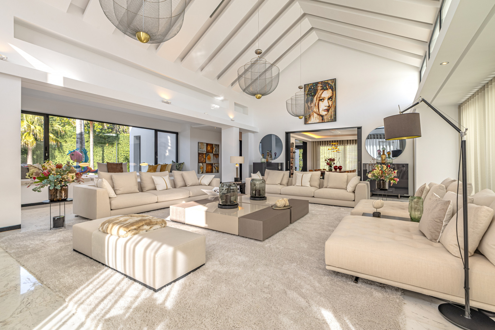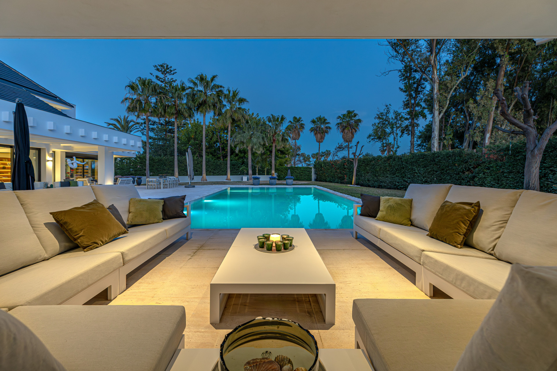 Villa, Guadalmina Baja – A luxury villa constructed to the highest standards of quality within the prestigious enclave of Guadalmina Baja. Featuring a south-facing, modern architectural design with serene views of the private garden and swimming pool. The entrance hall opens into a sophisticated living area featuring a fireplace, defined by vaulted wooden beamed ceilings and expansive windows that create a seamless visual flow to the dining room. This interior elegance transitions effortlessly to the outdoors, where generous open and covered terraces provide an idyllic setting for embracing the Mediterranean lifestyle at any hour. The villa’s main hall leads to a modern living room with a fireplace, characterized by high wooden beamed ceilings and large windows that visually connect with the dining room. Access is through an elegant entrance patio. The gourmet kitchen is magnificent and fully equipped with a central island and a separate laundry area. From the kitchen, there is direct access to spacious terraces, both open and covered, perfect for the Mediterranean lifestyle. Definitely worth viewing!