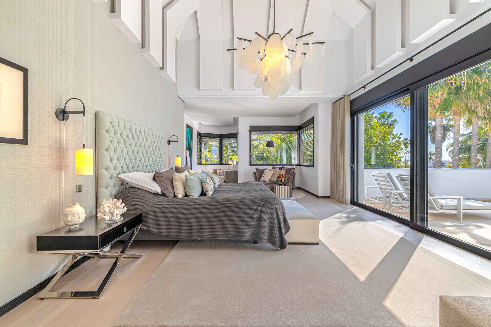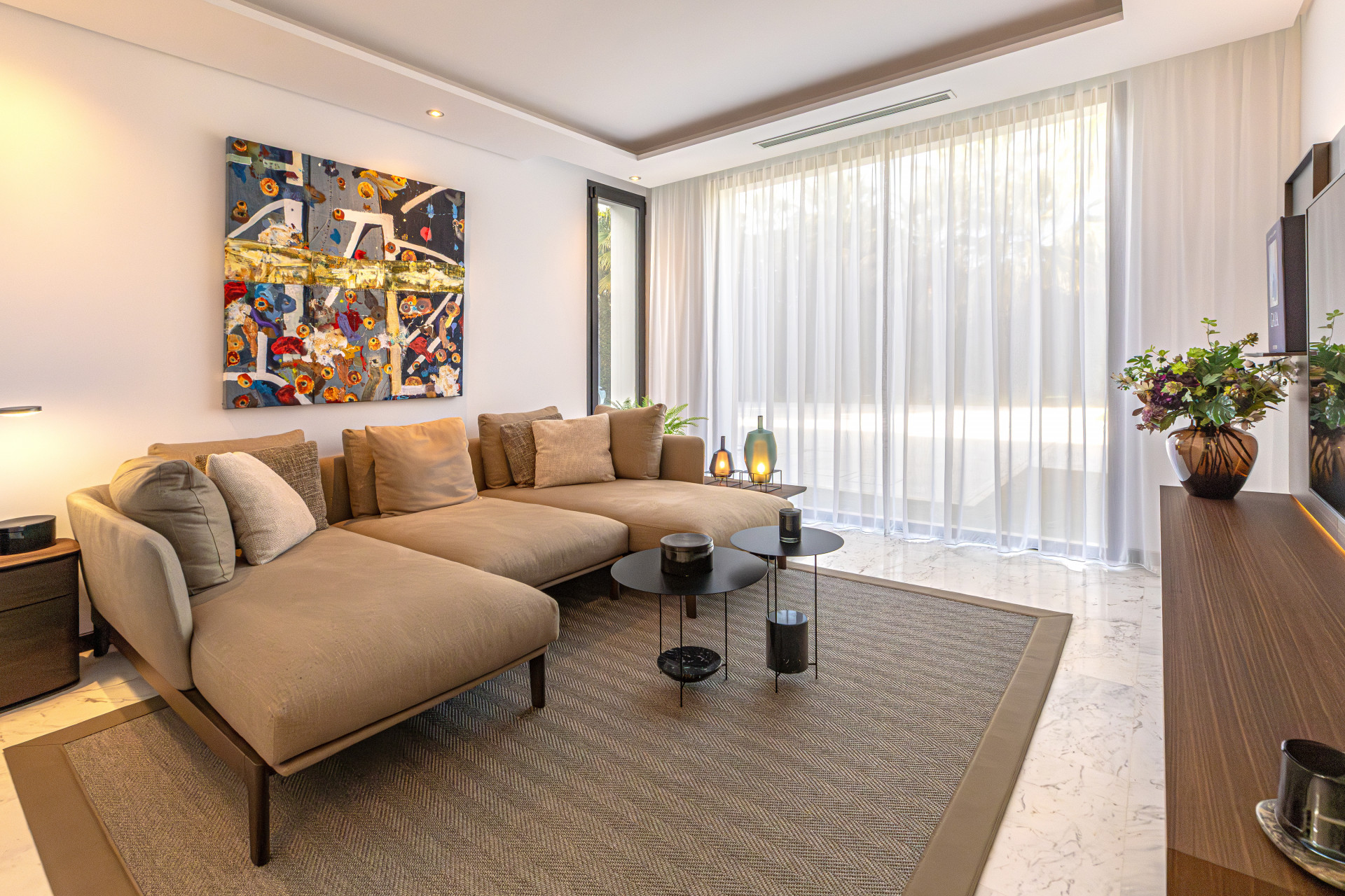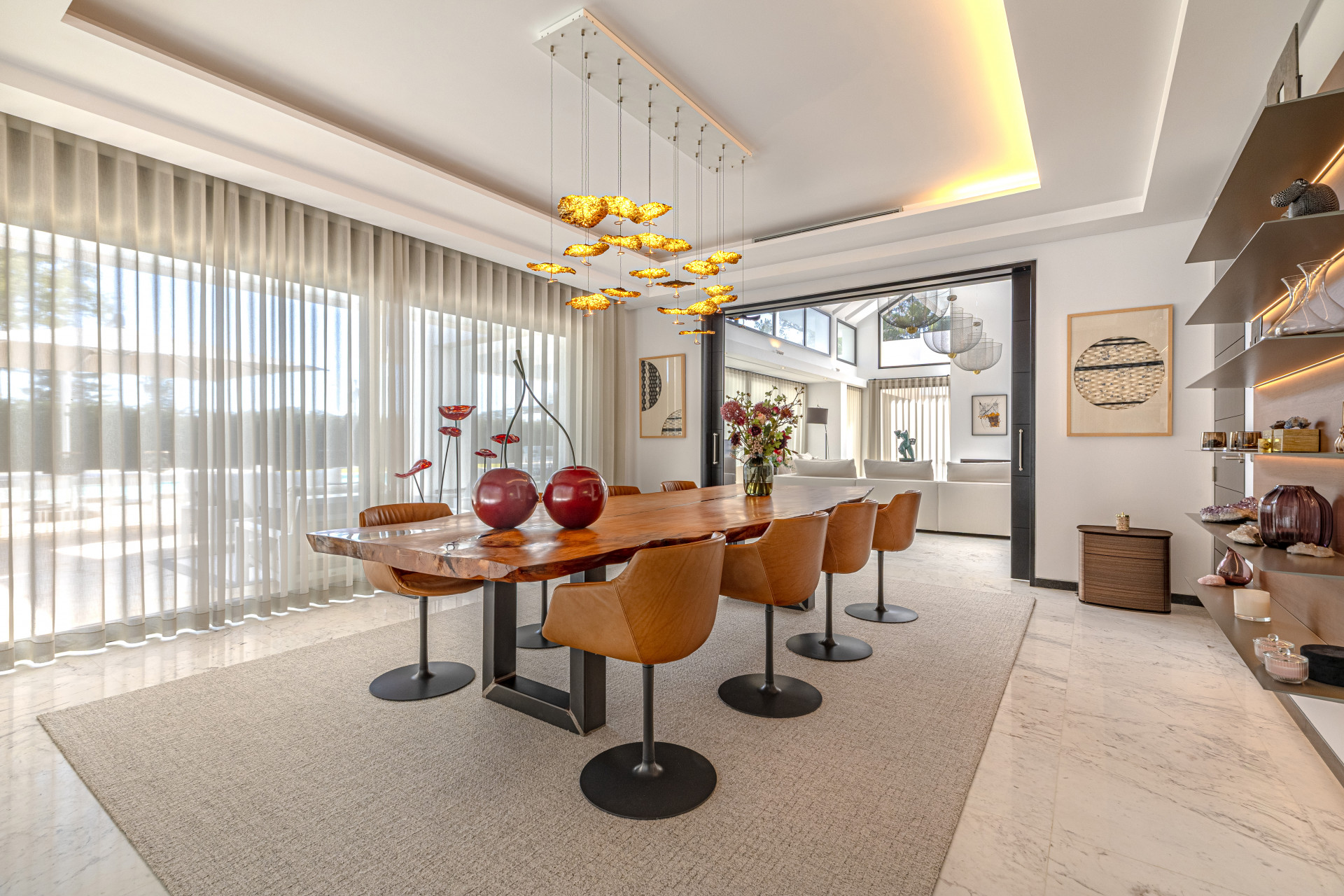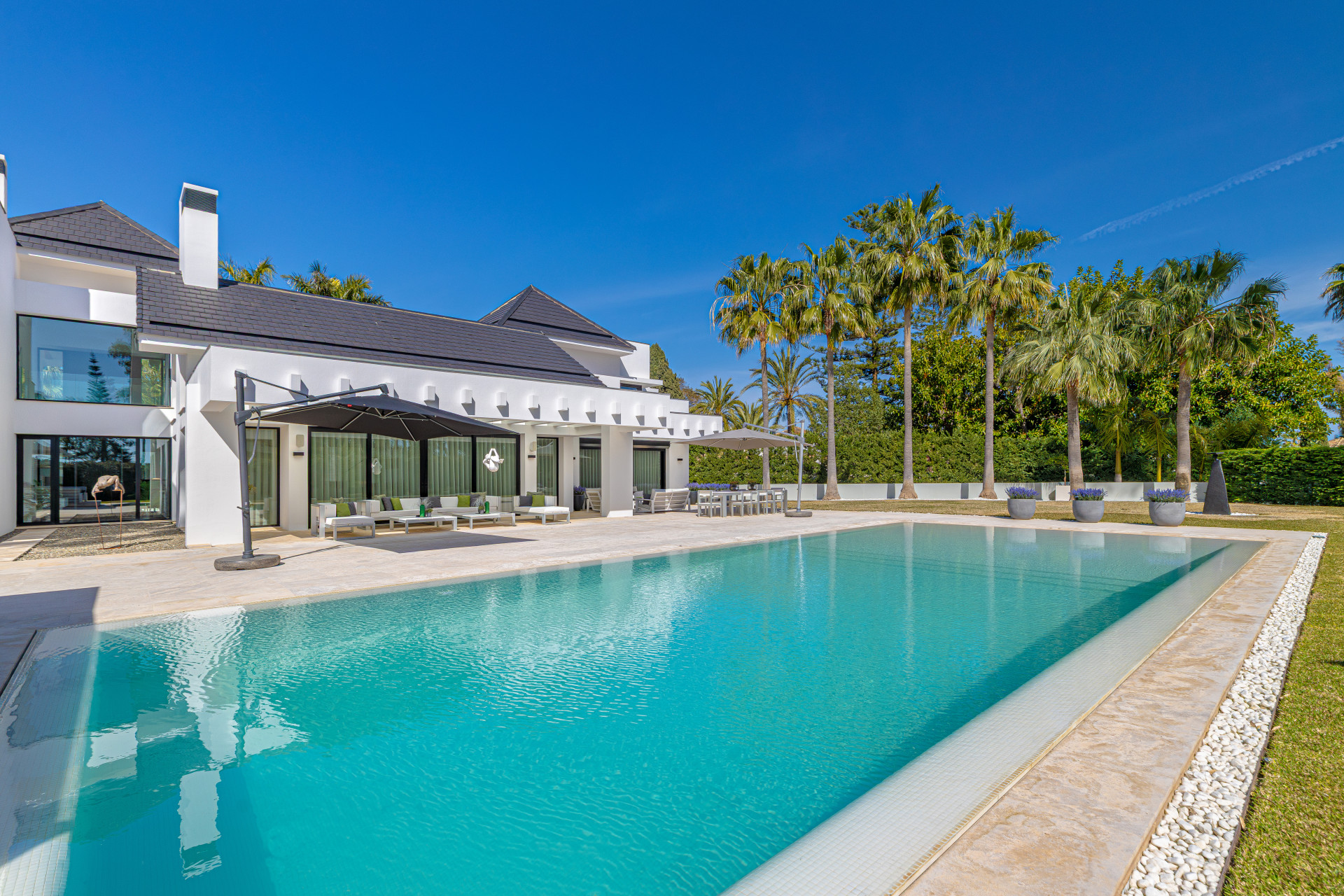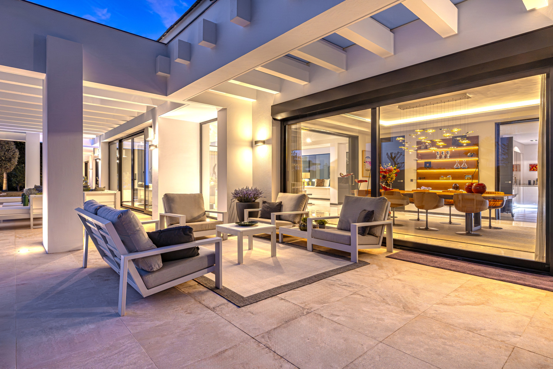 Villa, Guadalmina Baja – A luxury villa constructed to the highest standards of quality within the prestigious enclave of Guadalmina Baja. Featuring a south-facing, modern architectural design with serene views of the private garden and swimming pool. The entrance hall opens into a sophisticated living area featuring a fireplace, defined by vaulted wooden beamed ceilings and expansive windows that create a seamless visual flow to the dining room. This interior elegance transitions effortlessly to the outdoors, where generous open and covered terraces provide an idyllic setting for embracing the Mediterranean lifestyle at any hour. The villa’s main hall leads to a modern living room with a fireplace, characterized by high wooden beamed ceilings and large windows that visually connect with the dining room. Access is through an elegant entrance patio. The gourmet kitchen is magnificent and fully equipped with a central island and a separate laundry area. From the kitchen, there is direct access to spacious terraces, both open and covered, perfect for the Mediterranean lifestyle. Definitely worth viewing!