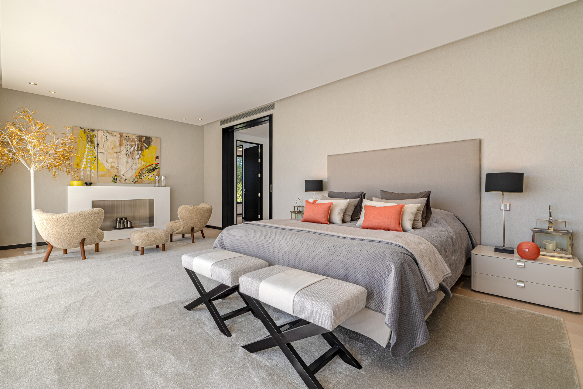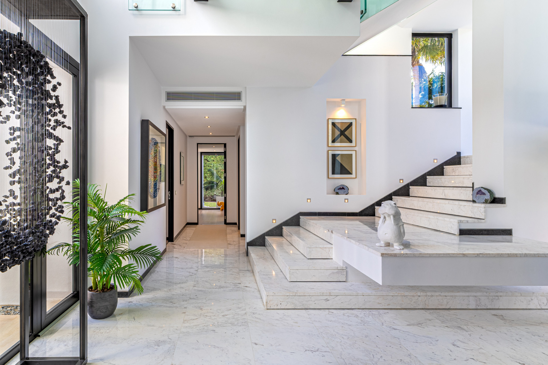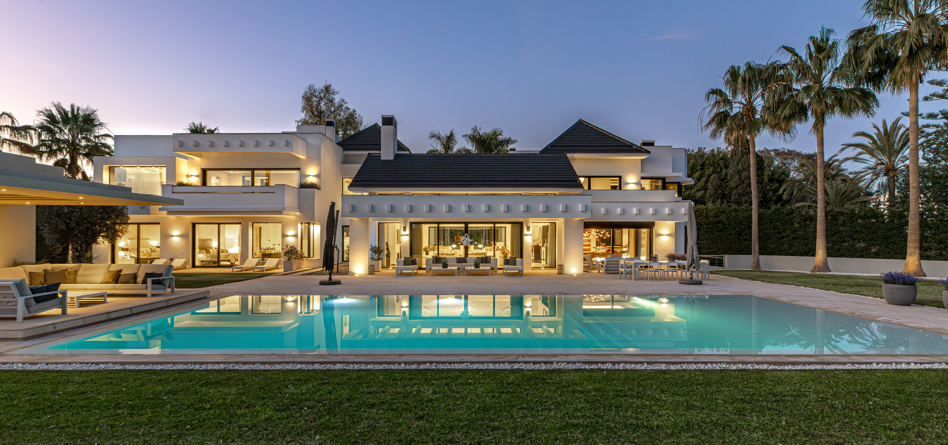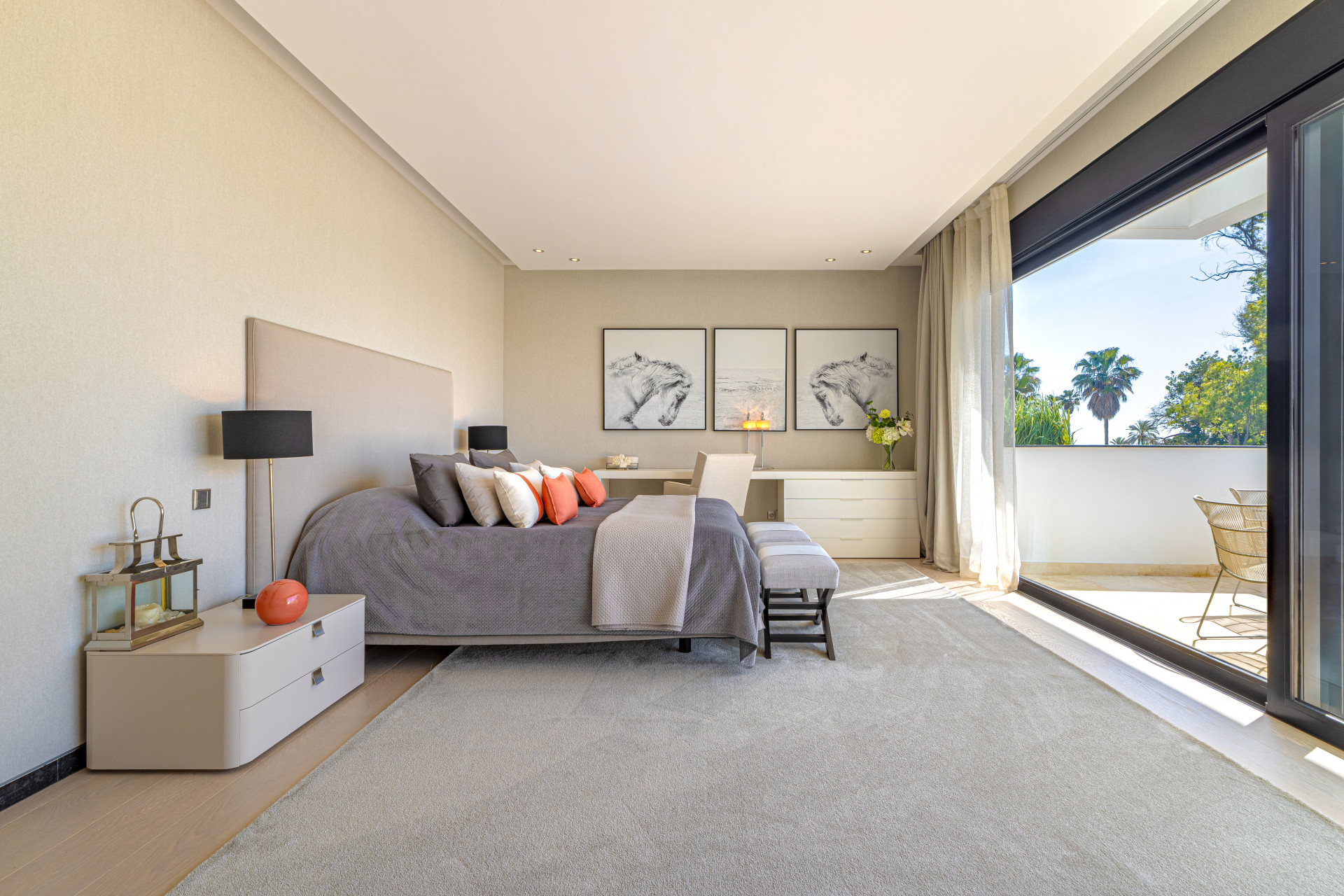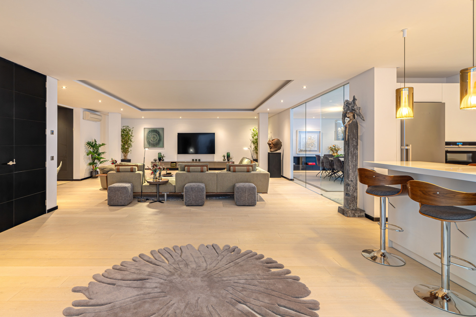 Villa, Guadalmina Baja – A luxury villa constructed to the highest standards of quality within the prestigious enclave of Guadalmina Baja. Featuring a south-facing, modern architectural design with serene views of the private garden and swimming pool. The entrance hall opens into a sophisticated living area featuring a fireplace, defined by vaulted wooden beamed ceilings and expansive windows that create a seamless visual flow to the dining room. This interior elegance transitions effortlessly to the outdoors, where generous open and covered terraces provide an idyllic setting for embracing the Mediterranean lifestyle at any hour. The villa’s main hall leads to a modern living room with a fireplace, characterized by high wooden beamed ceilings and large windows that visually connect with the dining room. Access is through an elegant entrance patio. The gourmet kitchen is magnificent and fully equipped with a central island and a separate laundry area. From the kitchen, there is direct access to spacious terraces, both open and covered, perfect for the Mediterranean lifestyle. Definitely worth viewing!