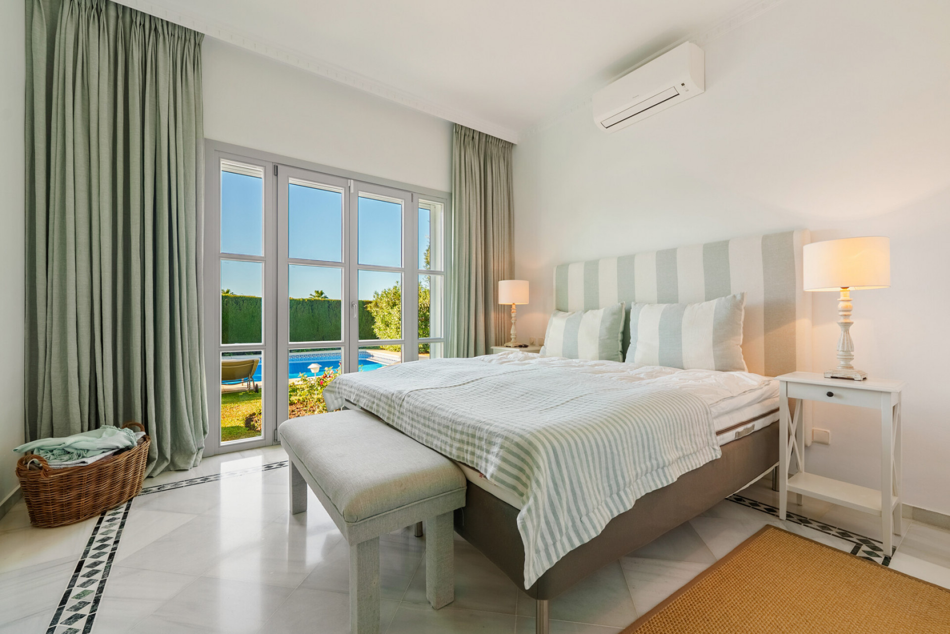 Villa, Sierra Blanca – Nestled within the exclusive gated community of Sierra Blanca, this charming Mediterranean-style villa offers timeless elegance, privacy, and comfort on Marbella’s prestigious Golden Mile. Set on a 1,148 m² plot with 220 m² built, this beautifully maintained bungalow-style home is distributed on one floor plus a spacious solarium. It features 4 generous bedrooms and a seamless blend of indoor and outdoor living, perfect for year-round enjoyment of the Costa del Sol’s unique climate. Inside, the villa welcomes you with an inviting atmosphere of light and warmth. The open-plan living and dining area flows effortlessly onto a covered terrace overlooking the lush garden and swimming pool. Natural tones, soft fabrics, and a Mediterranean palette of blues and creams create a serene coastal ambiance throughout. The fully equipped kitchen combines classic design with modern functionality, featuring marble countertops, ample storage, and a cozy breakfast area that opens directly onto the terrace. The kitchen and dining space also benefit from underfloor heating for added comfort. The property has undergone several thoughtful upgrades, including new Roman Clavero windows throughout the home, a modern air-conditioning system, and a saltwater pool system. A large gas tank of over 1,000 litres is discreetly integrated into the garden, providing sufficient capacity to heat the pool and fuel the exterior gas fire oven. Recent renovations also include a spacious travertine terrace at the back of the property, as well as a newly built front terrace with pergola and an elegant carport, enhancing both aesthetics and functionality. Each of the bedrooms is generously sized and filled with natural light, with the master suite offering garden views and direct access to the outdoors. The bathrooms are styled with Andalusian charm, highlighted by hand-painted tiles and artisanal finishes. Outside, the villa’s beautifully landscaped garden provides complete privacy, complemented by a sun-drenched pool area, shaded lounge spaces, and a roof terrace boasting panoramic views of the sea and La Concha mountain. A private driveway with covered parking, high-quality finishes, and the tranquility of a secure gated community complete this exceptional home. Located just minutes from Marbella’s beaches, the Marbella Club, and Puente Romano, Offers the perfect balance of refined living, Mediterranean comfort, and an unbeatable location.
