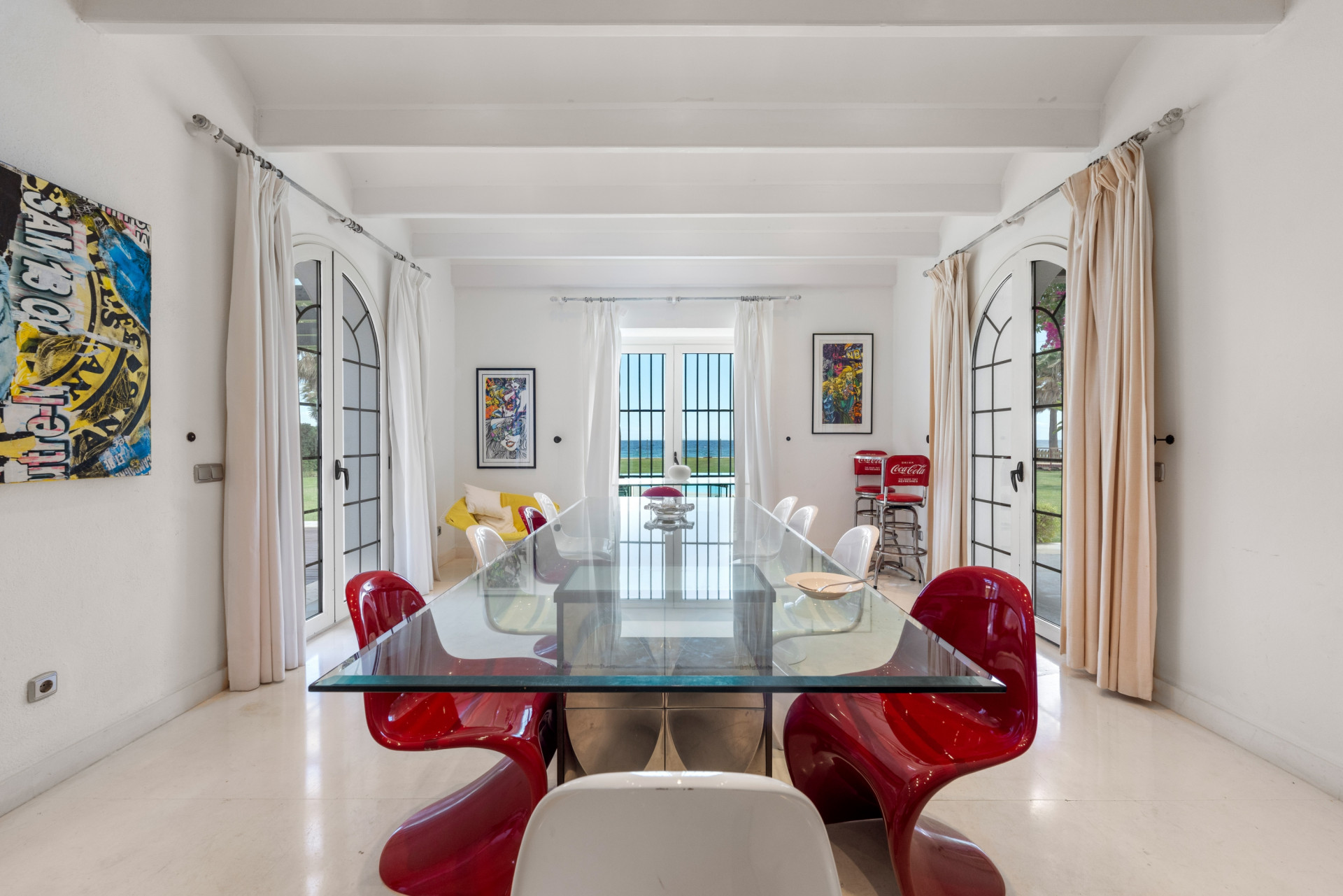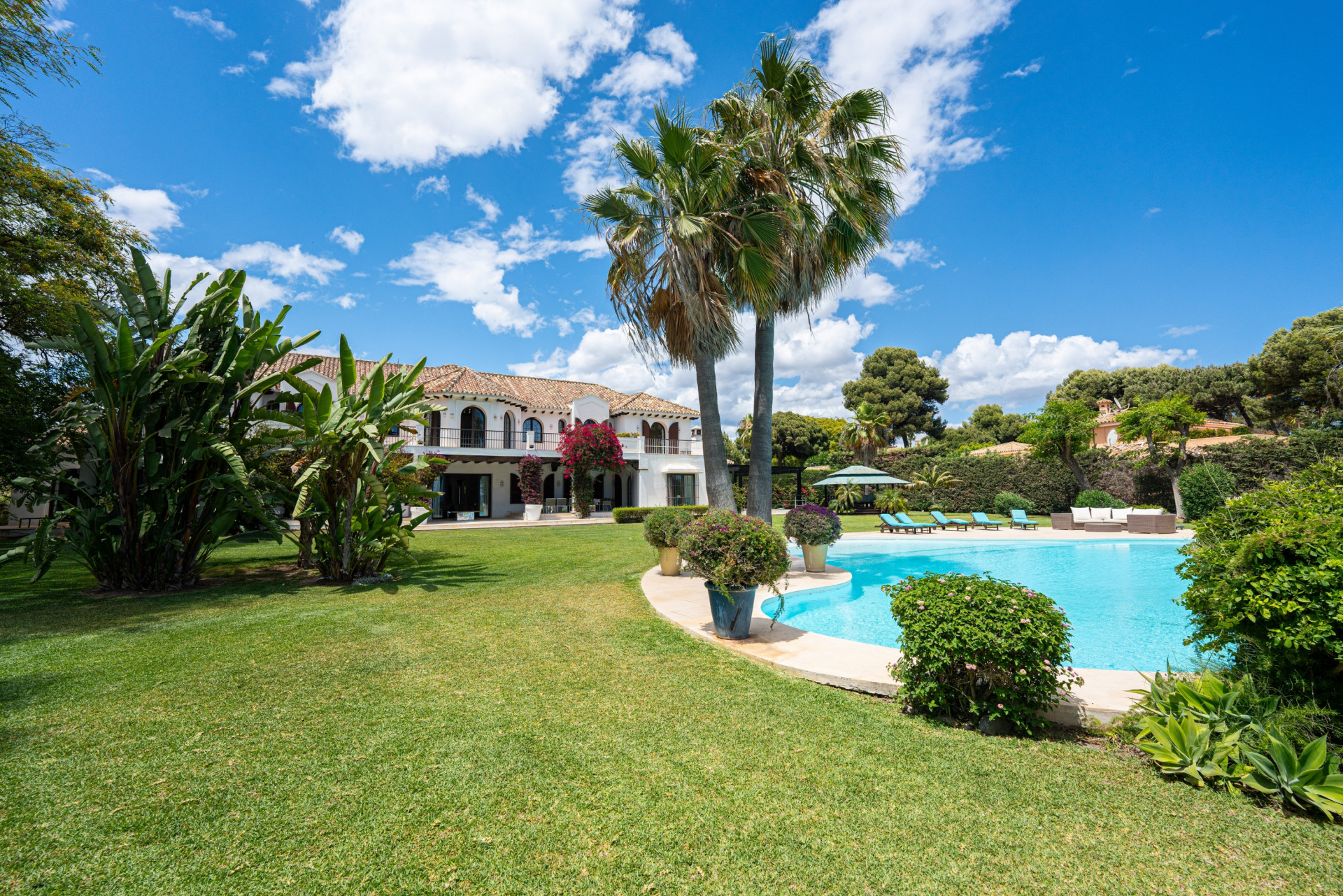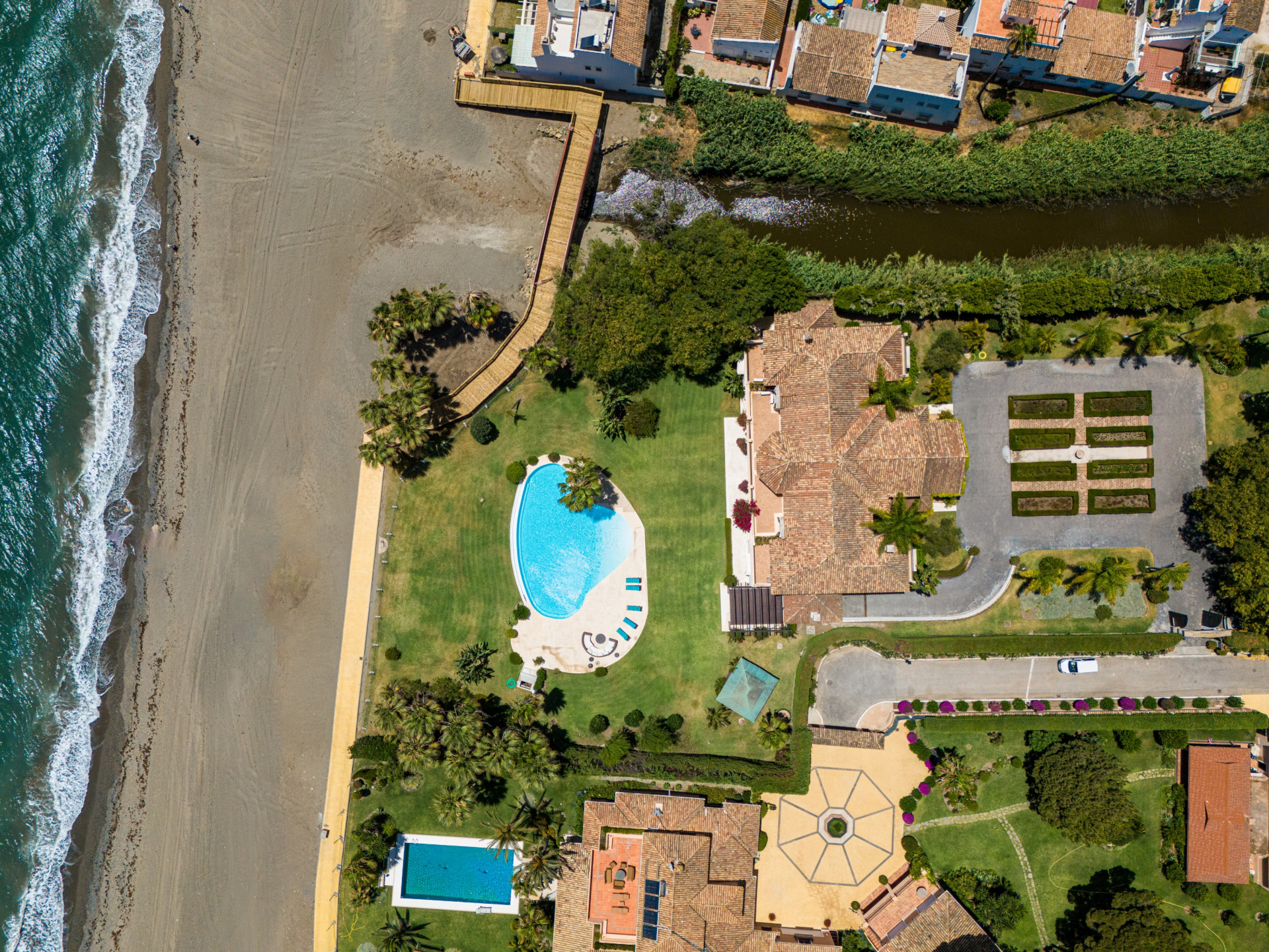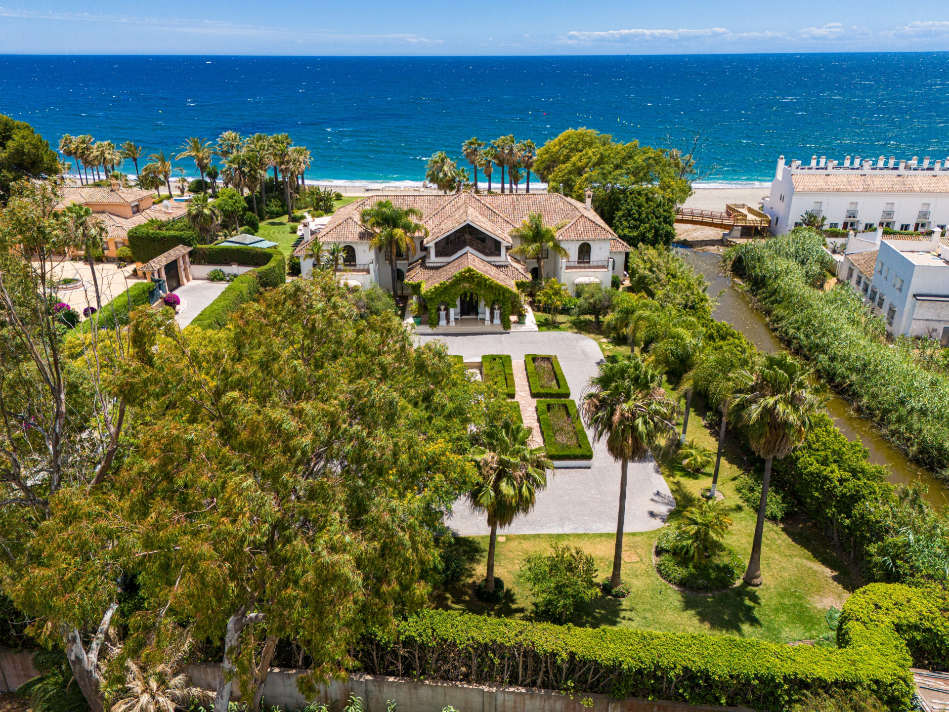 Villa, Paraiso Barronal – Ubicada en primera línea de playa en la prestigiosa New Golden Mile de Estepona, esta extraordinaria villa mediterránea ofrece nueve dormitorios, amplios espacios de vida y espectaculares vistas al mar dentro de uno de los enclaves residenciales más exclusivos de la Costa del Sol. Situada sobre una parcela de 5.828 m² y con 1.928 m² construidos más 138 m² de terrazas, la propiedad disfruta de orientación sur y ha sido concebida para aprovechar al máximo su privilegiada posición frente al Mediterráneo. Desde el momento en que se atraviesa la puerta de entrada y se accede al impresionante hall de doble altura, las vistas se abren a través de los jardines hacia el mar, marcando el carácter elegante y sereno de la residencia. La vivienda principal se distribuye en dos plantas cuidadosamente diseñadas, con amplios espacios de salón y entretenimiento que se conectan con el exterior, un comedor independiente y una cocina abierta completamente equipada. La casa dispone de 8 dormitorios, 7 baños y un aseo de cortesía, además de despacho, lavandería, zonas de almacenaje y áreas de servicio. La suite principal se concibe como un auténtico refugio privado, con un dormitorio sereno, un lujoso baño y amplios vestidores. En el nivel inferior se encuentra un garaje extraordinariamente amplio con capacidad para hasta 10 vehículos, además de espacio adicional con potencial para crear una sala de cine, sala de juegos, alojamiento para personal o zonas de ocio y bienestar. Las zonas exteriores son igualmente impresionantes. Los jardines paisajísticos rodean la piscina privada y amplias terrazas, creando un entorno perfecto para disfrutar del estilo de vida mediterráneo, relajarse al sol o celebrar reuniones al aire libre. La propiedad se presenta en buen estado, con mobiliario opcional, e incorpora numerosos detalles de estilo mediterráneo como suelos de mármol y terracota tradicional, techos con vigas de madera, amplios armarios empotrados y elegantes puertas francesas. Entre sus prestaciones destacan aire acondicionado, calefacción central, doble acristalamiento, Wi-Fi, TV satélite, depósito de agua y sistema de alarma. Una oportunidad excepcional para adquirir una villa en primera línea de playa en la New Golden Mile, combinando privacidad, amplitud y carácter mediterráneo a pocos minutos de Marbella, Estepona y Puerto Banús.