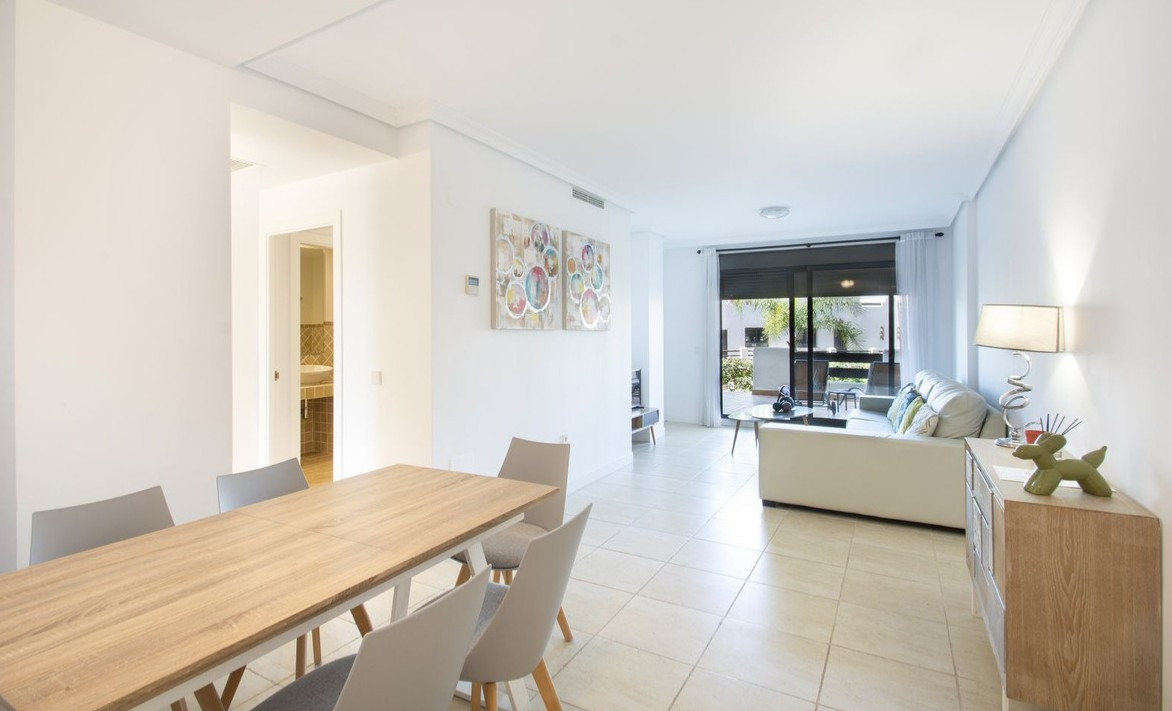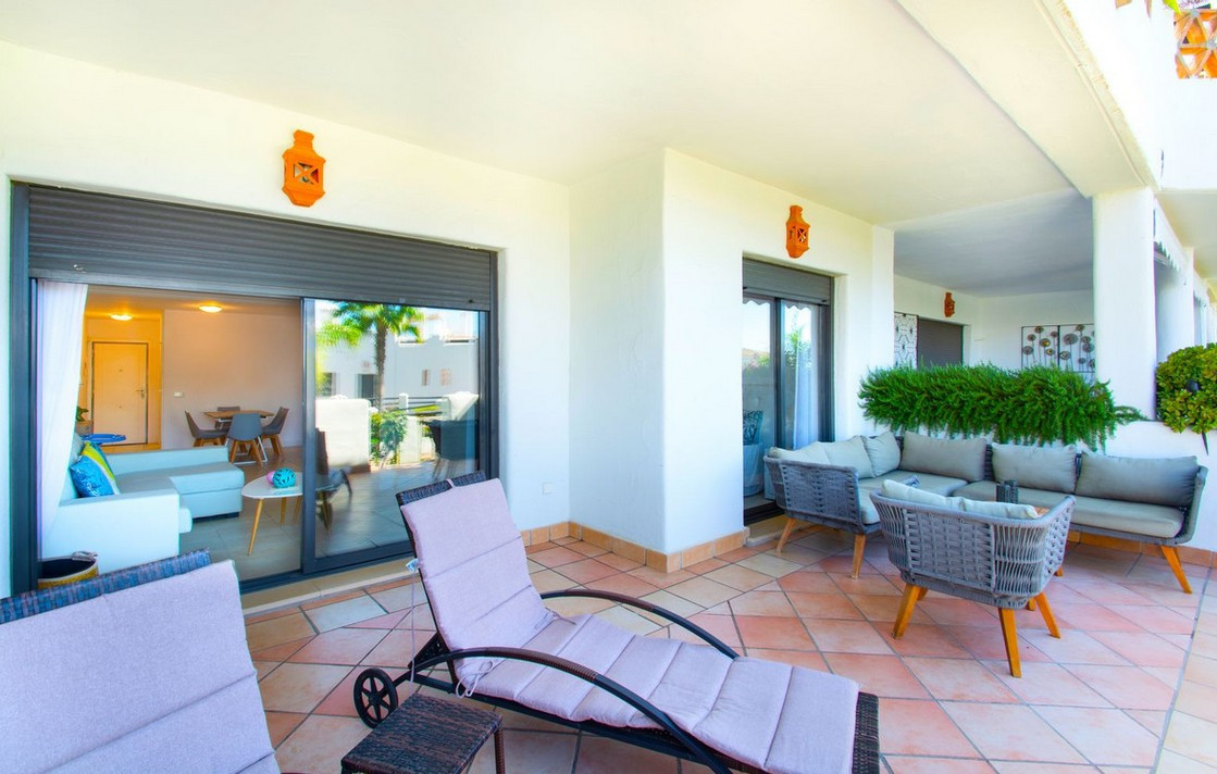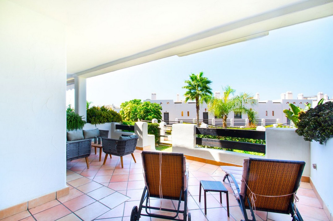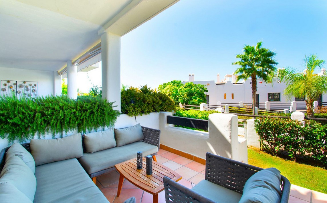 Apartamento Planta Baja, Selwo – ¡Fantástico apartamento en la Nueva Milla de Oro, Estepona! Precioso apartamento en planta baja. Dispone de 2 dormitorios y dos baños, el principal con baño en suite. Desde el dormitorio secundario se accede a la terraza, que ofrece unas preciosas vistas al mar. Desde el dormitorio principal se accede a la terraza principal, que a su vez da acceso al jardín privado. Amplia cocina totalmente equipada con acceso a la terraza con vistas al mar. Amplio salón-comedor con acceso a la terraza principal y al jardín. La propiedad incluye una plaza de aparcamiento subterráneo y un trastero. Comunidad con preciosos jardines, seguridad 24 horas y piscina comunitaria.