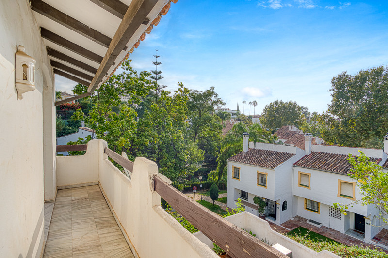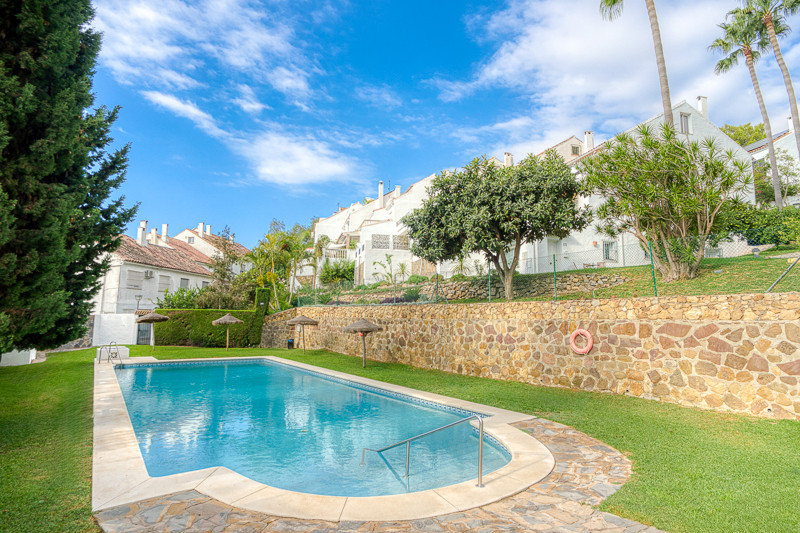 Adosado, El Capricho – Esta encantadora casa adosada de tres dormitorios, orientada al sur, se encuentra en una prestigiosa urbanización cerrada en la Milla de Oro de Marbella, con amplios jardines tropicales y dos piscinas comunitarias. Con una ubicación ideal a poca distancia a pie de la playa, bares y restaurantes, y a un corto trayecto en coche del centro de Marbella y Puerto Banús, la propiedad combina comodidad y encanto. La planta baja cuenta con un luminoso salón-comedor con chimenea y acceso a una amplia terraza perfecta para comer al aire libre, una cocina independiente recién reformada y un aseo de cortesía. Unas escaleras conducen a un amplio sótano, actualmente utilizado como dormitorio y estudio de arte, con baño propio. En la planta superior, la suite principal se complementa con dos dormitorios de invitados y un baño familiar. Otros detalles destacados incluyen armarios empotrados, suelos de mármol y aparcamiento privado para un coche.
