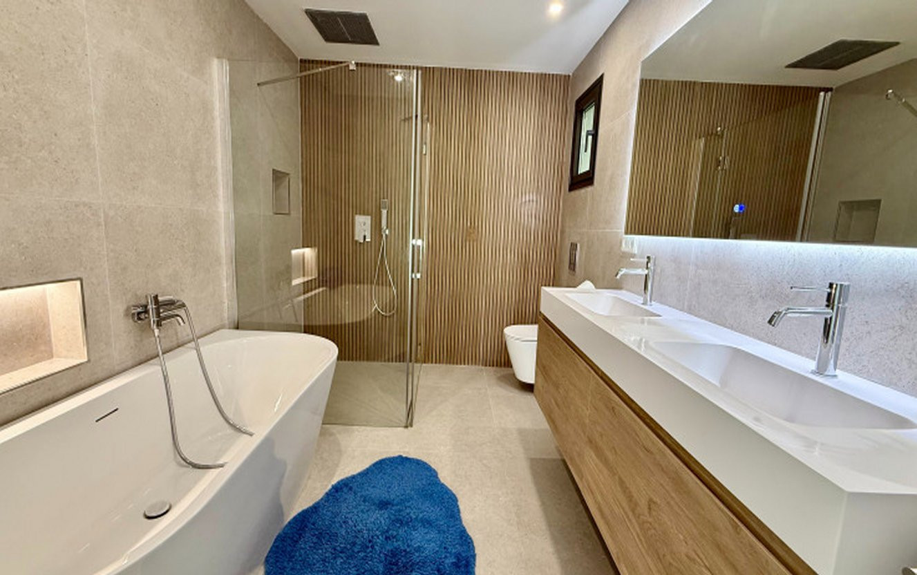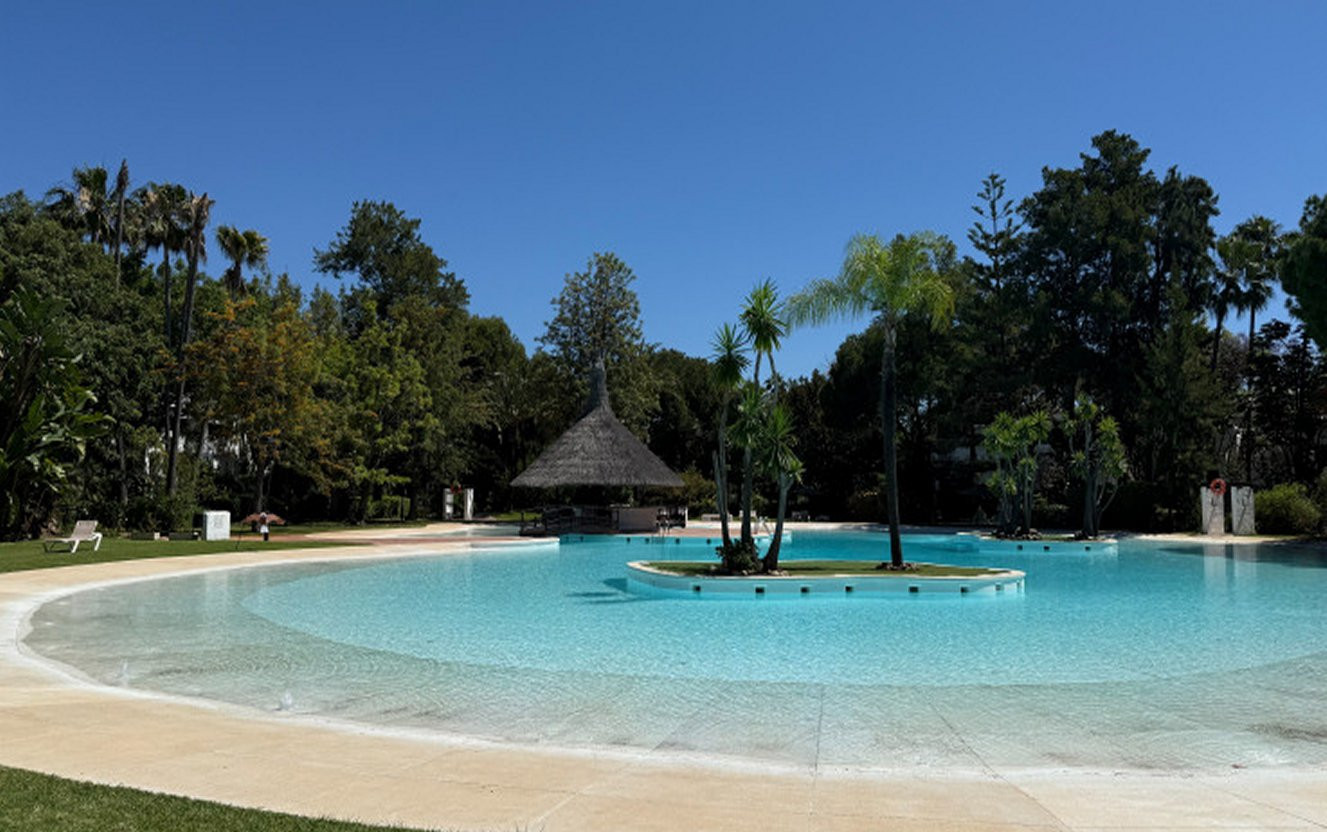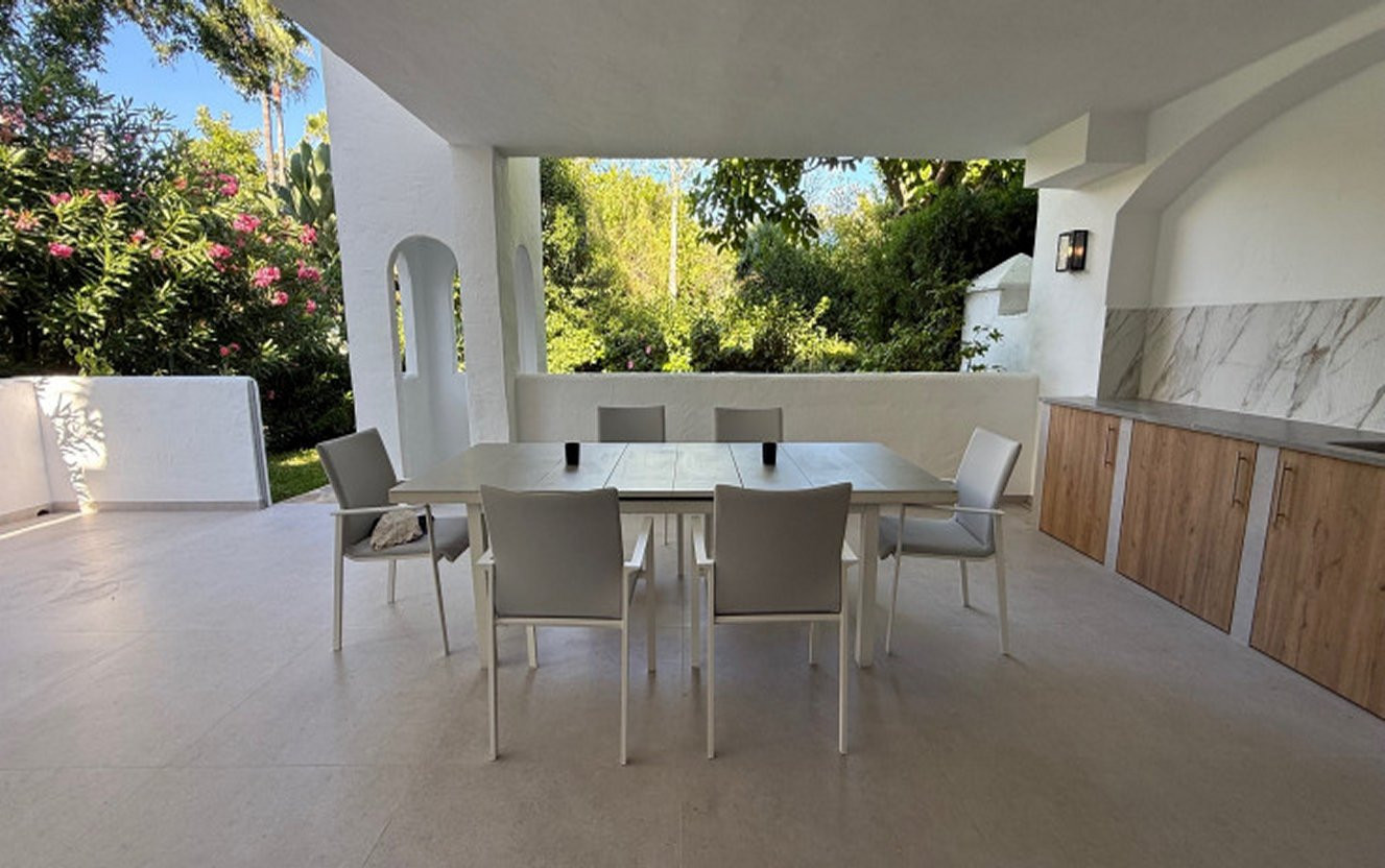 Apartamento Planta Baja, Alhambra del Golf – Esta elegante residencia se encuentra en una de las urbanizaciones más codiciadas de Guadalmina, ofreciendo un entorno único rodeado de exuberantes jardines tropicales. La comunidad cuenta con un excepcional complejo de piscinas con restaurante propio, creando un ambiente vacacional durante todo el año. El apartamento ha sido completamente renovado con una exquisita atención al detalle y equipado con acabados de alta gama para el máximo confort. Una moderna cocina de diseño con electrodomésticos de alta gama, tres luminosos dormitorios, dos baños contemporáneos y una sala multiusos adicional ofrecen un amplio espacio para la vida familiar. El espacioso salón-comedor se abre directamente a una soleada terraza, que conecta a la perfección con un jardín privado con cocina al aire libre, perfecto para recibir invitados o relajarse en la intimidad. Otras características de lujo incluyen calefacción por suelo radiante en los baños, aire acondicionado regulable y persianas eléctricas. Combinando elegancia, funcionalidad y encanto mediterráneo, este apartamento es ideal como vivienda familiar o como un lujoso refugio vacacional en una de las zonas costeras más codiciadas de Marbella.