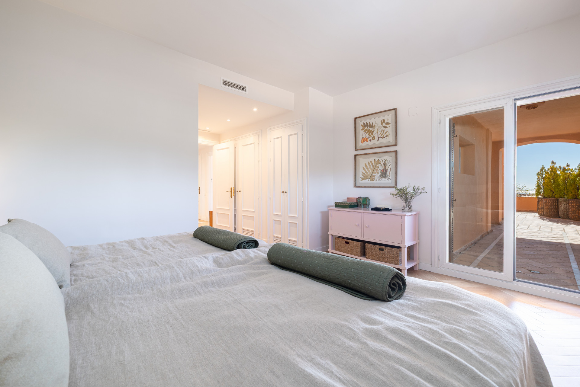 Apartamento Planta Baja, Nueva Andalucia – Apartamento en planta baja elevada, totalmente reformado, situado en La Cerquilla, una de las zonas residenciales más consolidadas y cotizadas de Nueva Andalucía, dentro de la urbanización cerrada de Les Belvedere’s. La propiedad ofrece una superficie construida de 215 m² y cuenta con tres dormitorios, dos baños con calefacción por suelo radiante y un aseo de cortesía. La distribución es excelente, comenzando con un amplio recibidor que garantiza privacidad respecto a las zonas de estar principales. El espacioso salón-comedor-cocina de planta abierta proporciona un ambiente luminoso y funcional con acceso directo a la terraza. Una de las características más destacadas de la propiedad es su impresionante terraza de 90 m² orientada al sur, que ofrece un amplio espacio para un comedor, zona de estar y tumbonas. La terraza disfruta de vistas panorámicas al mar Mediterráneo, la vegetación circundante, Gibraltar y la costa africana. A diferencia de muchas otras viviendas de la urbanización, que requieren subir numerosas escaleras y no disponen de ascensor, este apartamento cuenta con un fácil acceso sin escalones directamente desde la puerta principal, lo que lo hace especialmente práctico y cómodo. La urbanización cerrada ofrece seguridad las 24 horas, piscina exterior con vistas al mar, pistas de pádel, gimnasio y sauna. La Cerquilla se encuentra en pleno corazón del prestigioso Valle del Golf de Nueva Andalucía, cerca de varios campos de golf de renombre, colegios internacionales, restaurantes y Puerto Banús. La propiedad es ideal como residencia habitual, casa de vacaciones o inversión en una ubicación privilegiada de Marbella.