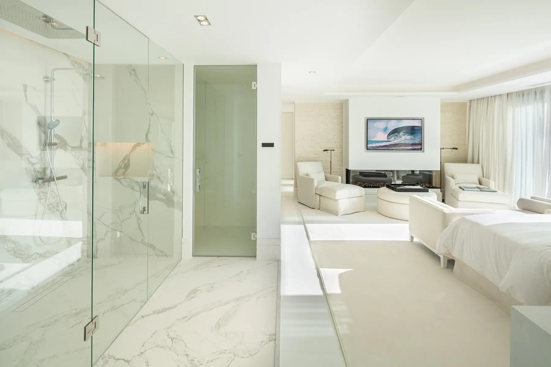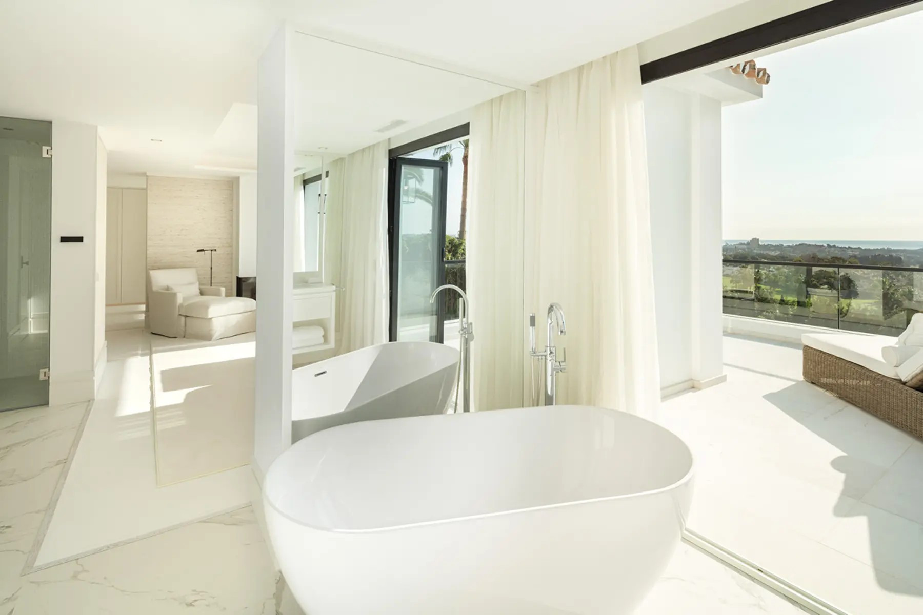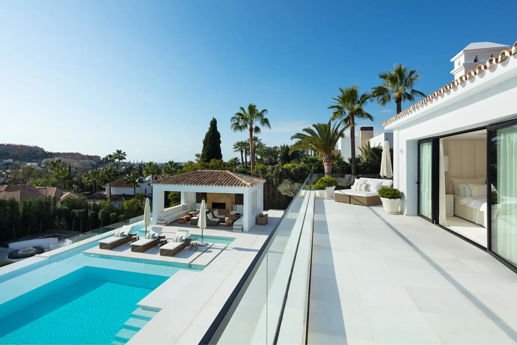 Вилла, La Cerquilla – An exceptional family home nestled in the exclusive enclave of Nueva Andalucia. This three-level residence offers spectacular views of the Mediterranean Sea and is surrounded by lush greenery, ensuring privacy and tranquility. The property’s outdoor spaces are a masterpiece, featuring an infinity pool with a sunken chill-out area, a pergola with a fireplace and numerous strategically placed chill-out areas. The expansive plot includes an extravagant garden, a private padel court and an al fresco dining space with a barbecue, all accessible via a private driveway for added convenience and security. Step inside to experience the seamless blend of Mediterranean architecture with a modern twist. The interiors are a testament to elegance and attention to detail, with a formal living area leading to an open-plan layout for informal living, dining and a modern kitchen. The kitchen boasts state-of-the-art appliances, ample storage and a central island, all with breathtaking views of the sea. Features four large ensuite bedrooms, each meticulously decorated, while the grand master bedroom steals the spotlight with a fireplace, walk-in closet and a luxurious bathroom with a shower, standalone tub and double vanity. The master bedroom offers direct terrace access, providing residents with unparalleled views and added luxury. Beyond the exquisite living spaces, elevates the standard of living with bespoke amenities. Residents can indulge in a home cinema, a treatment room and a SPA that includes a jacuzzi, Turkish bath, and sauna. This residence is not just a home; it’s a sanctuary where elegance meets functionality.