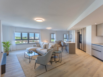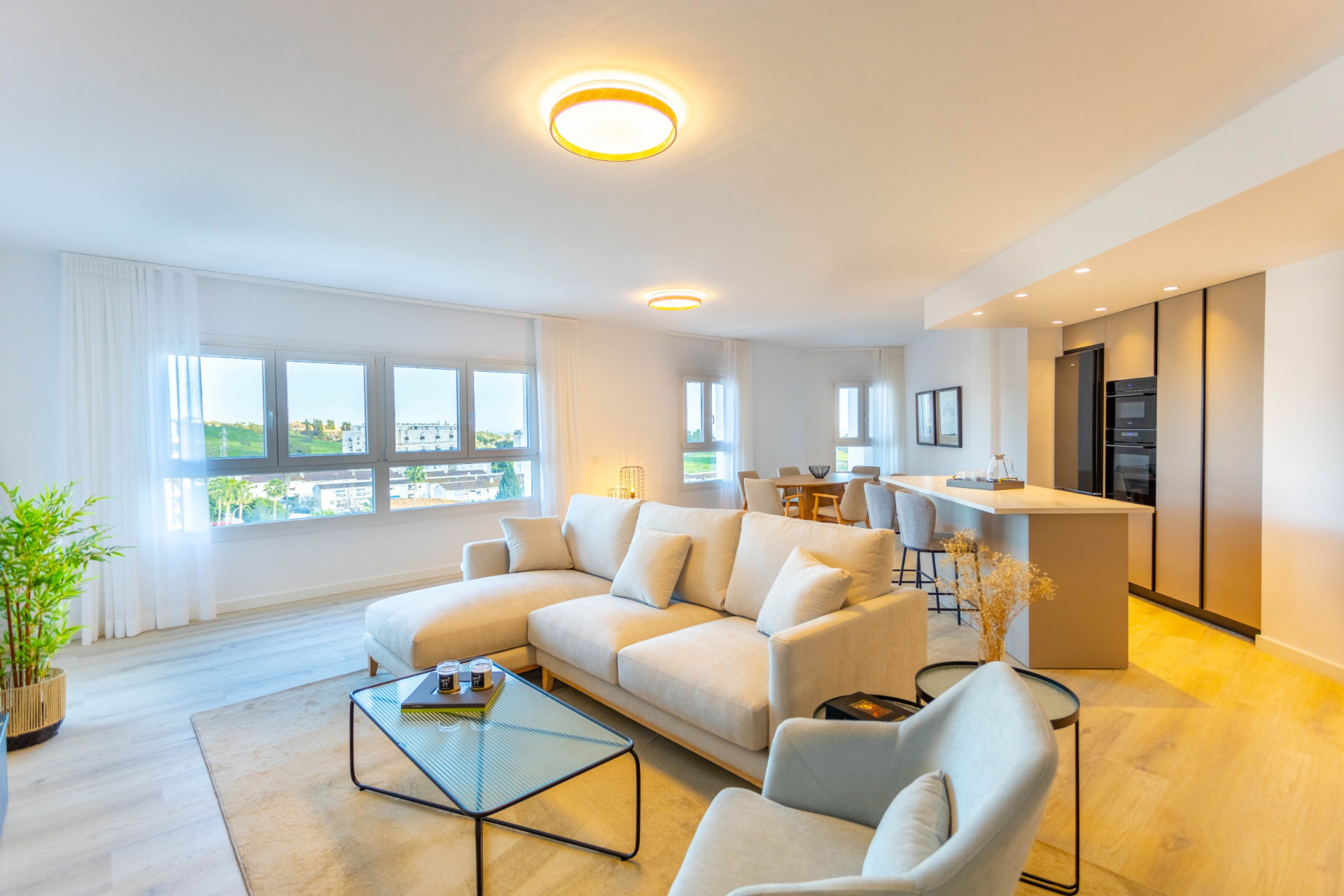Апартамент, La Campana – Discover this brand-new, key-ready 4-bedroom apartment in Nueva Andalucía. Situated on the 6th floor, this modern home offers the perfect blend of contemporary design, comfort, and a prime location. From its spacious 14 m² terrace, enjoy breathtaking views of La Concha Mountain and the Mediterranean Sea. The east-facing orientation ensures spectacular sunrises and warm morning light throughout the home. This apartment is for sale fully furnished and beautifully decorated by Rosalia Olvera of Marbella Interior Design in an elegant Boho style, creating a cozy yet sophisticated ambiance. The luxury kitchen, designed by Nova Kitchen Concept, features high-end Pando appliances and a stylish central island, combining aesthetics with functionality. The apartment is well-equipped with hot and cold air conditioning using an inverter heat pump, hot water system with Aerothermal technology, energy efficiency rating A/B, an electronic video intercom, and fiber optic installation at the entrance of the home. Prime Residential Location: Situated in a quiet and well-connected area, you’ll have supermarkets, restaurants, schools, and sports facilities just minutes away. Plus, you can walk or bike to Puerto Banús and the beach via a scenic riverside path.